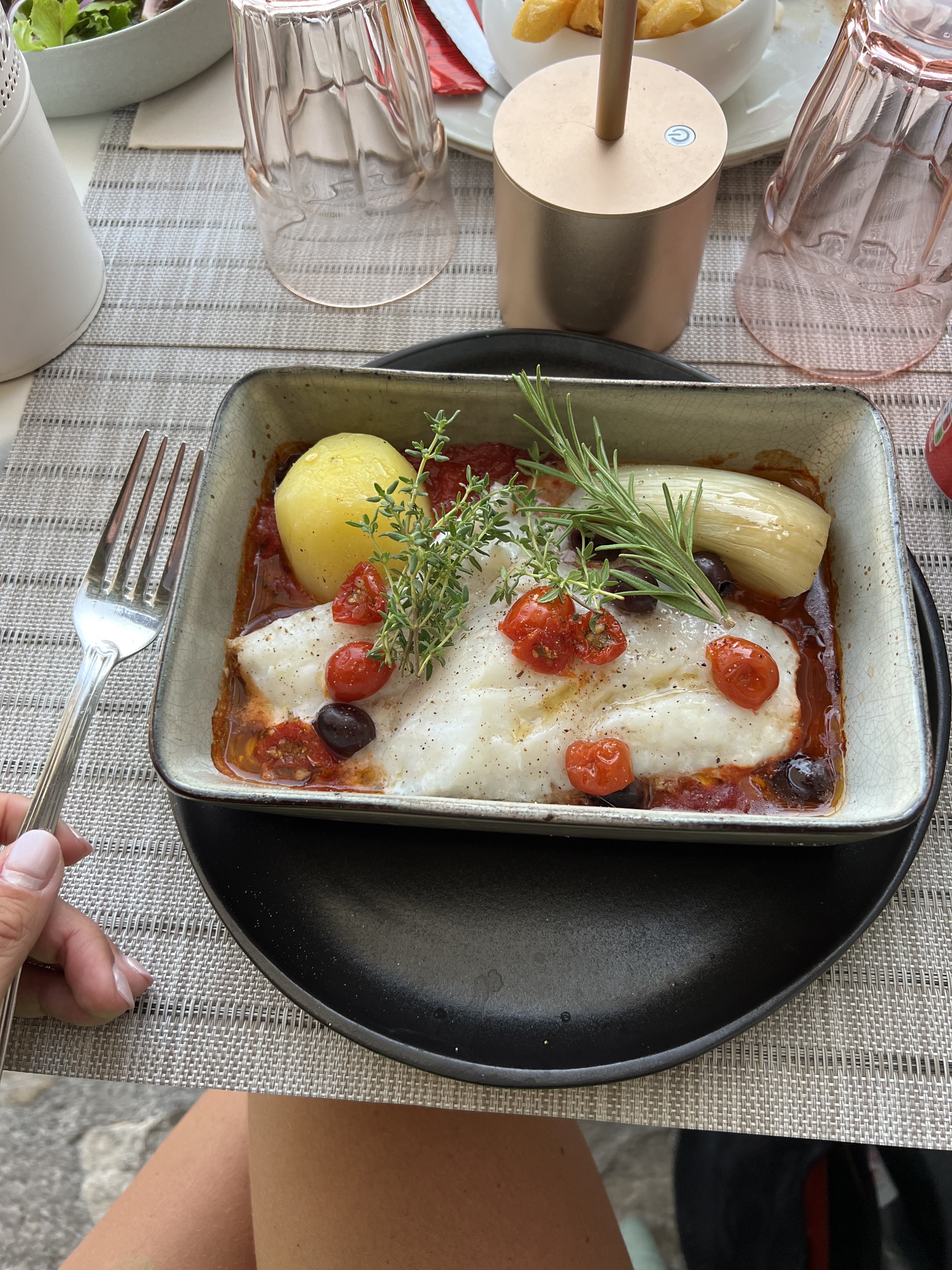 Produits super frais et très bien préparés. Tomates mûres à point qui n'ont jamais vu un frigo 😋 accompagnées d'une bonne burrata . Un dos de cabillaud bien frais avec des légumes et herbes provençales. Je recommande