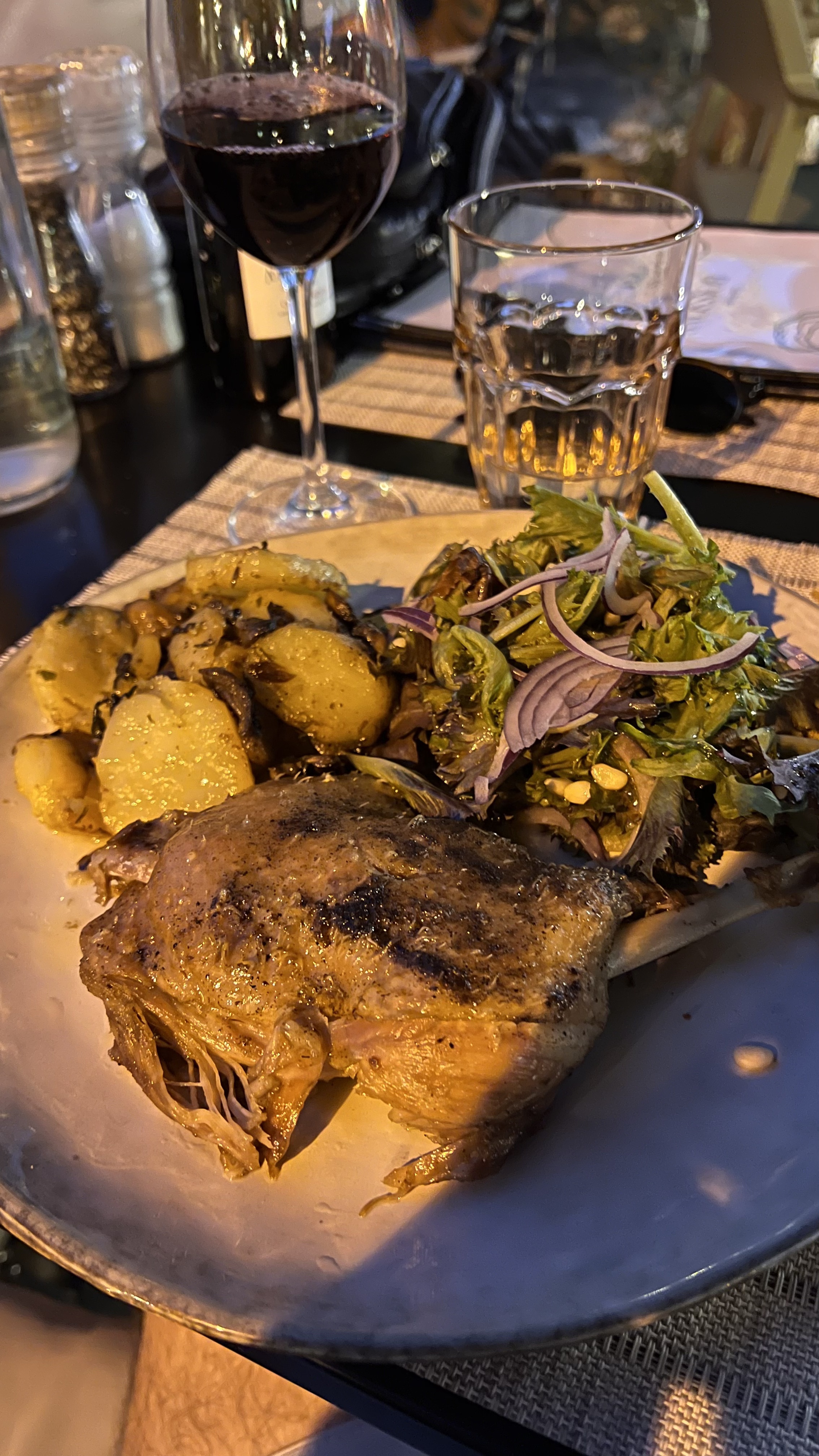 Ce restaurant, situé dans l'endroit le plus pittoresque de Saint-Paul de Vence, est connu pour sa vue imprenable. Lorsque je me suis assis à une table extérieure, ils m'ont gentiment informé qu'il faudrait environ 30 à 40 minutes pour que la nourriture soit servie. Alors, tout en profitant du magnifique paysage, j'ai décidé de passer le temps en sirotant ma bière. Juste un avertissement, si vous n'êtes pas du genre patient, ce n'est peut-être pas l'endroit pour vous. Le steak était un peu dur, mais les oignons sautés ajoutaient une touche de saveur qui compensait le tout. Le canard était incroyablement tendre et la salade était vraiment remarquable ! Je le recommande fortement.