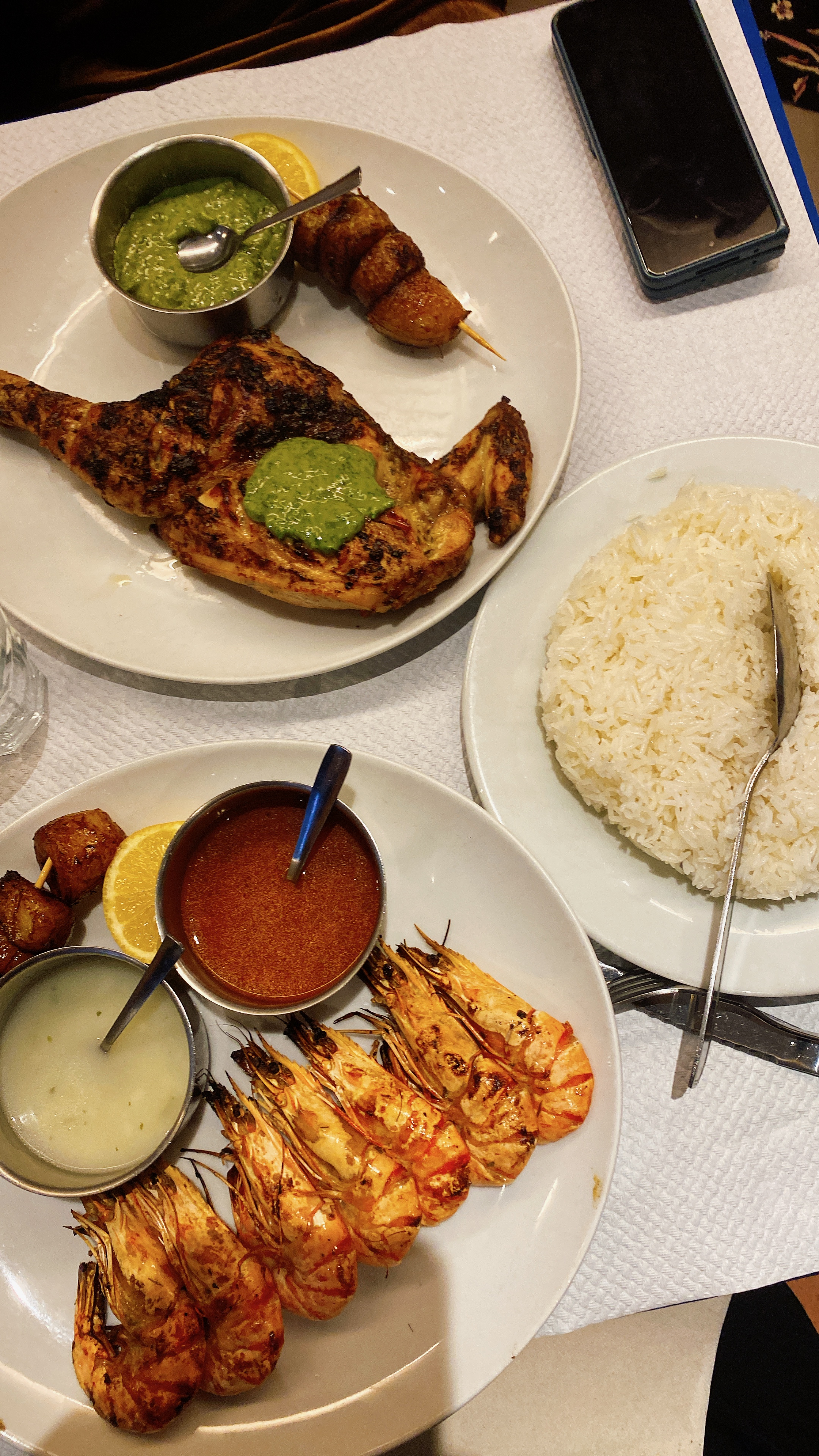 Accueil standard. Personnel dans l ensemble souriant mais barrière de la langue le serveur ne comprend pas toujours les demandes. J ai pris les gambas, elles étaient bonnes. Mon frère a pris le poulet, il était bon mais sec! La sauce verte rattrape tout. Le repas est copieux. Trop cher pour ce que c est .25 e pour 7 gambas quatre rondelles de banane et une bonne part de riz je dis non.mais en plein centre de Paris...le poulet était à 19 e