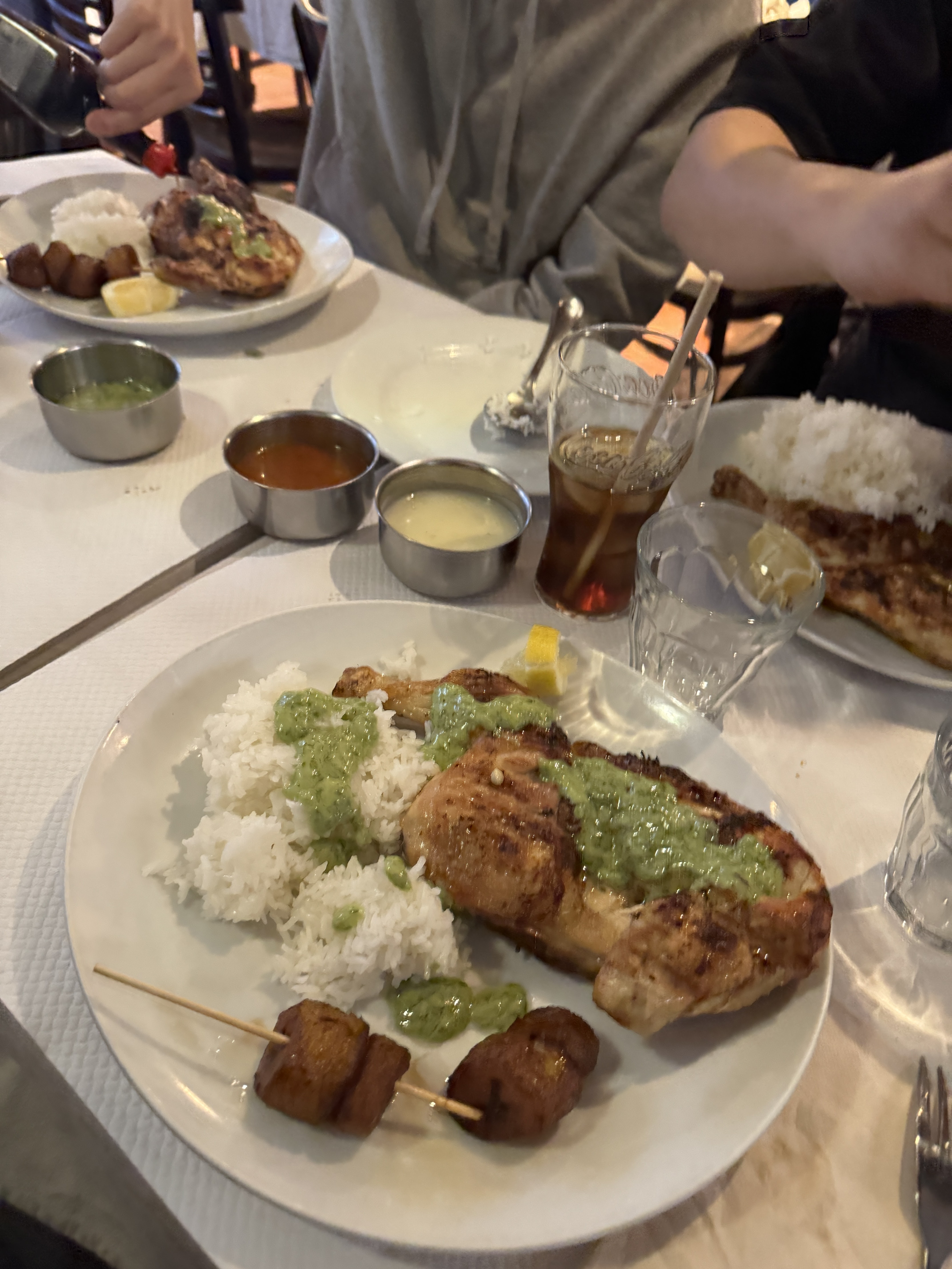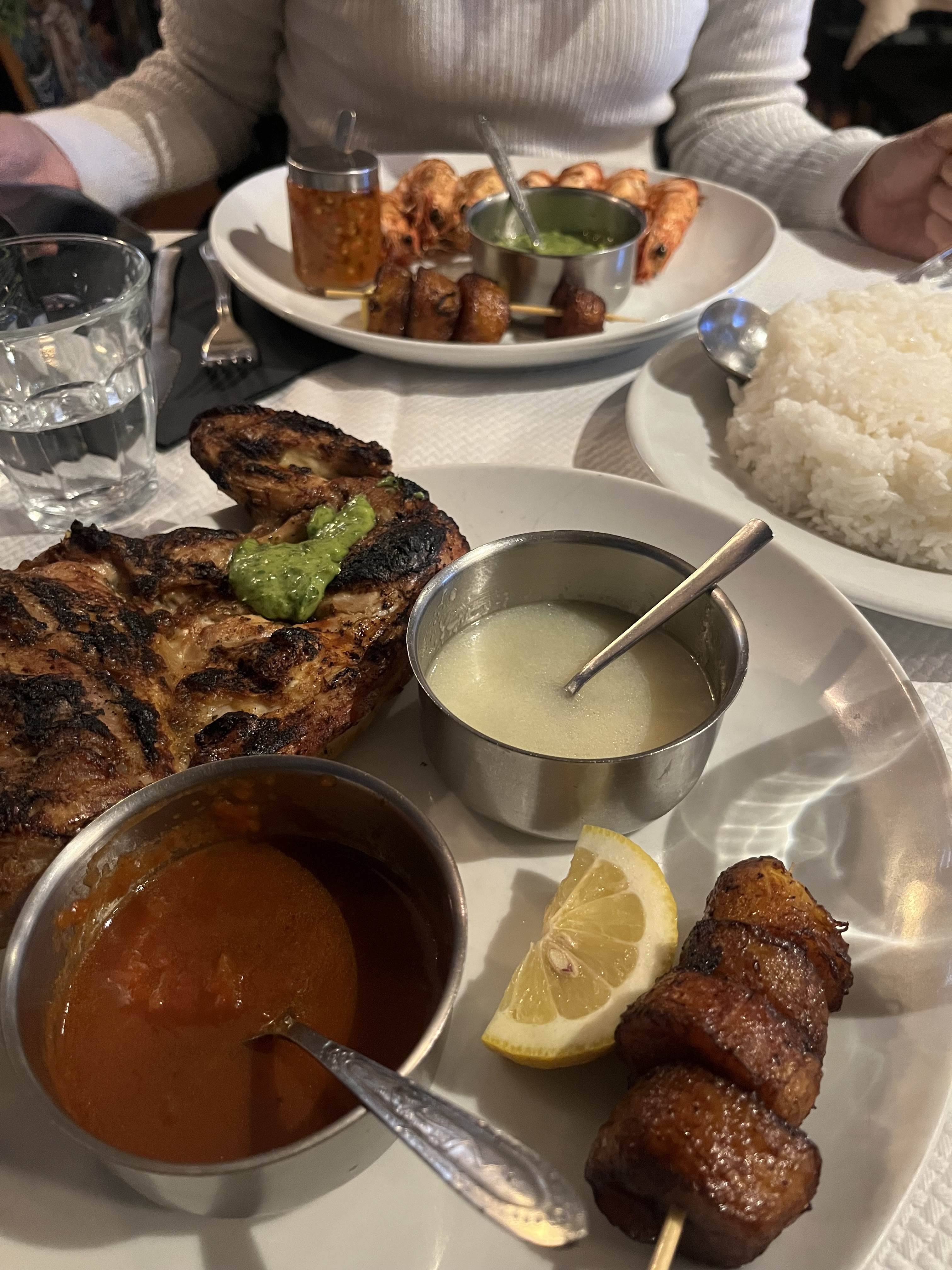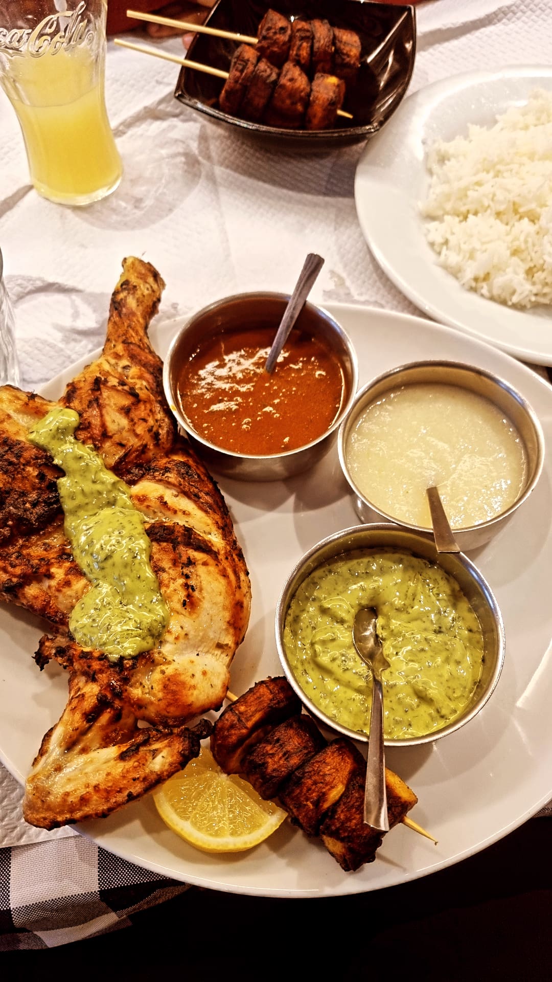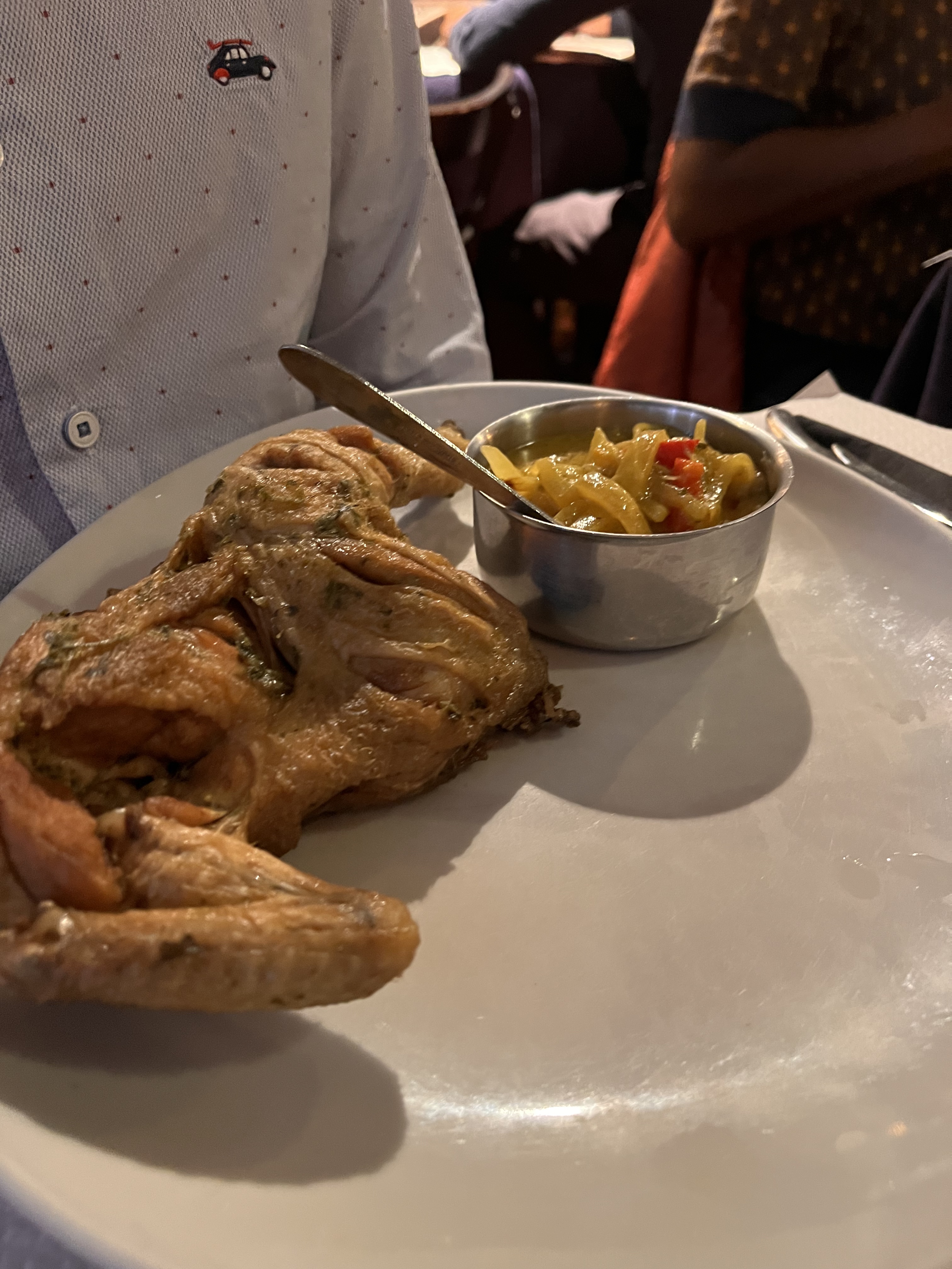 🙂Point positif : Cadre sympa. Le serveur africain est aux petits soins. Dessert correct. 😡Points négatifs : le poulet braisé pas assez cuit (pour gagner du temps ?). Même la peau du poulet manque de cuisson. Presque cru à l'intérieur ! Les 3/4 des serveurs sont des indiens désagréables, y compris les cuisiniers. Pour moi ça casse l'ambiance. Les prix sont très élevés par rapport à la qualité.