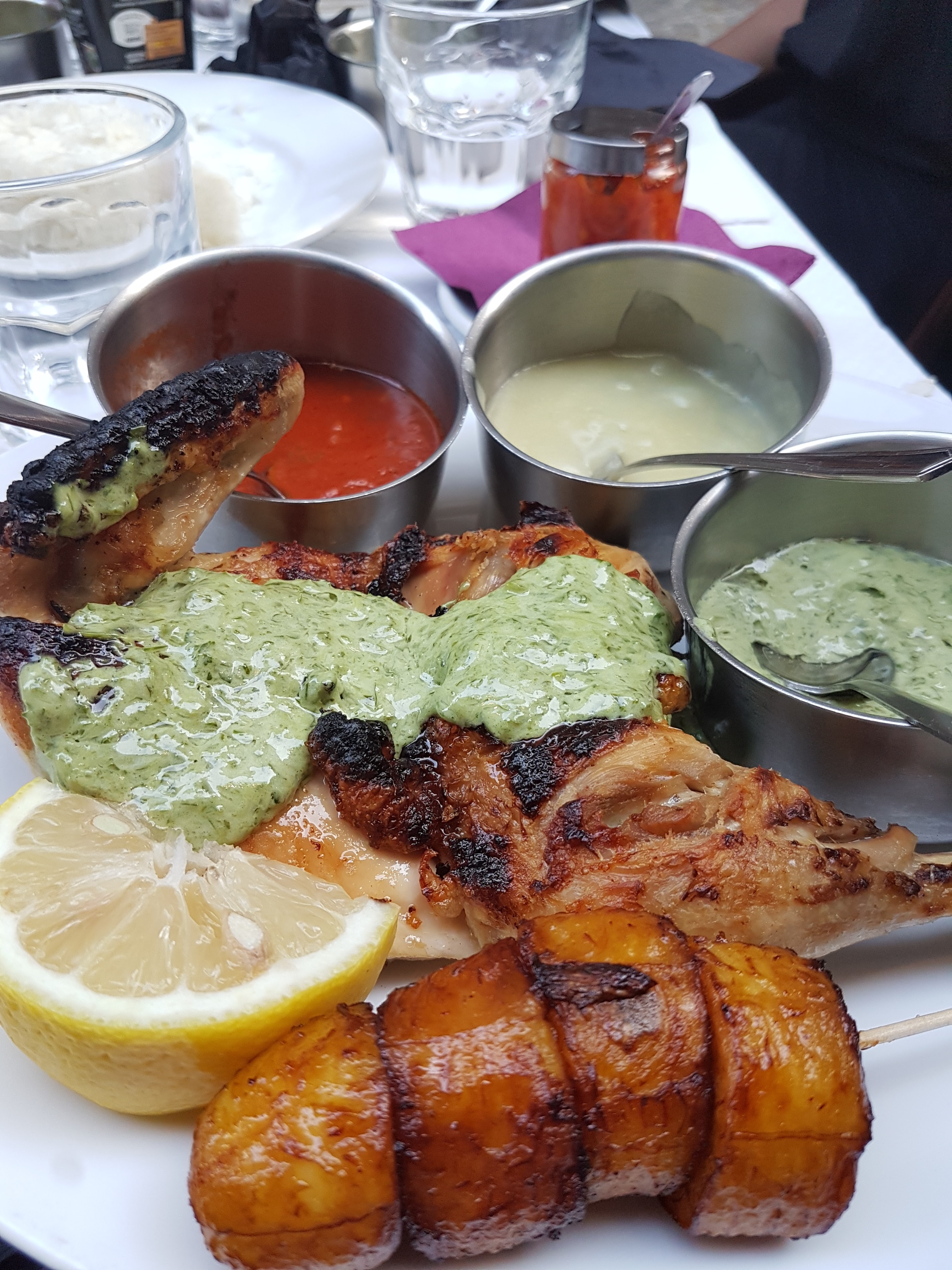 Une poulet un peu sec et pas décortiqué, du riz, peu de bananes plantains et une sauce 19€. Je trouve que l’ensemble est un peu cher