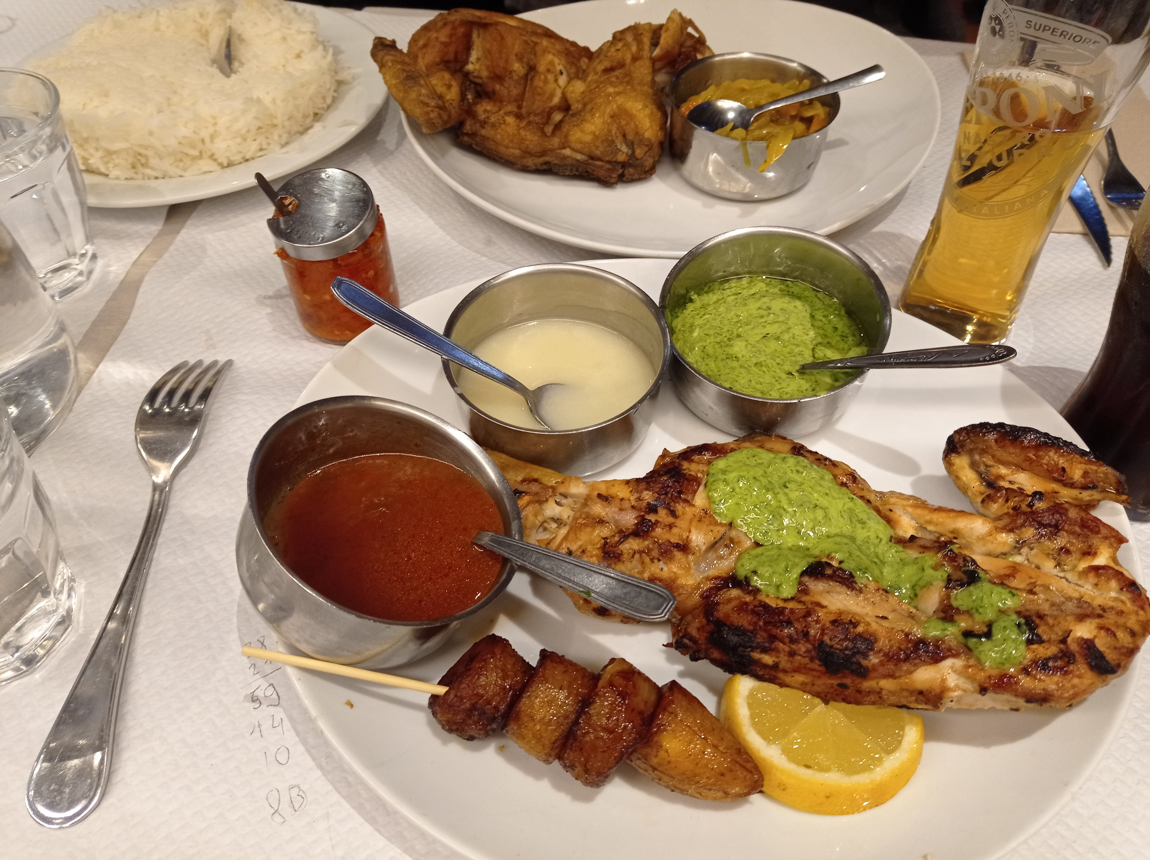 Diner en semaine. Spécialité poulet braisé. Une demi poulet, servi avec 3 sauces, du riz et des bananes frits. Un bon ! Grande salle, peut convenir à un grand groupe. Bon rapport qualité prix 19€ le poulet.