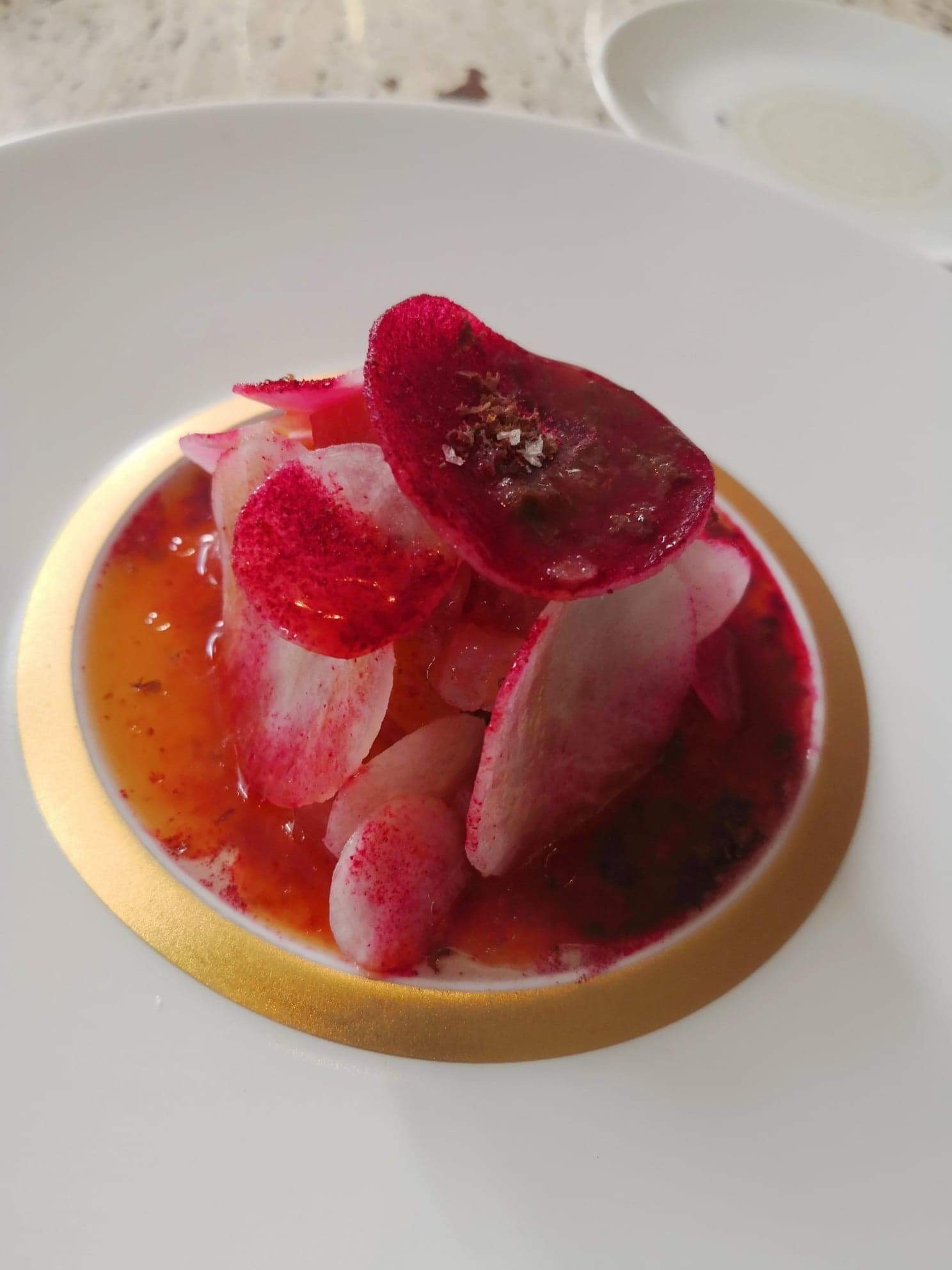 Les plats : certains plats sont plus maitrisés que d’autres. Mon top 2 : l’anguille et la Saint-Jacques, un vrai régal pour les papilles. Belle découverte pour le dessert à base de betteraves. Service : nous avions une serveuse très impliquée et qui décrivait avec passion et précisions les plats . Le lieu : agréable, avec une décoration vintage. Nous étions placés en face de la cuisine ouverte ce qui fut un réel plaisir mais 1er bémol, entendre le chef crier sur l’un de ses cuisiniers nous a gâché une partie du repas. Ce qui se passe en cuisine doit rester en cuisine et le client ne doit pas être témoin de cela. 2eme bémol de la soirée, le serveur/sommelier, a eu une altercation avec un autre serveur, encore une fois, nous avons été témoin de cette scène (portes ouvertes à coups de pieds…), l’énervement de cet employé était communicative et faisait régnait une ambiance pesante. 3eme bémol, l’attente entre chaque plat était interminable même si on peut noter que le début de service était plus fluide. En résumé, la nourriture était bonne même si certains plats étaient moins maîtrisés que d’autres. Après un ou 2 réglages sur l’’assaisonnement m, j’en suis sûre que tout sera parfait. Je déplore quand même l’attitude de certains employés qui a contribué à mettre une mauvaise ambiance communicative. Décevant pour un restaurant étoilé. Je recommande quand même les plats de ce restaurant. Je vous souhaite une bonne continuation.