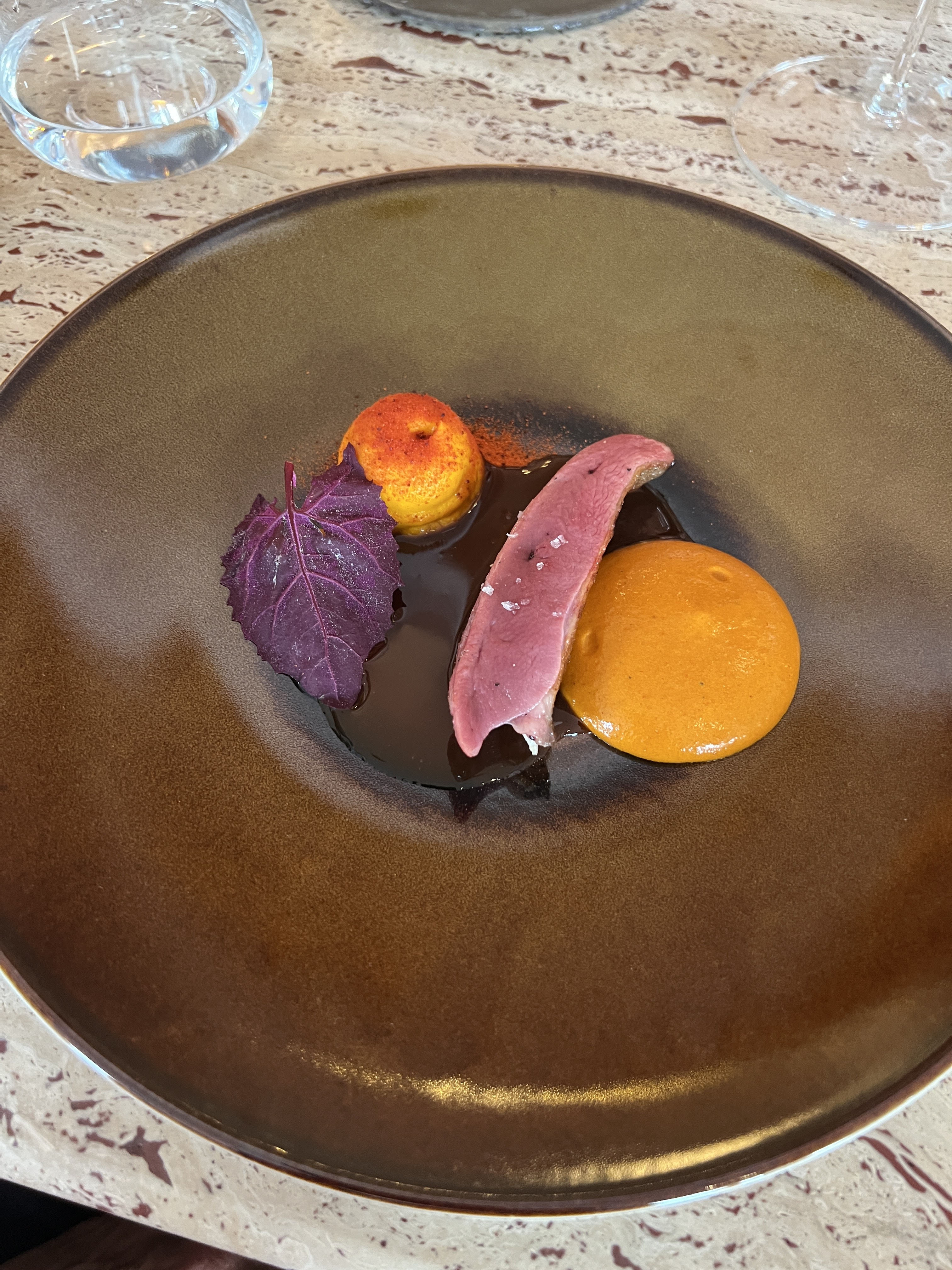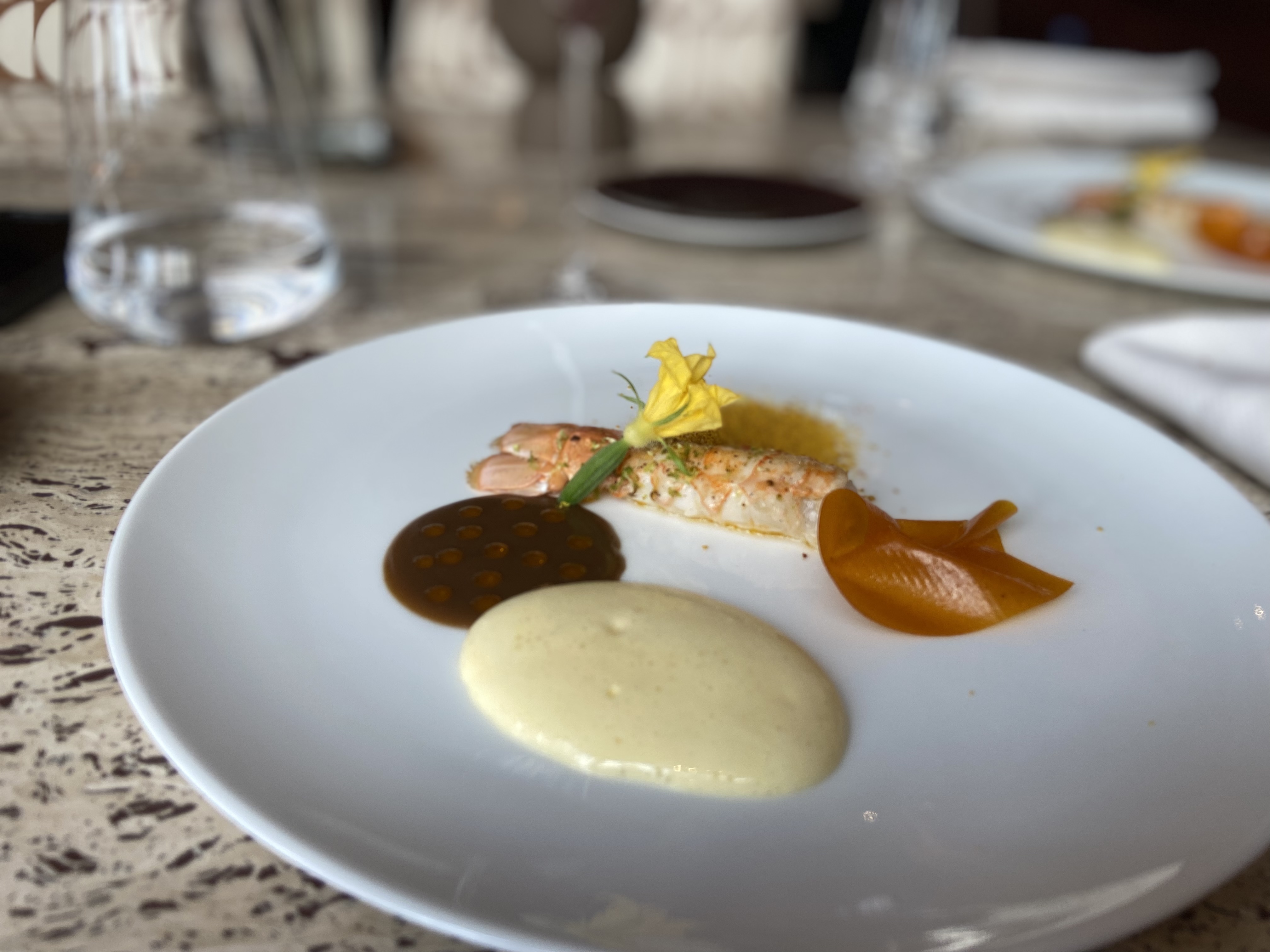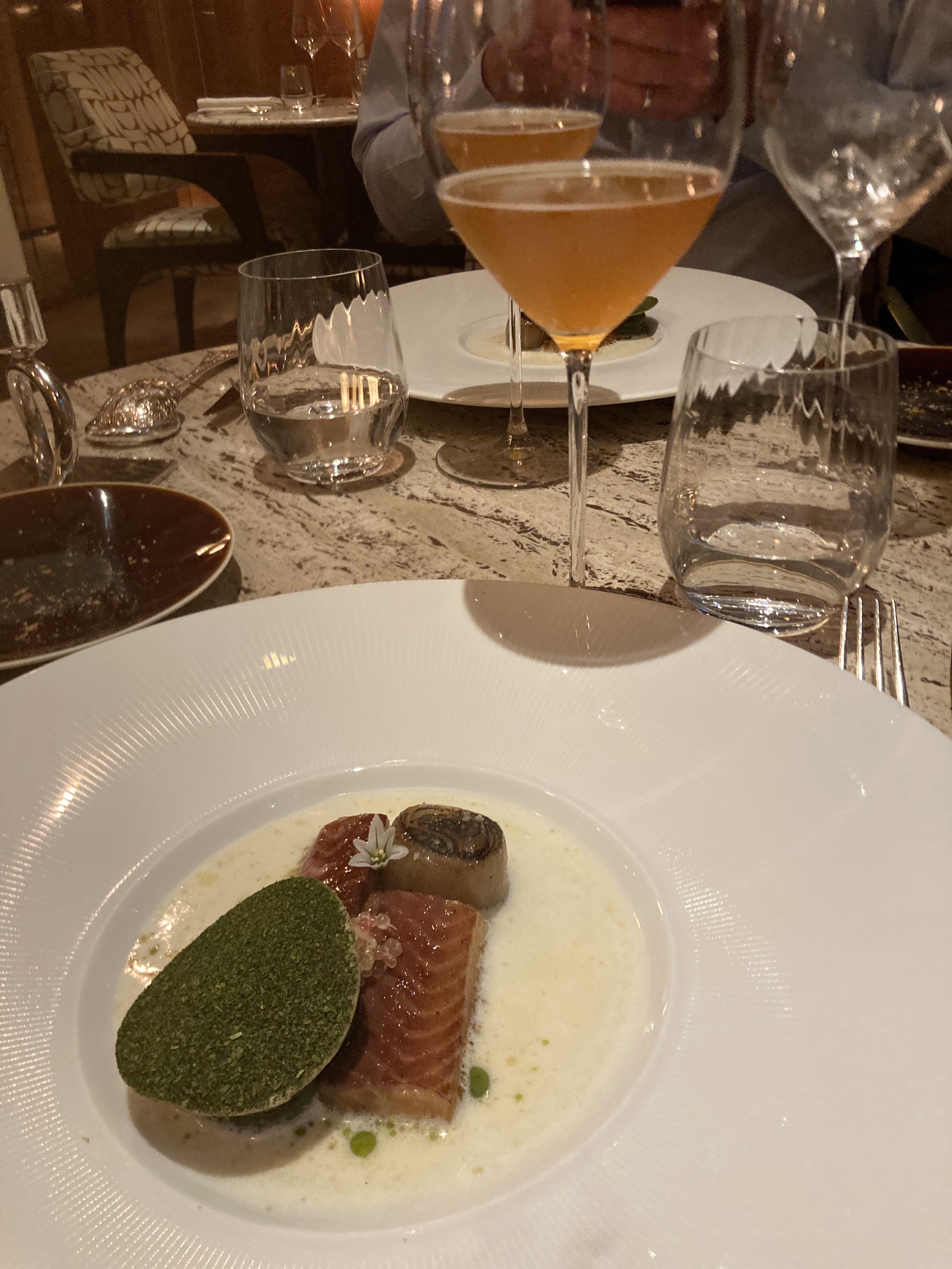 Très belle expérience, un magnifique restaurant décoré avec goût, nous avions pris le menu déjeuner avec des petites portions, des serveurs très agréables et au petit soin (l’eau plate en carafe était cependant payante).