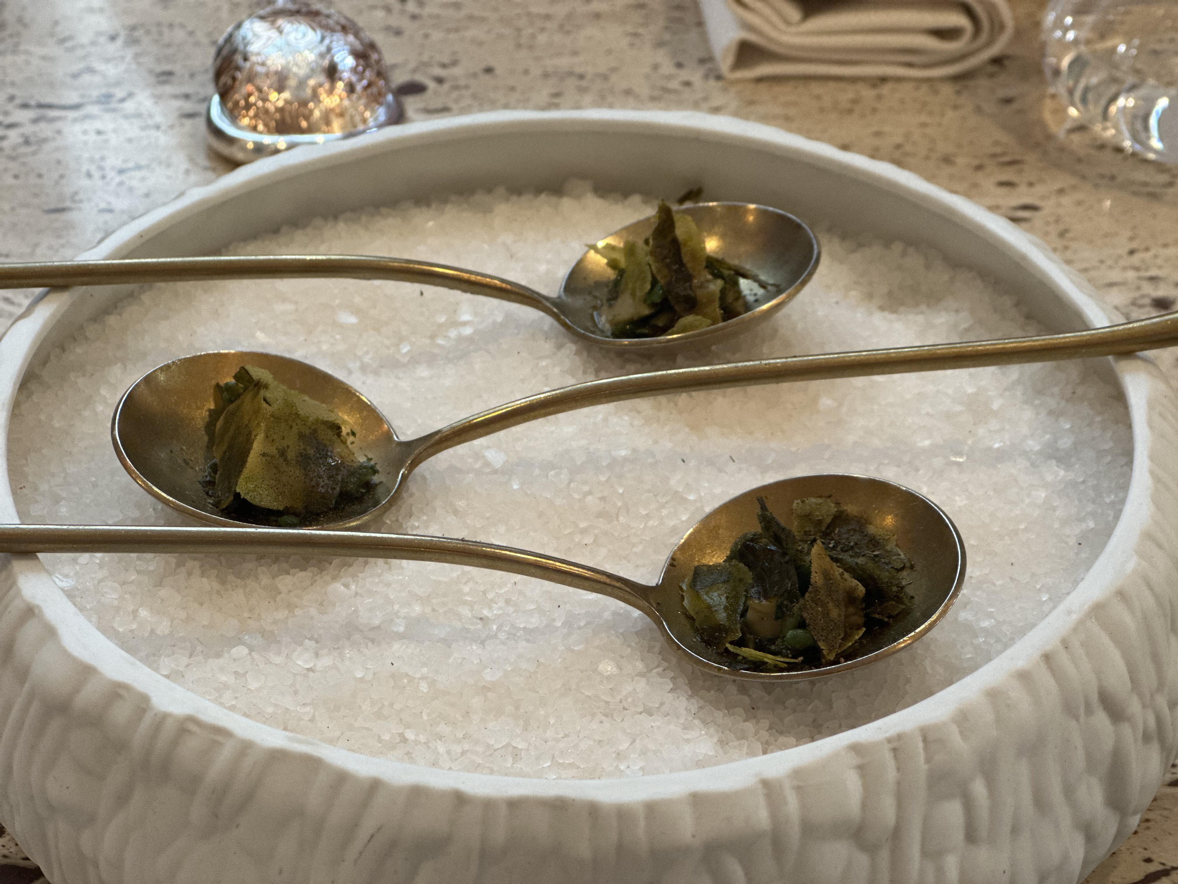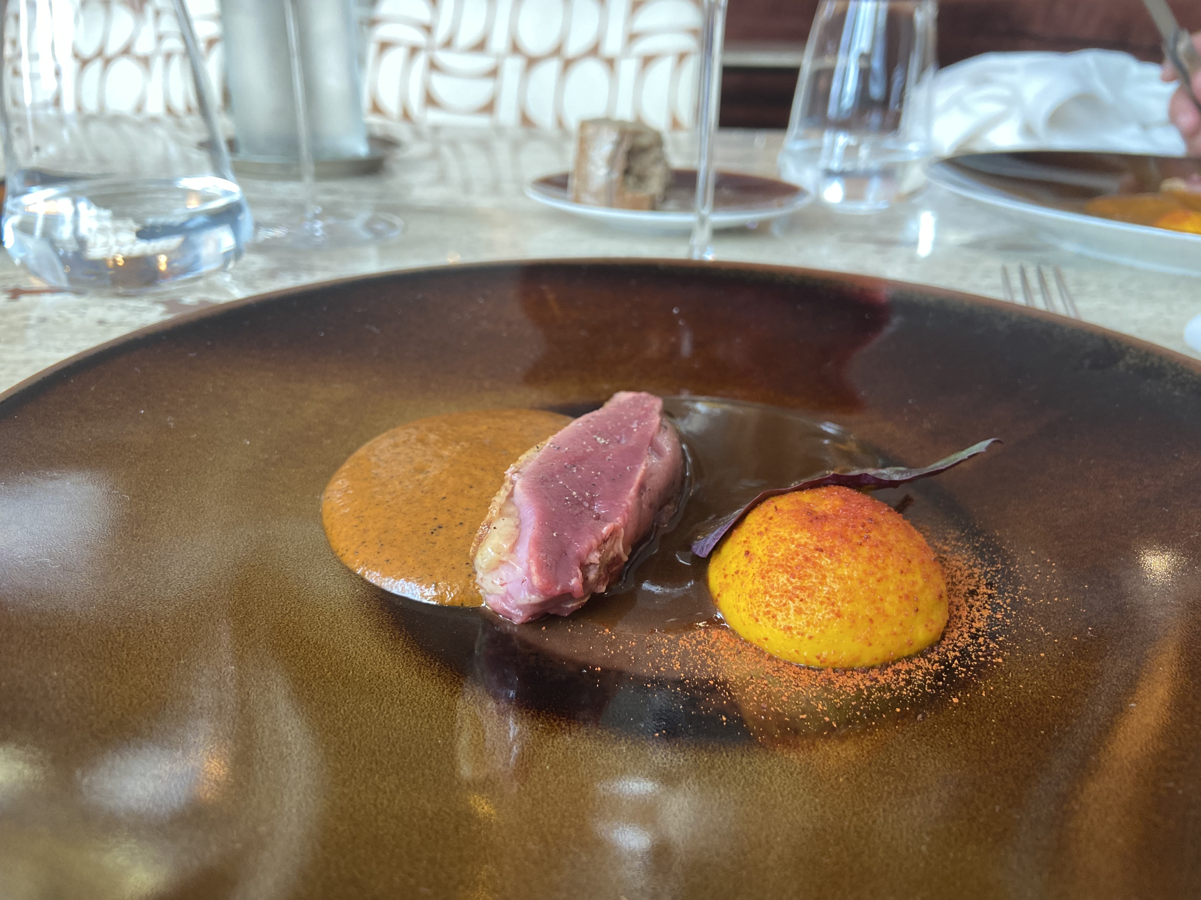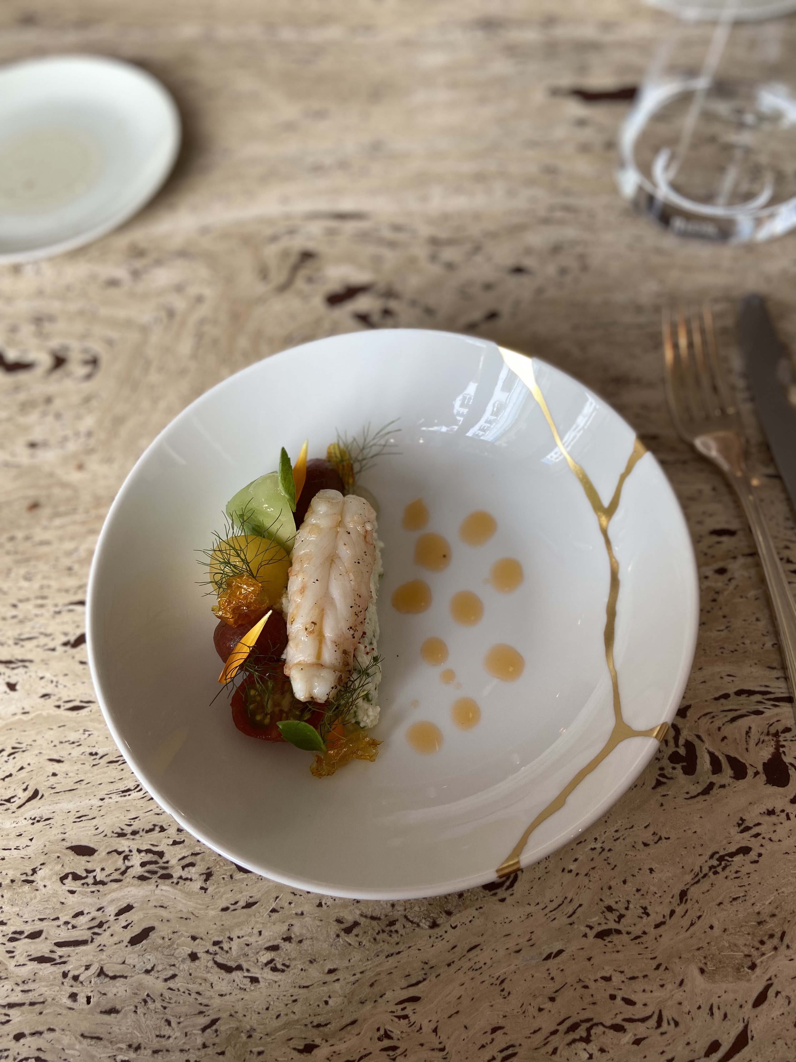 Très belle expérience, un magnifique restaurant décoré avec goût, nous avions pris le menu déjeuner avec des petites portions, des serveurs très agréables et au petit soin (l’eau plate en carafe était cependant payante).