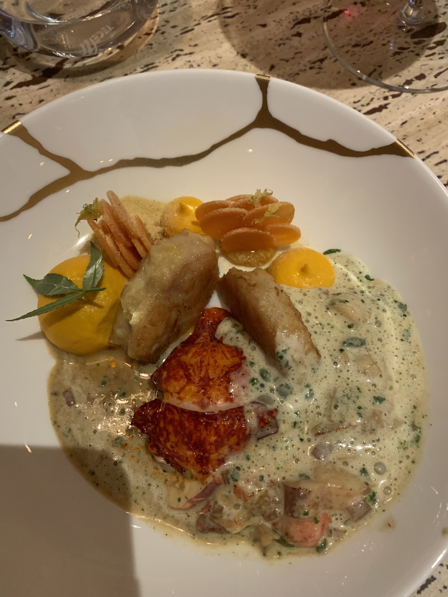 Le plat avec le homard et l’anguille étaient bons. L’entrée et le plat avec le canard étaient passables. Le dessert a été décevant. Le service était un peu long. Par contre le chef était très sympathique.
