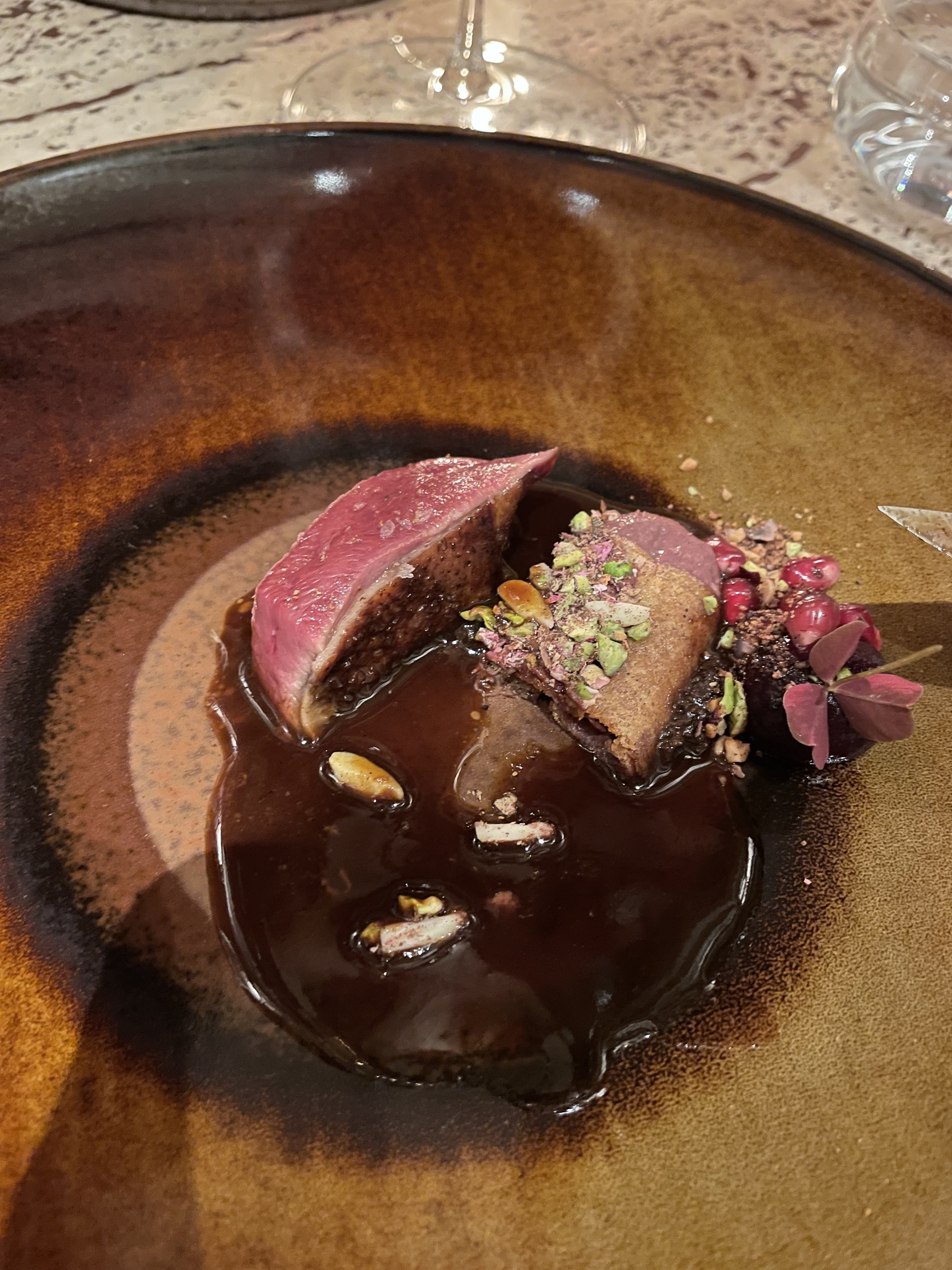 Une cuisine absolument excellente aux saveurs justes et équilibrées. Un lieu décoré avec soin, goût, sobre aux éclairages tamisés, des tables positionnées idéalement et un niveau sonore jamais dérangeant. Un service irréprochable, mention spéciale à la jeune femme qui s’est occupée de nous et qui nous a très bien conseillés sur le vin, nos verres n’étaient jamais vides et elle jetait régulièrement des coups d’œil à notre table pour vérifier que tout allait bien. Merci!