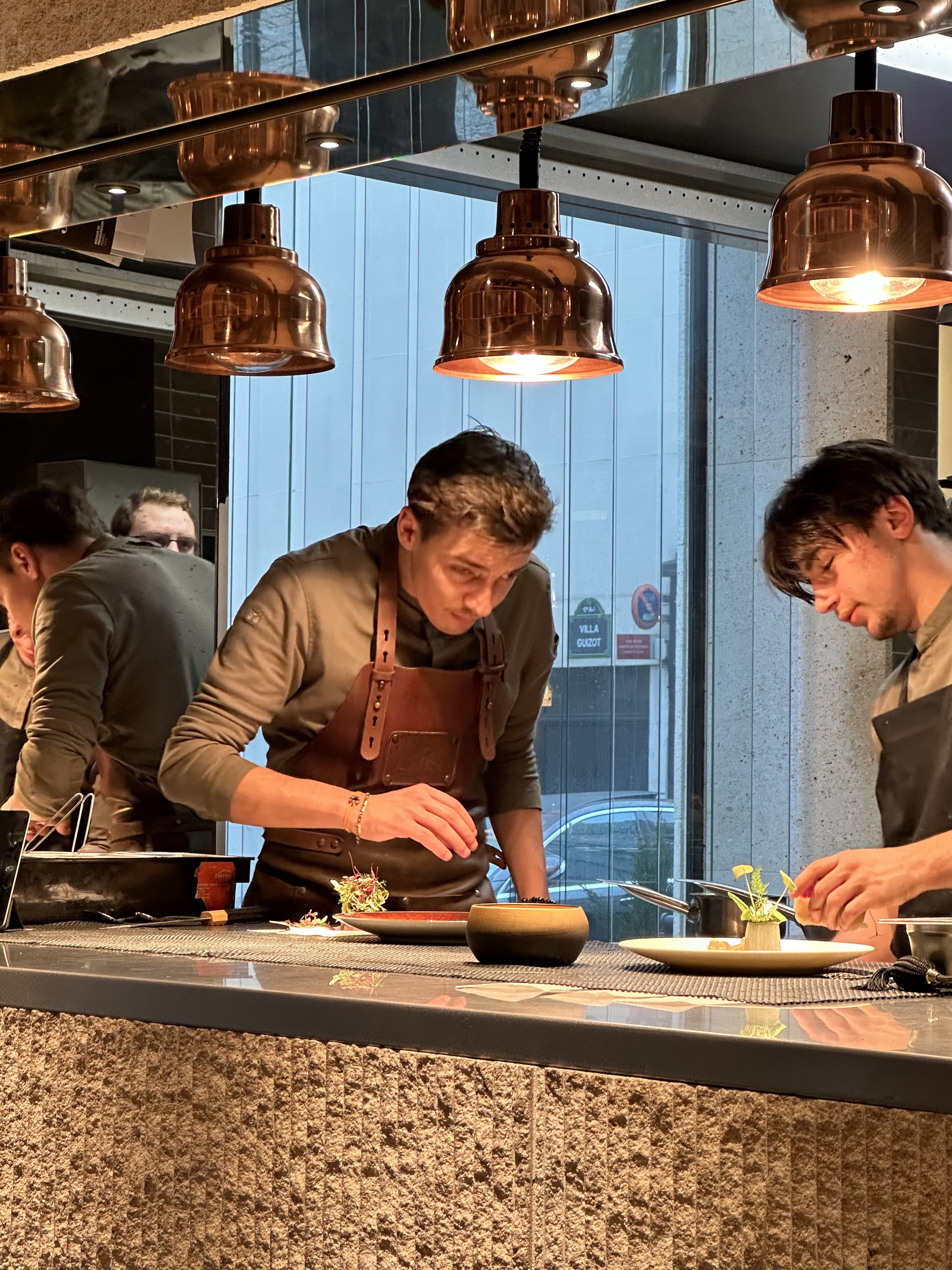 Expérience très très mitigée, et objectivement décevante. La promesse est clairement tentante à la lecture des menus, nous avons opté pour le menu en 4 services à 115e / personne. La cuisine est assez irrégulière, du très bon concernant le classique anguille au vert, ou le plat à base de jersiaise. Mais d'autres plats sont plus quelconque et manquent de relief, la Saint Jacques assez fade malgré une promesse audacieuse, et le dessert riz/gingembre/betterave assez pauvre... Il y a un vrai delta entre le niveau affiché et le résultat dans l'assiette. Le service est agréable, souriant mais parfois lent et imprécis, avec quelques oublis pourtant basiques. Le décor est magnifique, d'un excellent niveau. La cuisine ouverte est toujours un plaisir, mais la tension entre le chef, un de ses cuisiniers et plusieurs serveurs est communicative, et met mal à l'aise. Le sentiment que le fait de voir le chef star devrait suffire... ou j'espère simplement un jour sans... Lorsque l'on identifie ce que propose nombre de très bons chefs à Paris, il y a un décalage flagrant. Déçu donc.