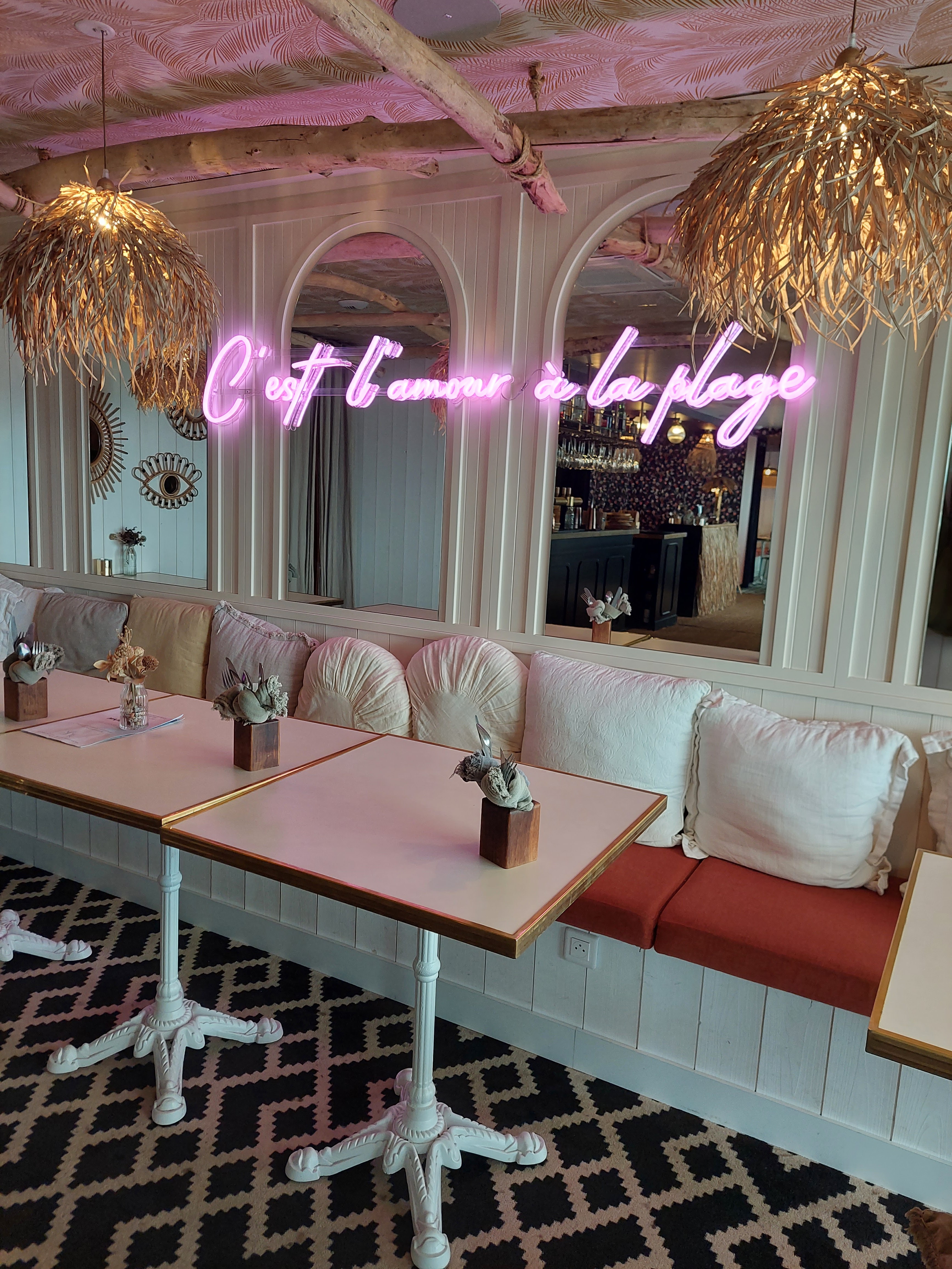 Repéré depuis notre logement de vacances, car situé le long de la plage avec ces lumières et ces parasols. Le décor présente bien et donne envie. Trop de vent on demande à être à l'intérieur, le décor est tout aussi magnifique. Personnel très sympathique, chaleureux. À proximité de chez moi il n'y a pas ce genre de restaurant. Le principe d'assiette à partager est top et en plus c'est super bon. Tellement qu'on a repris les plats 2 fois. Je recommande vivement et on espère pouvoir revenir. Merci à eux pour l'accueil et leurs gentillesse