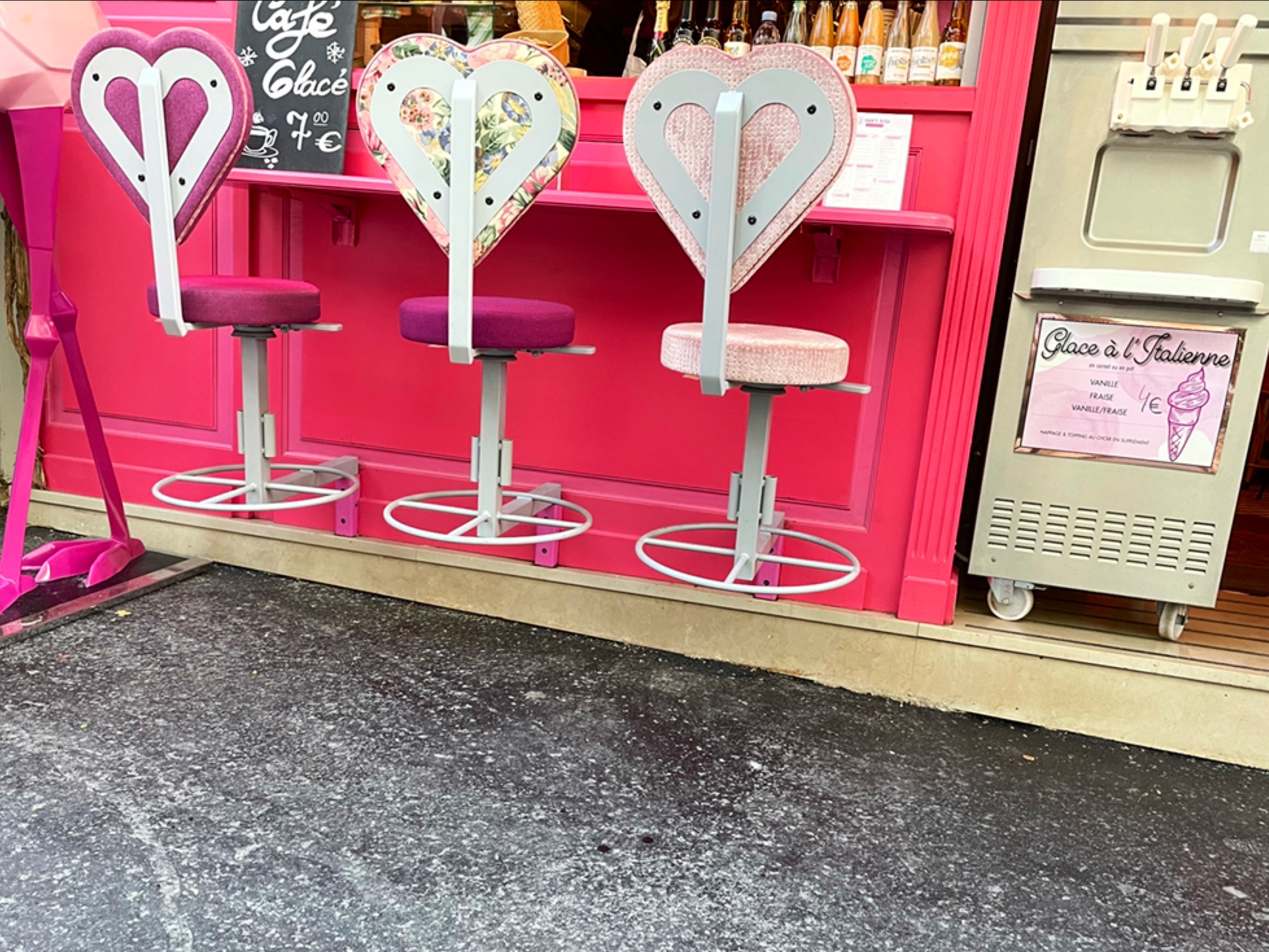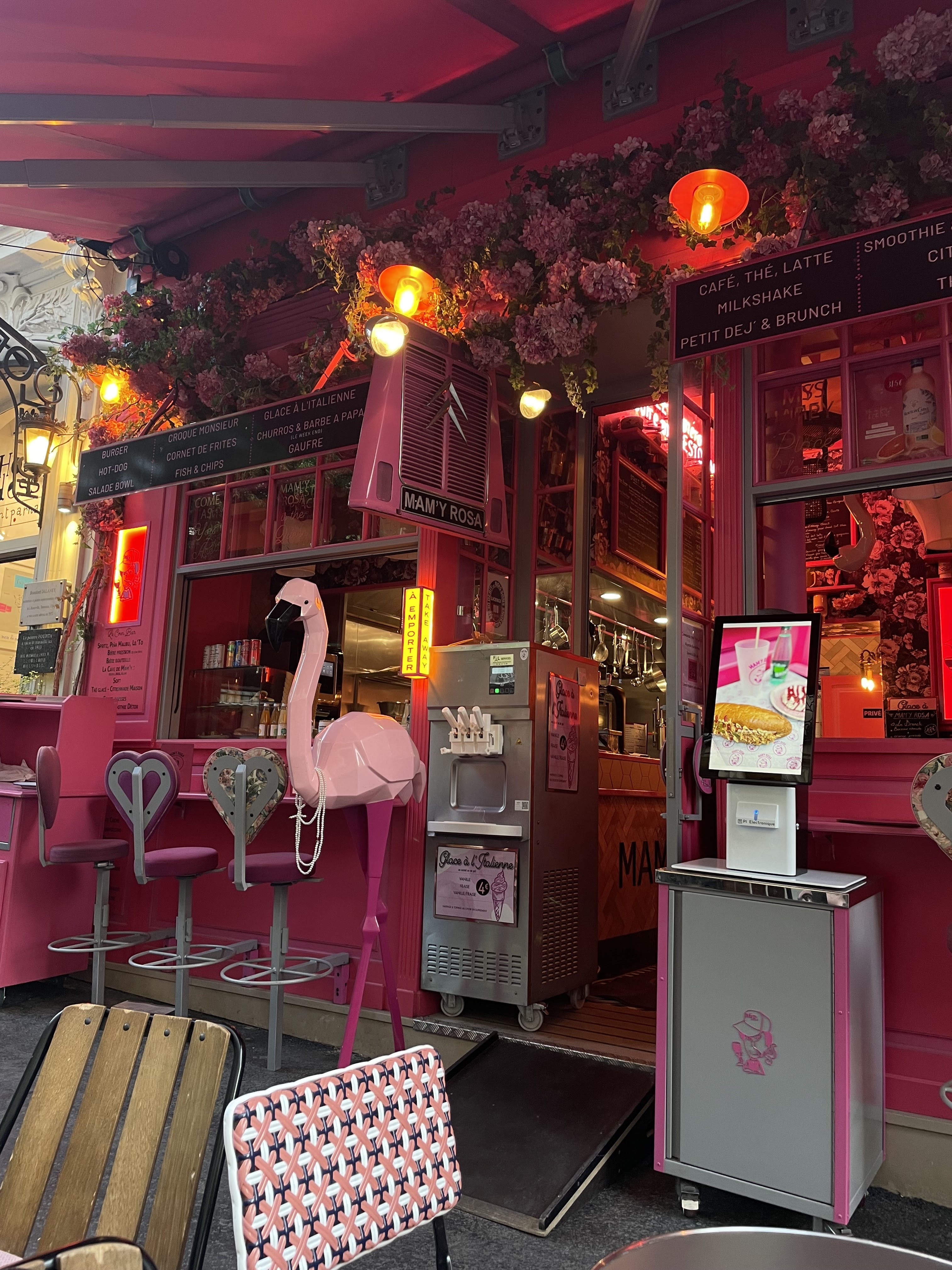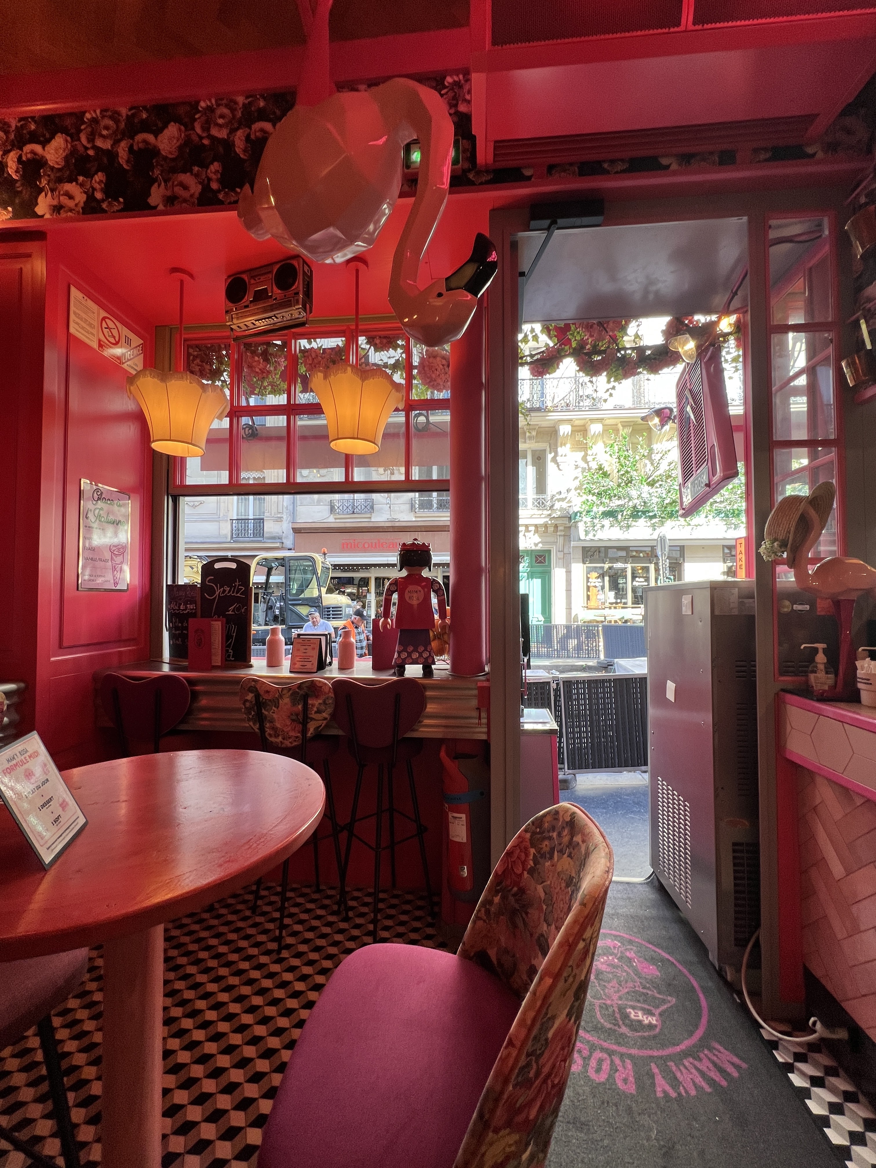 Très jolie façade. Le décor est renversant, les chaises au plafond. Tout est rose. Le menu est classique.