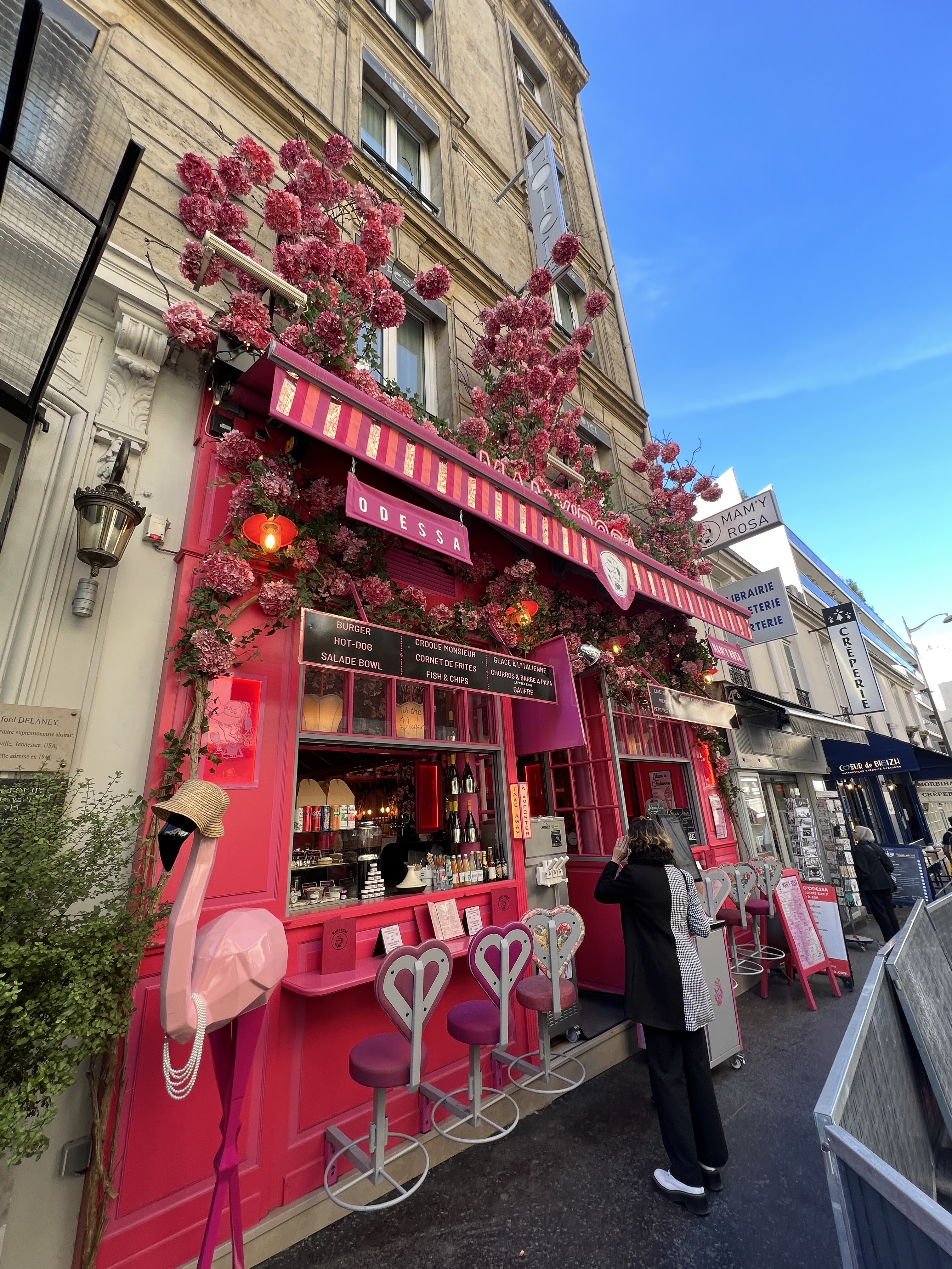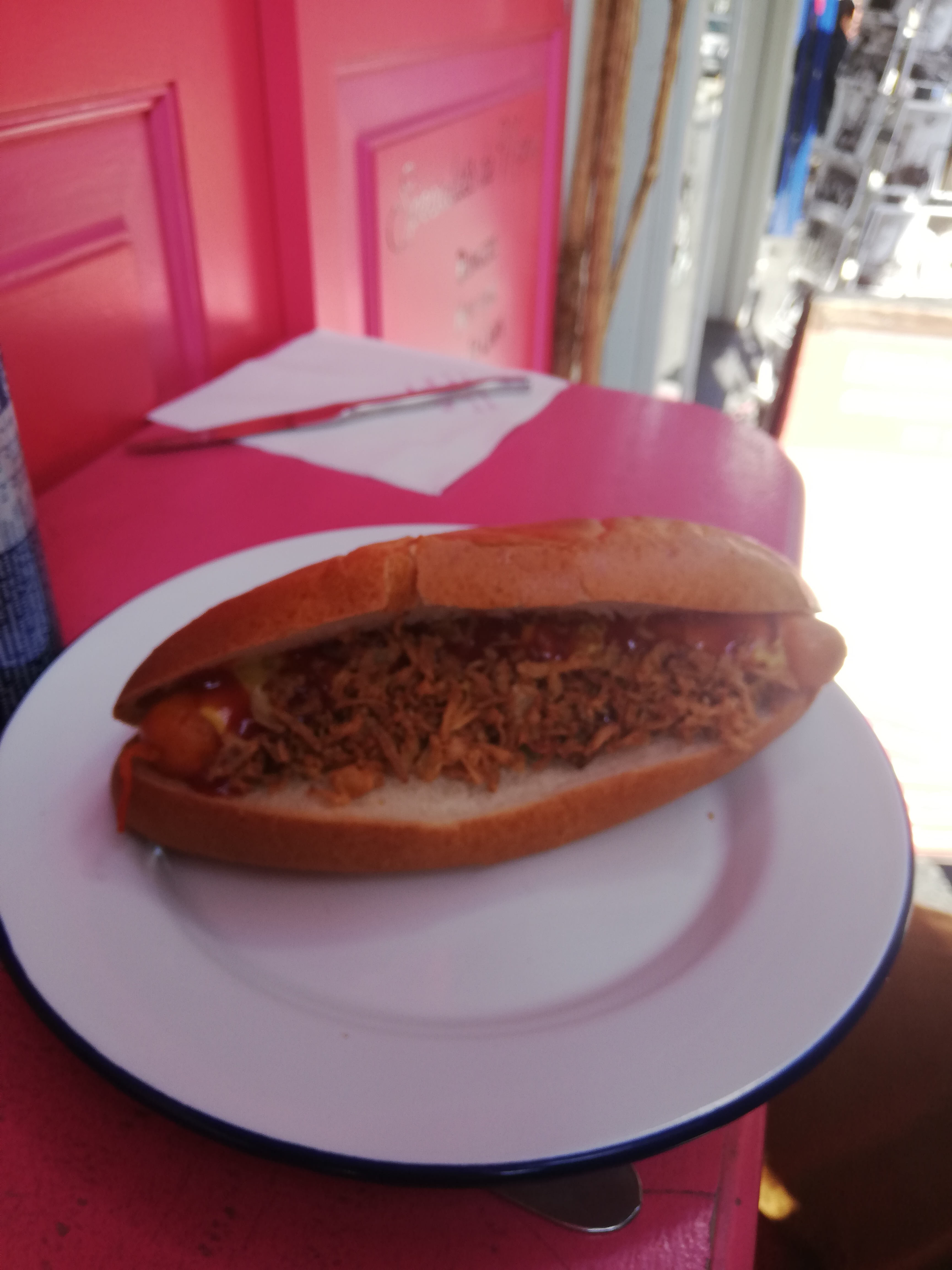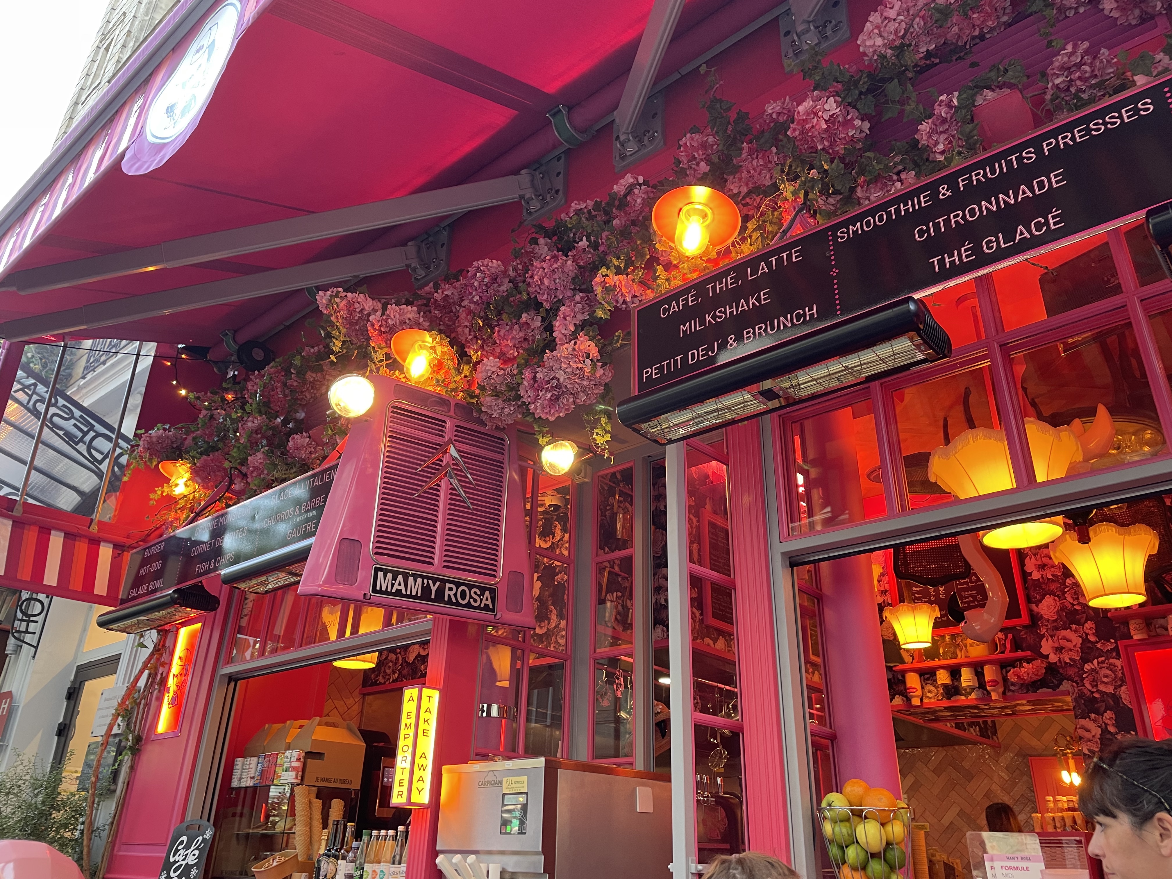 Très jolie façade. Le décor est renversant, les chaises au plafond. Tout est rose. Le menu est classique.