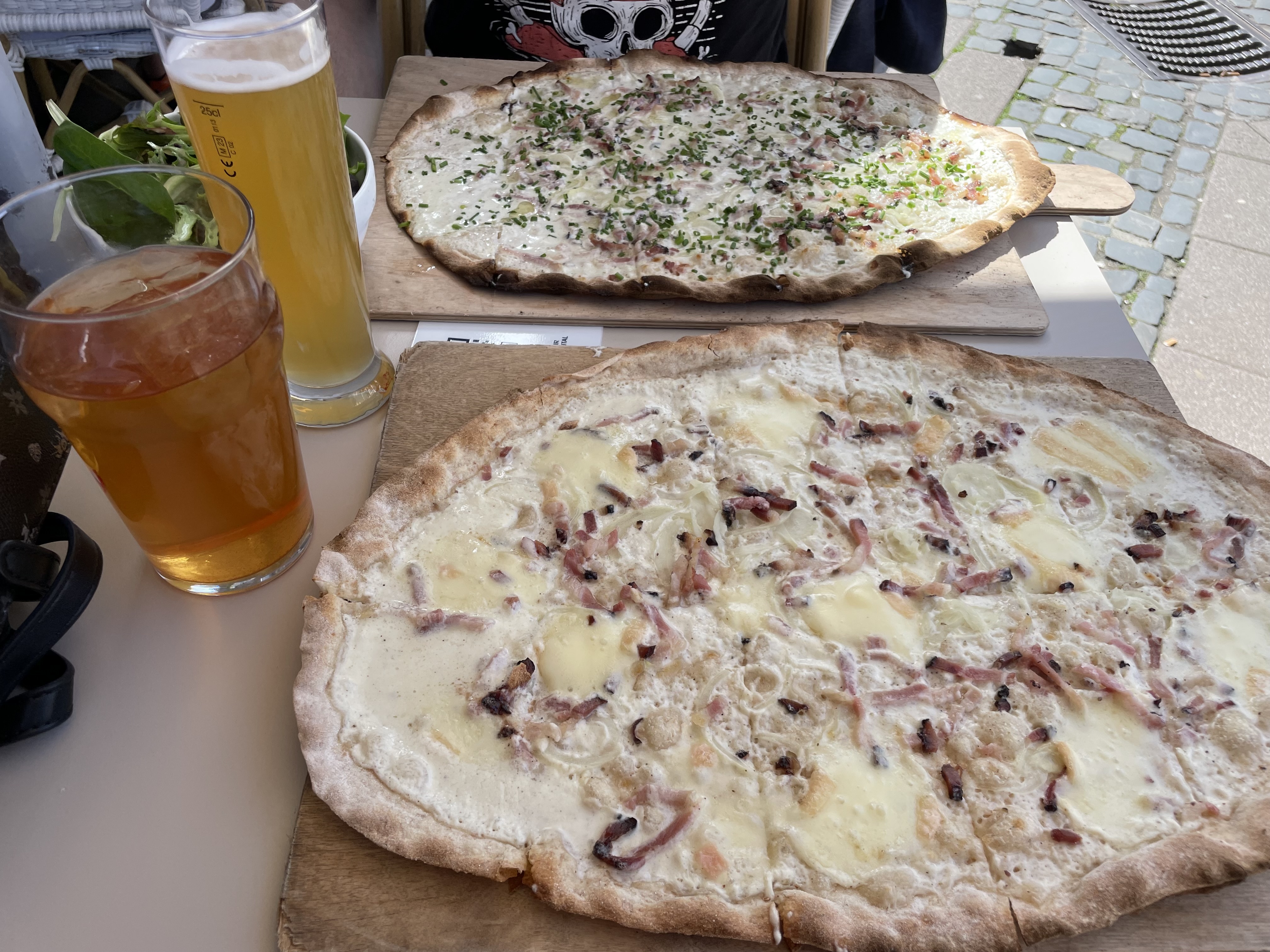 Une des meilleures tartes flambée que j’ai mangé et peut-être les meilleures de tout Strasbourg ! Pâte fine et croustillante, crème légère et parfumé, lard savoureux…🤤