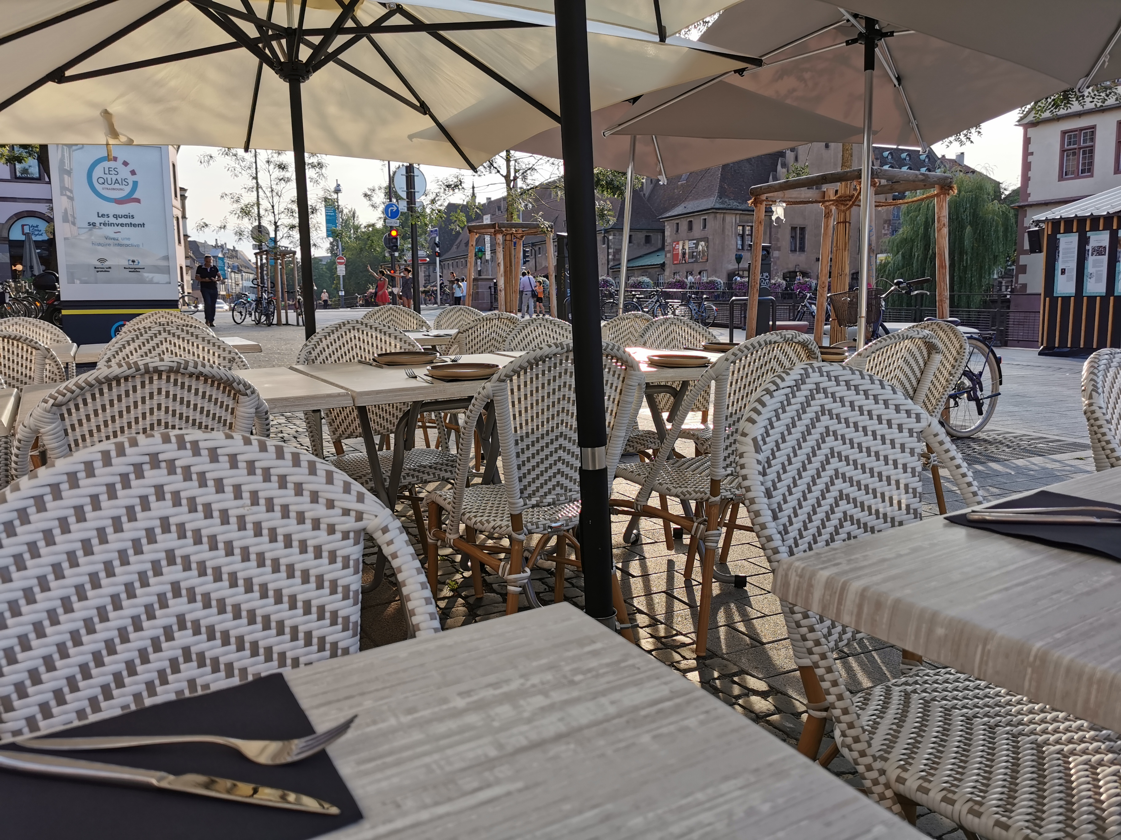 Repas entre collègues et en terrasse avec une belle vue sur l'architecture strasbourgeoise. Carte de tartes flambées et de spaetzles. Service agréable, sympathique et rapide. Seul regret avec le passage de plusieurs véhicules le long de la terrasse.