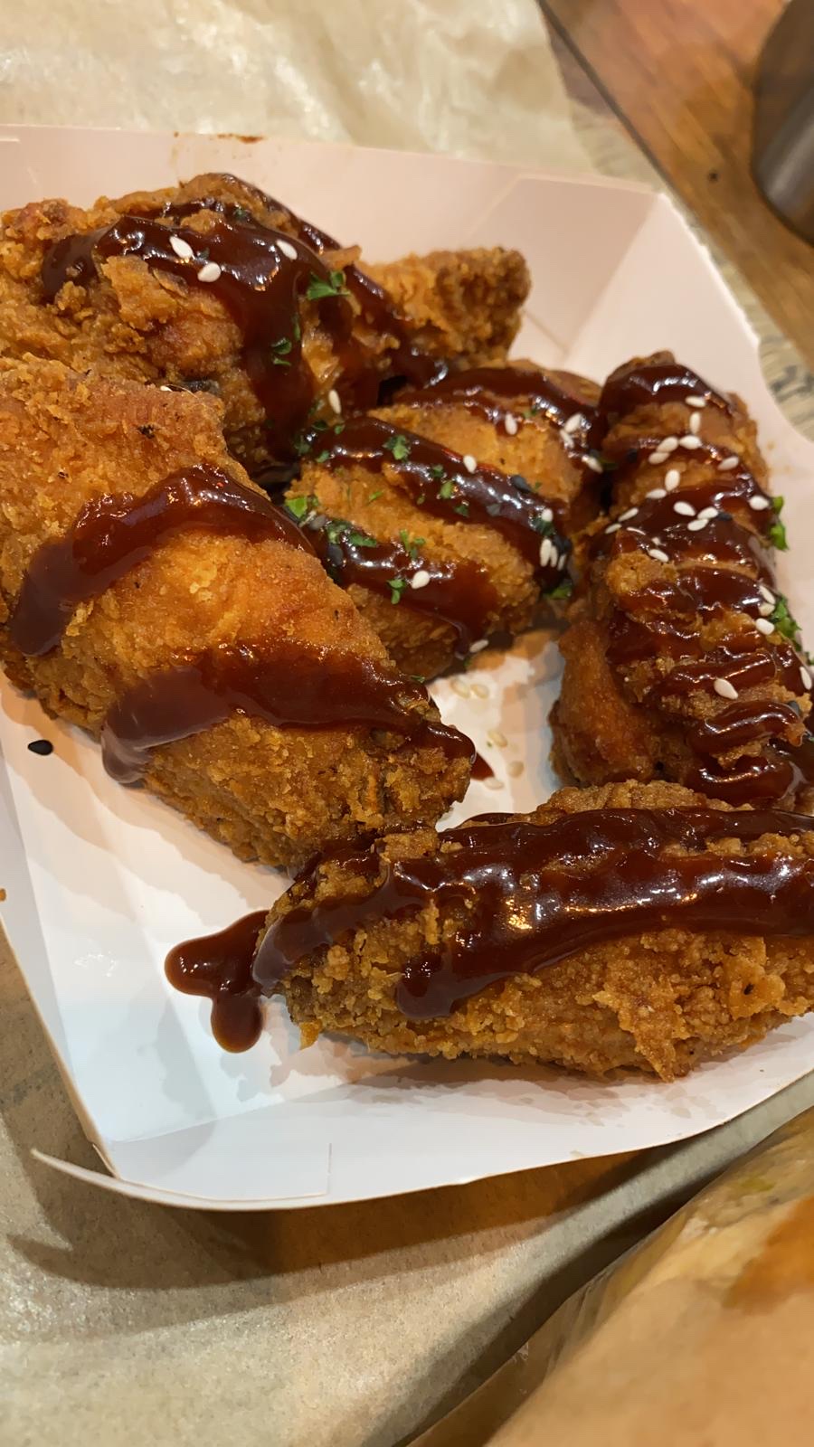 Méga coup de cœur pour les wings braisés du lourd on se lechait les doigts !!! La sauce ail parmesan pour les fried wings aussi est top! Dommage que les frites ne soient pas fraîches (frites surgelées) sinon ça aurait été 5 étoiles même 6 haha. La prochaine fois on viendra sur place car Deliveroo force énormément sur le prix.