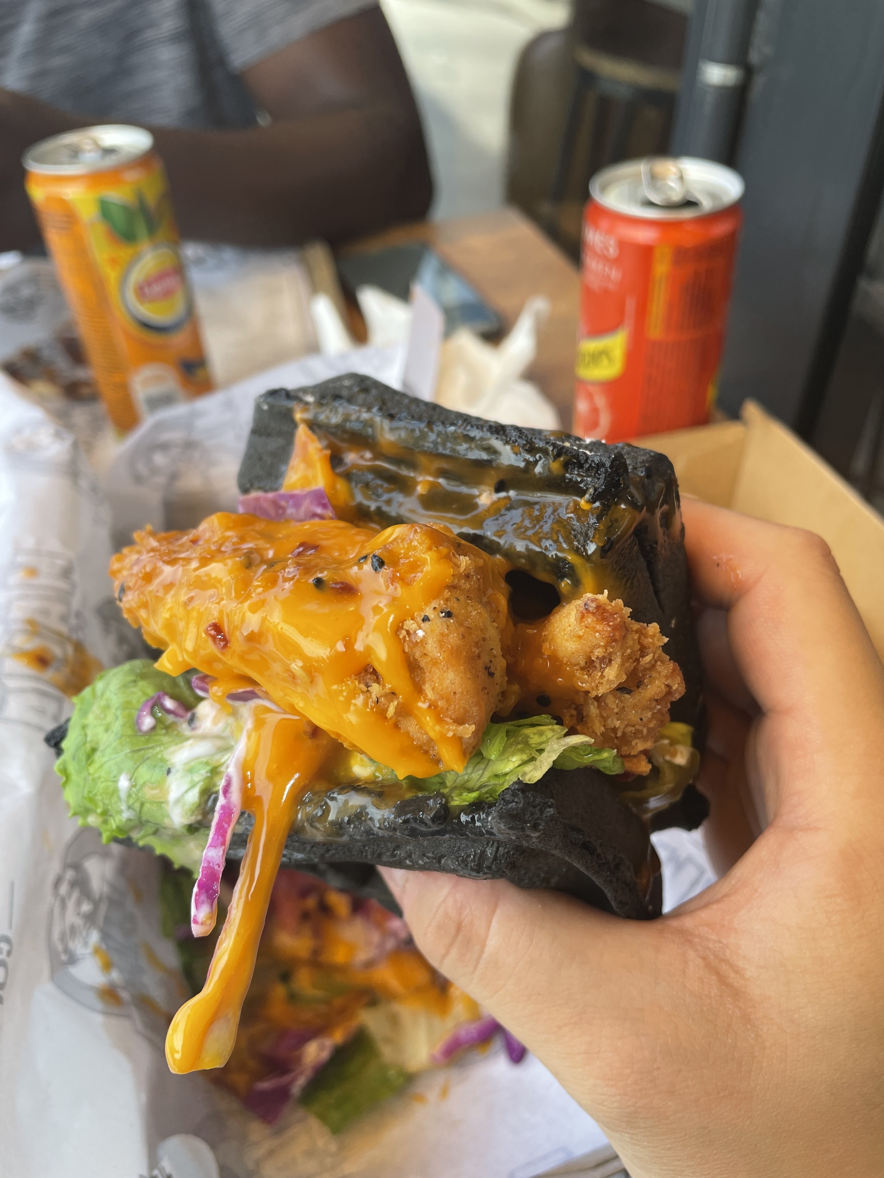 Je suis venu en voyant les postes sur insta. J’ai galèrer à trouver le sandwich avec le pain en gauffre a la borne je me suis rabattue sur les burgers normaux. Rien à dire le tenders dans le burger était excellent par contre le combo avec le mac & cheese dedans non. Les bananes plantains avaient pas un goût aussi sucré qu’elles devaient avoir et les frites de patates douces avaient un gout amer. Je met quand même 3 car je penses être venu un mauvais jour et je vais retenter le resto parce que je n’ai pas eu l’occas de gouter leur tenders/wings et milkshake.
