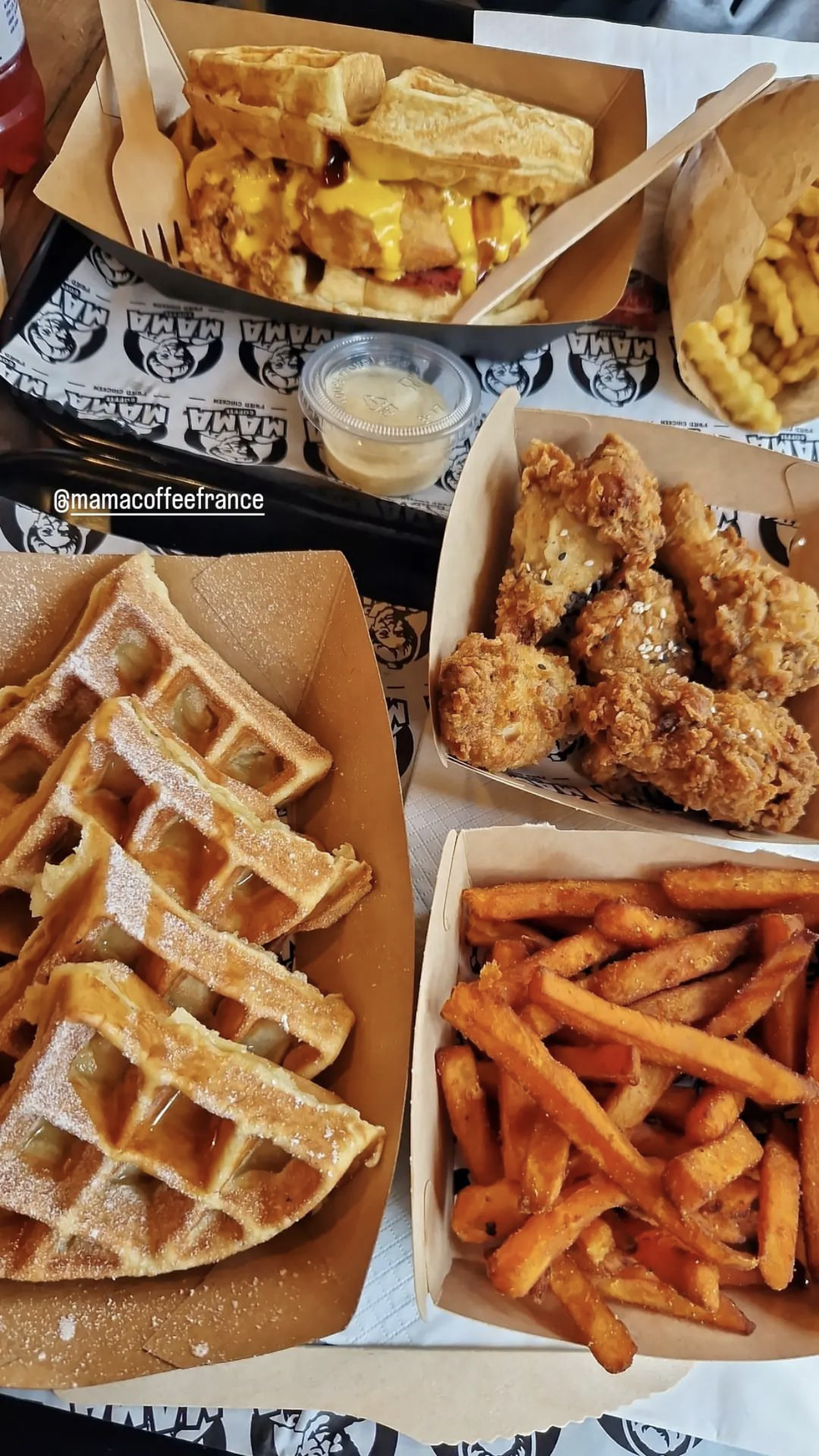 Nous sommes venues dîner un soir car nous avions vu le restaurant sur les réseaux. Dans l’ensemble c’était correct, mais un peu déçu des plats. Les menus waffle étaient très généreux, il y avait une grosse quantité. En revanche nous avons trouvés la gaufre fade. Le poulet lui était bon et croustillant. Les frites bonnes aussi. Nous avons également pris des entrées : dès mac n cheese ball et du poulet dynamite. C’était correct mais sans plus. L’addition est assez salée c’est dommage.