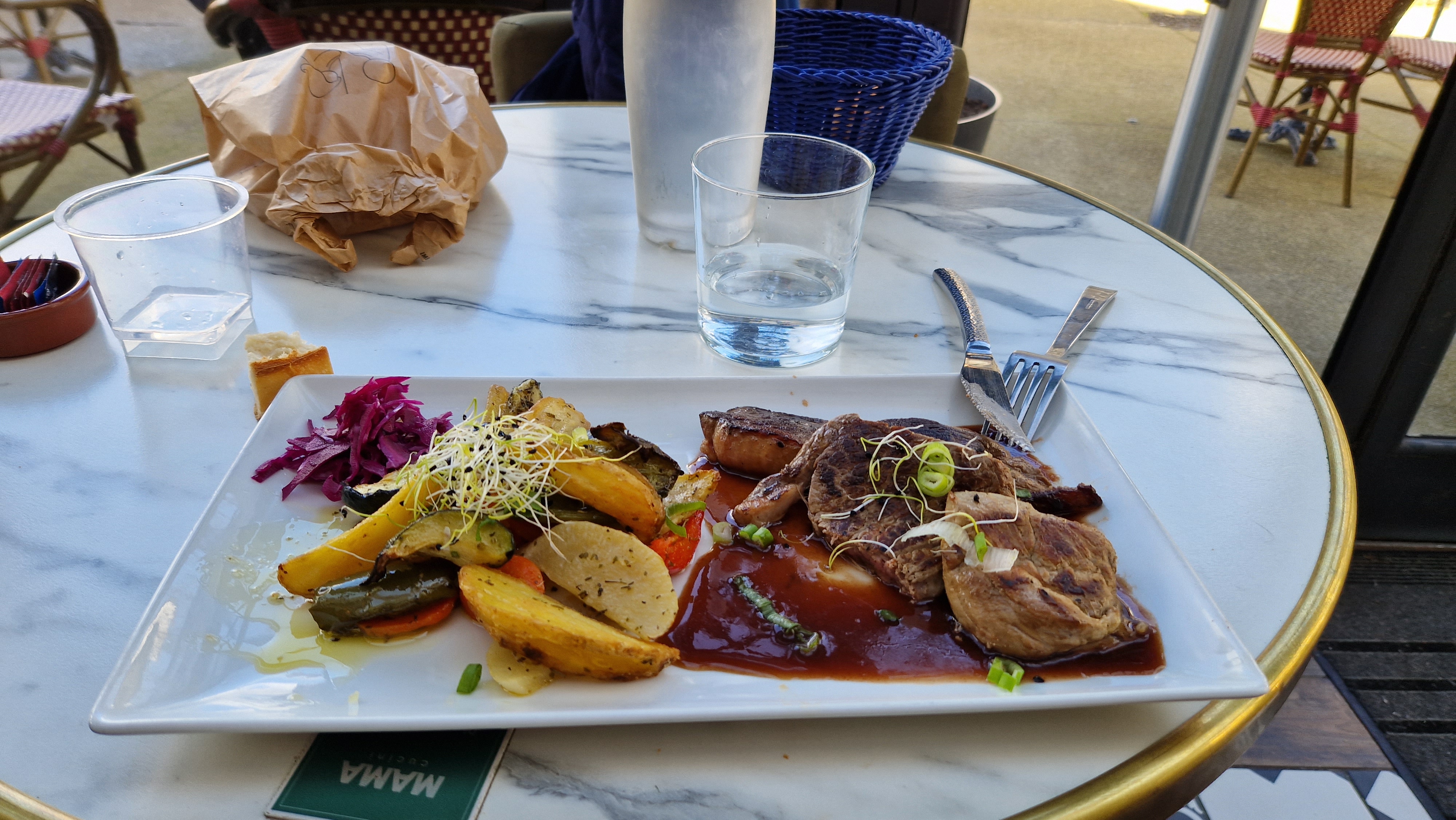 Entrecôte frites fraîches parfaite, tendre et cuite comme demandée, quand on demande une cuisson bleue on est souvent déçu, chipirons pour mon collègue qui n'était pas déçu non plus. Turamisu en dessert très bon, tout fait maison, service pro et souriant.