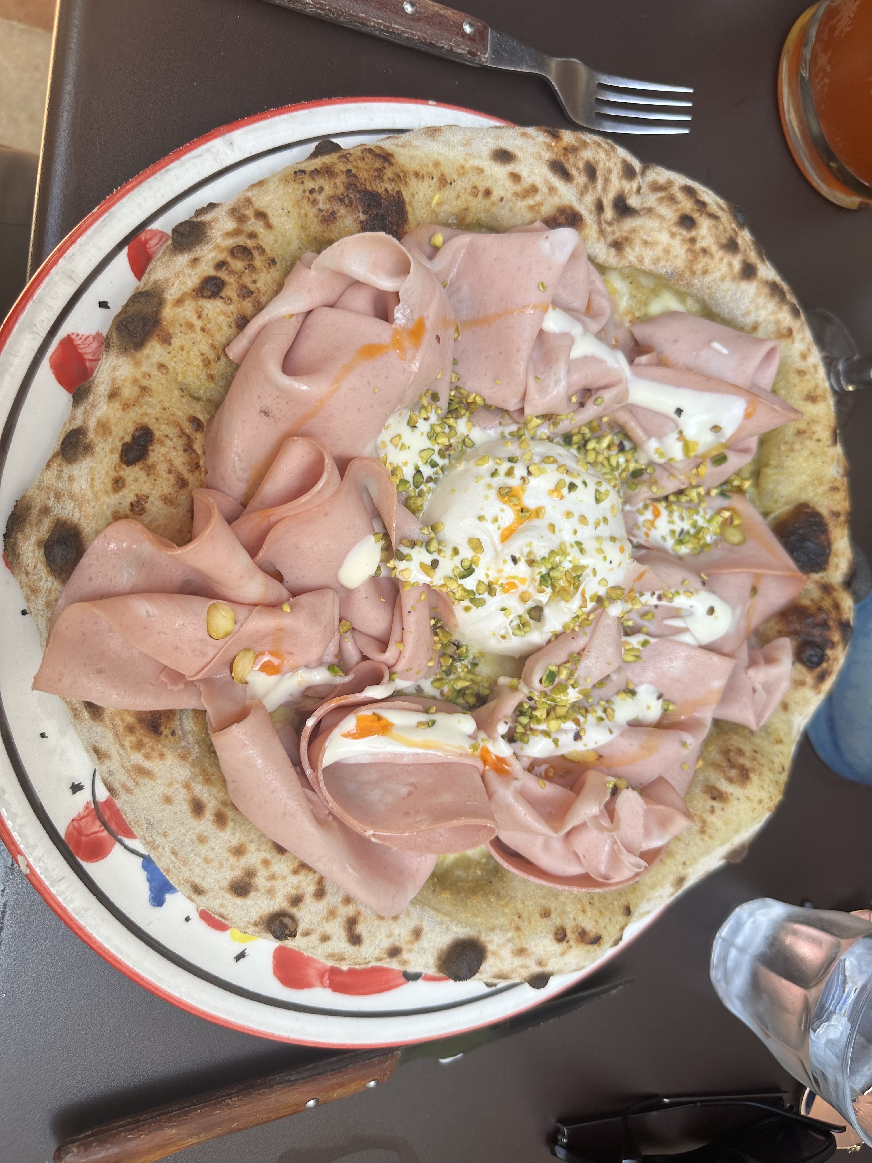 Pizza Mortadella excellente, de loin une des meilleures pizzas que j’ai pu manger ! Le perso de pistache est incroyable. La pâte est très bonne, bien aéré. La panna cotta pistache était également un régal :)