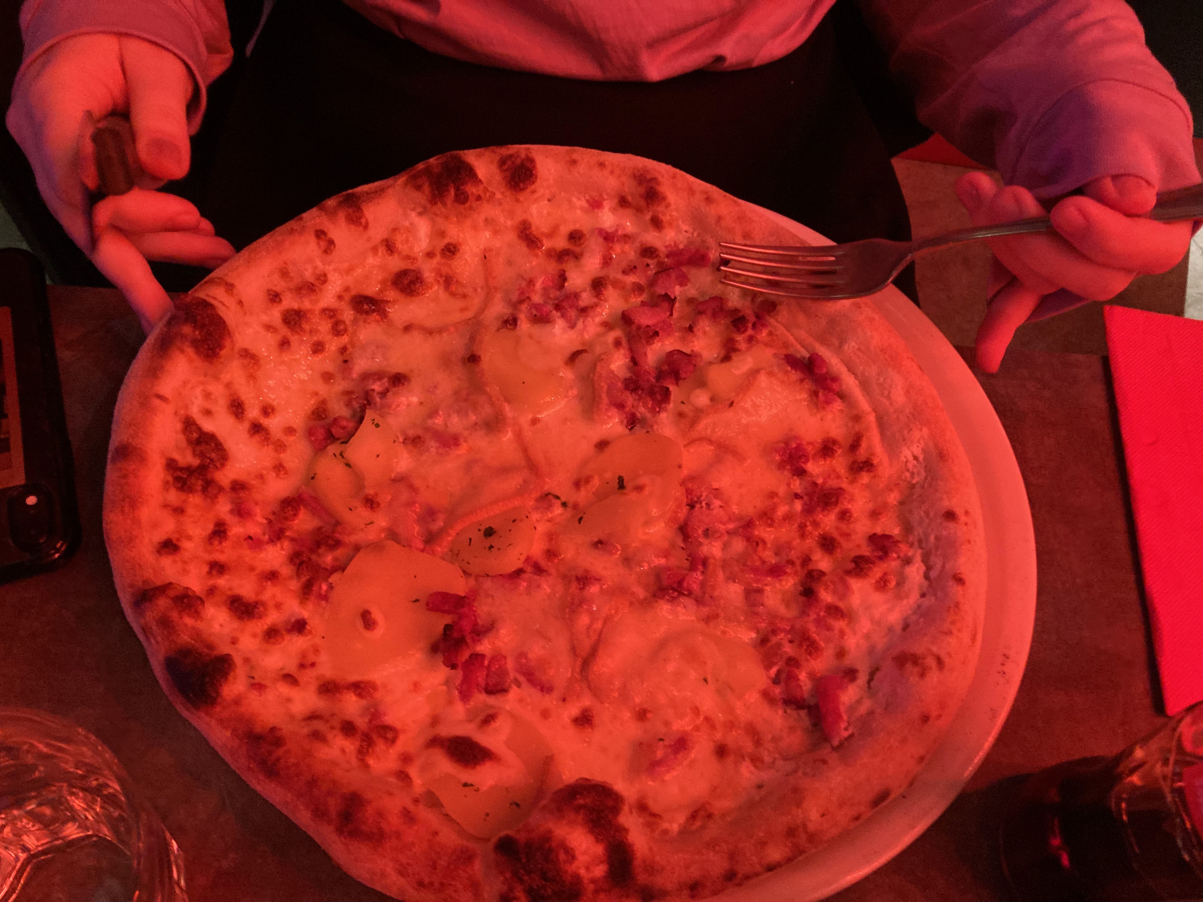 Bonne pizzas sauf la 4 fromages manque un peu de garniture, le tiramisu 😠 pas terrible trop de crème .
