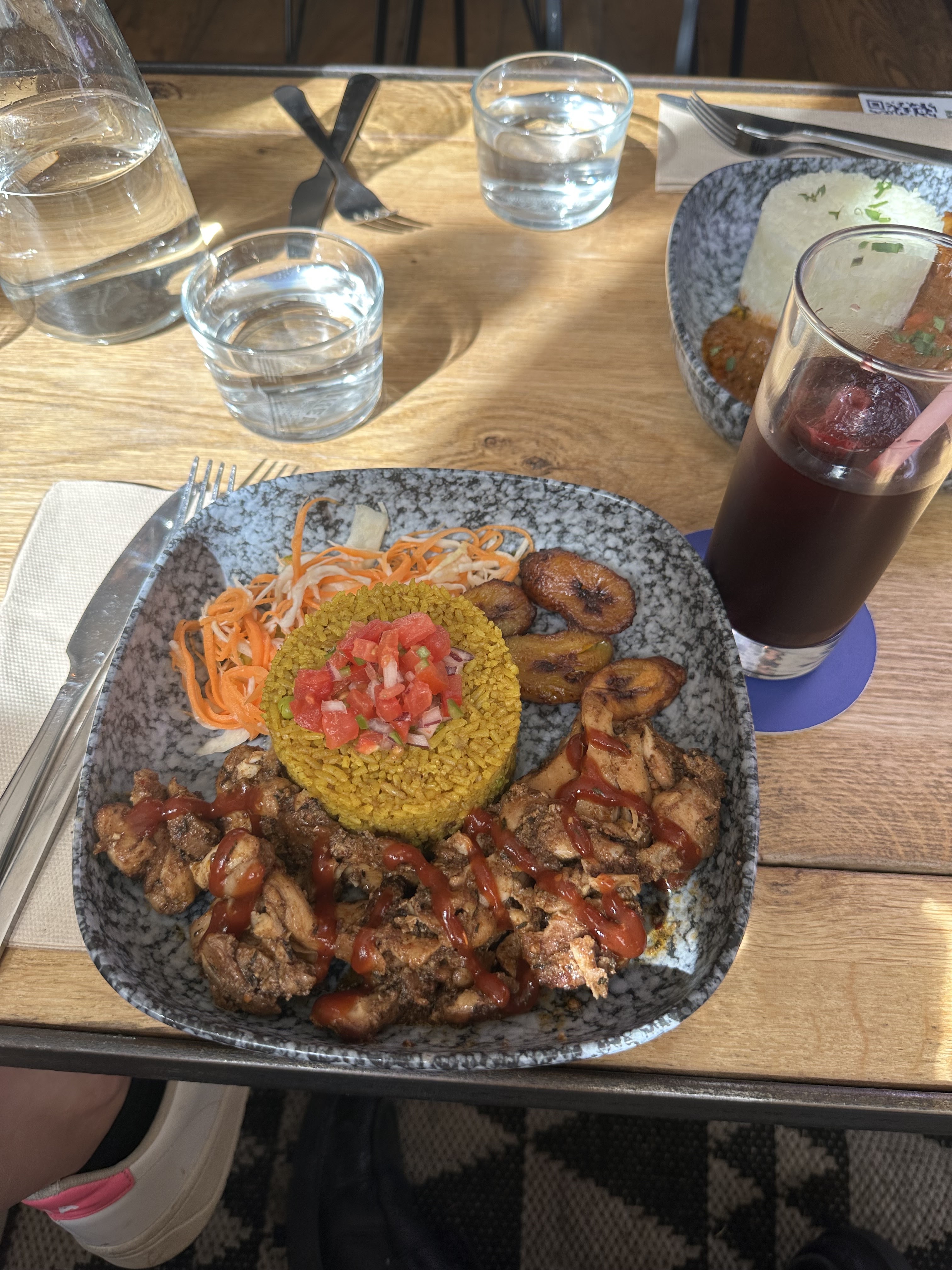 Petit restaurant avec des plats afro-inspirés dans le 18e. Le cadre est très moderne et le décor est vraiment bien pensé. Les serveurs ont été attentionnés toute la soirée donc c’était vraiment plaisant. Il faut absolument essayer le bissap!