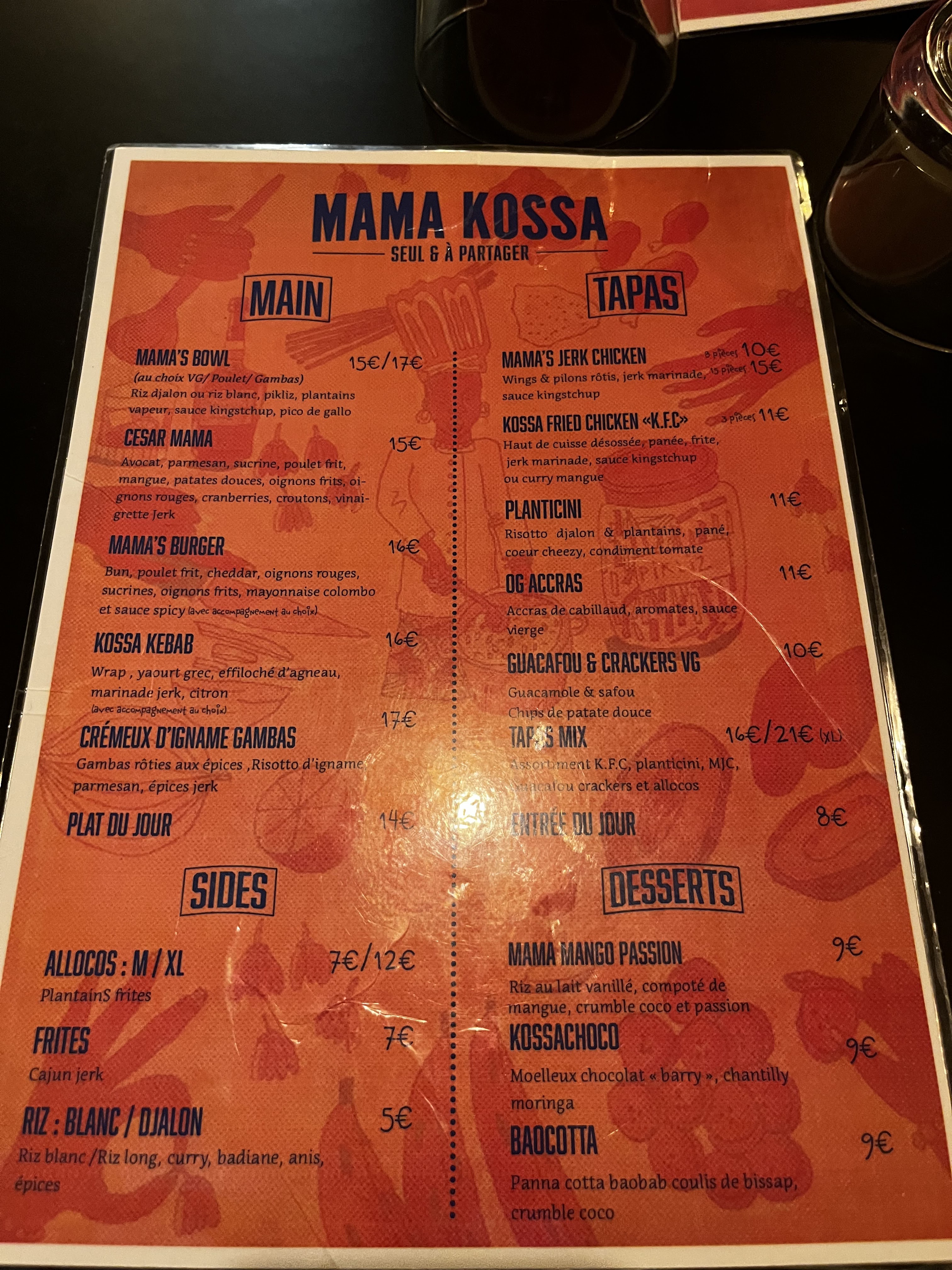 Mama kossa, que dire? Un super endroit où dès que l’on rentre on sent tout de suite le depaysement. On passe un moment fort sympathique entre musique and food. Les plats proposés sont tres bons, bien assaisonnés et parfaitement relevés comme il faut. Les alocos miaam! La musique tres sympa. Mention speciale pour le bissap!