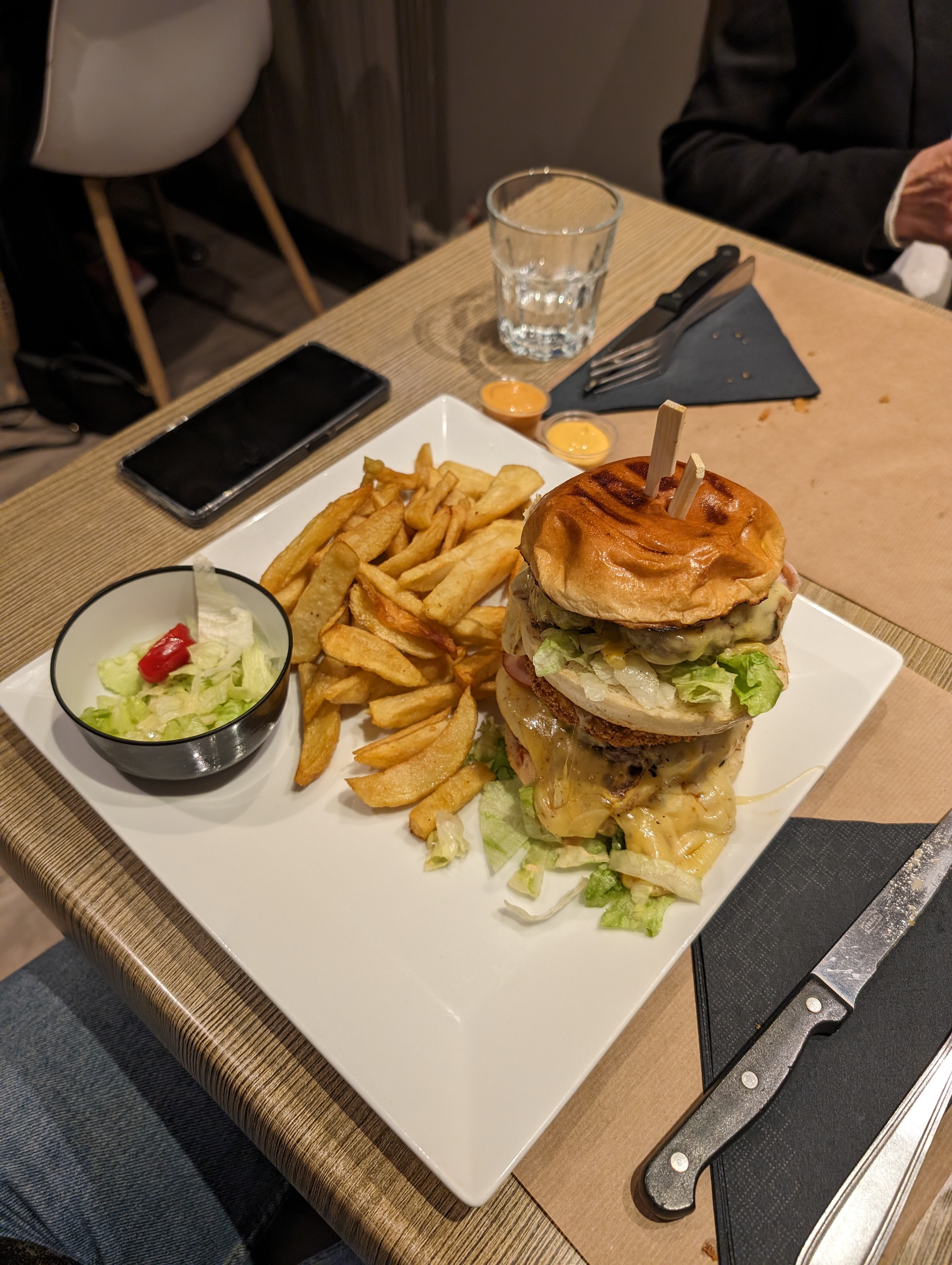 Restaurant de Burger avec un choix varié. Menu à 25 euros avec entrée, plat, dessert et boisson. Très copieux et jolie présentation. Dommage qu'il fasse si froid dans la salle, obligé de manger avec un blouson...