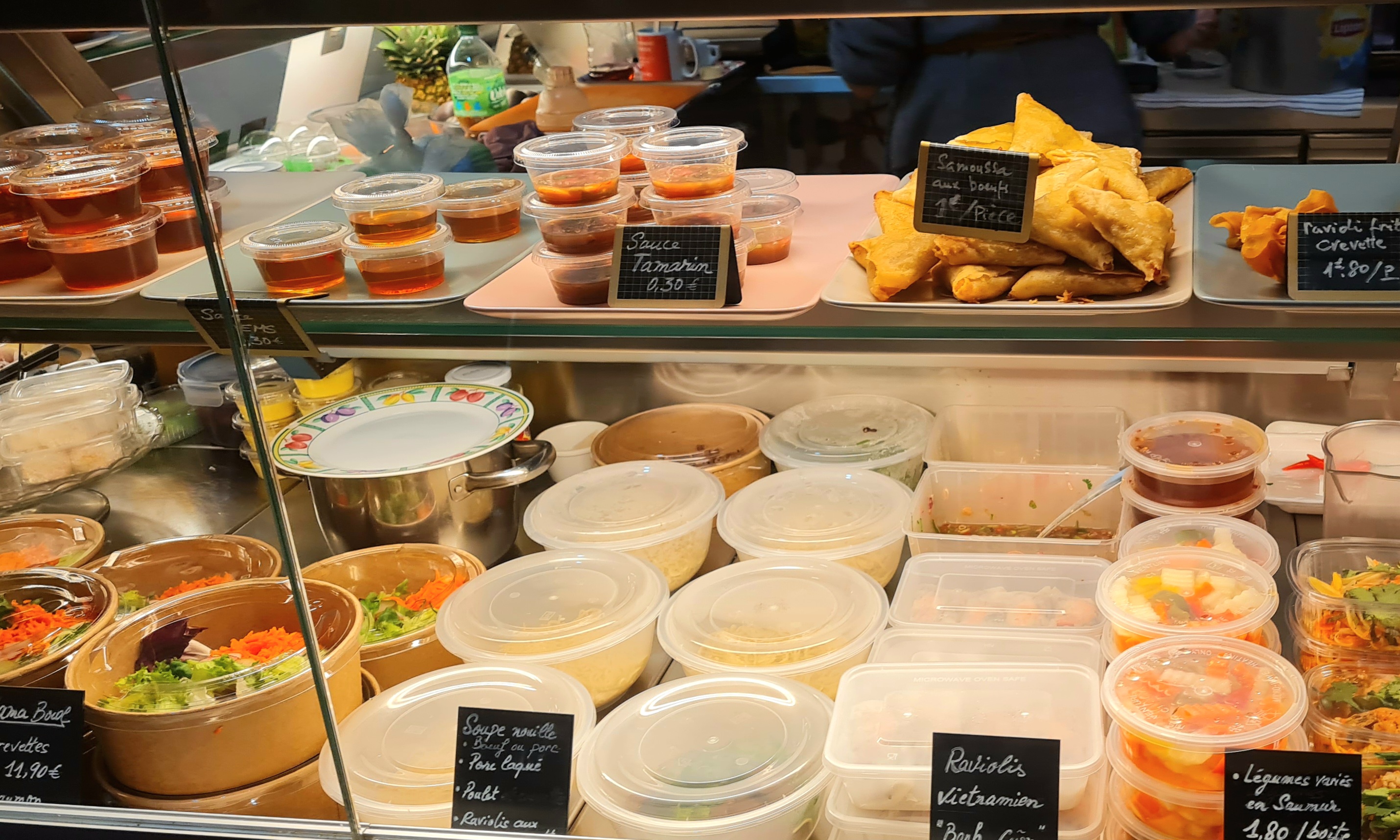 Très bon traiteur ouvert depuis moins d'un an qui est l'ancien gestionnaire du restaurant wing heng juste en face. La nourriture est bonne et fraîche. Certaines salades sont originales et mélangent sucrée et salée. Comptez une dizaine d'euros pour manger. Pour manger sur place ce n'est pas très grand, capacité de 12 personnes en intérieur et 8 en extérieur. Ils font surtout de la vente à emporter.