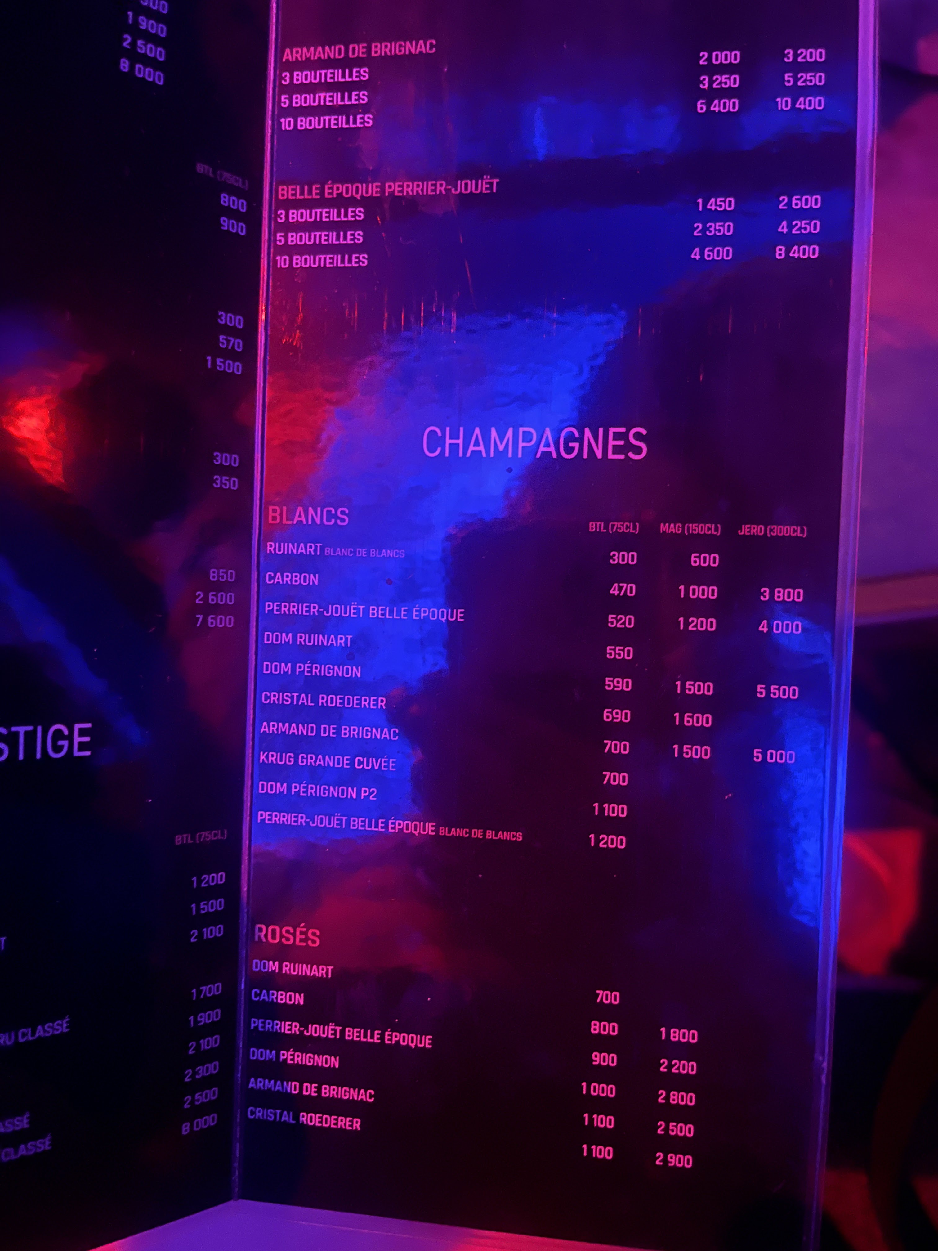 Restau: presque honteux en ce qui concerne le rapport qualité prix des plats et du service ! Des mozza sticks sont meilleurs au mcdo. On était 8, trois d’entre nous avons été servis pour le plat, sans l’accompagnement qui est resté pendant 15 minutes sur le plateau derrière nous et qui du coup sont arrivés froids au moment du service. À ce prix là on attend un meilleur service ! Mon pote avait les assiettes sales posées sur un plateau à côté de son bras… bon vu le standing du restau on en attend un peu plus ! Dessert très bon en revanche. Mais pour 100 euros entrée plat dessert, autant aller manger chez un étoilé. Clairement on paie pour l’ambiance ! Qui elle, valait vraiment le coup en revanche ! Nous sommes très bien tombés, la musique était folle, les danseuses étaient super ! 400 euros à deux pour deux bouteilles de vin et à manger !