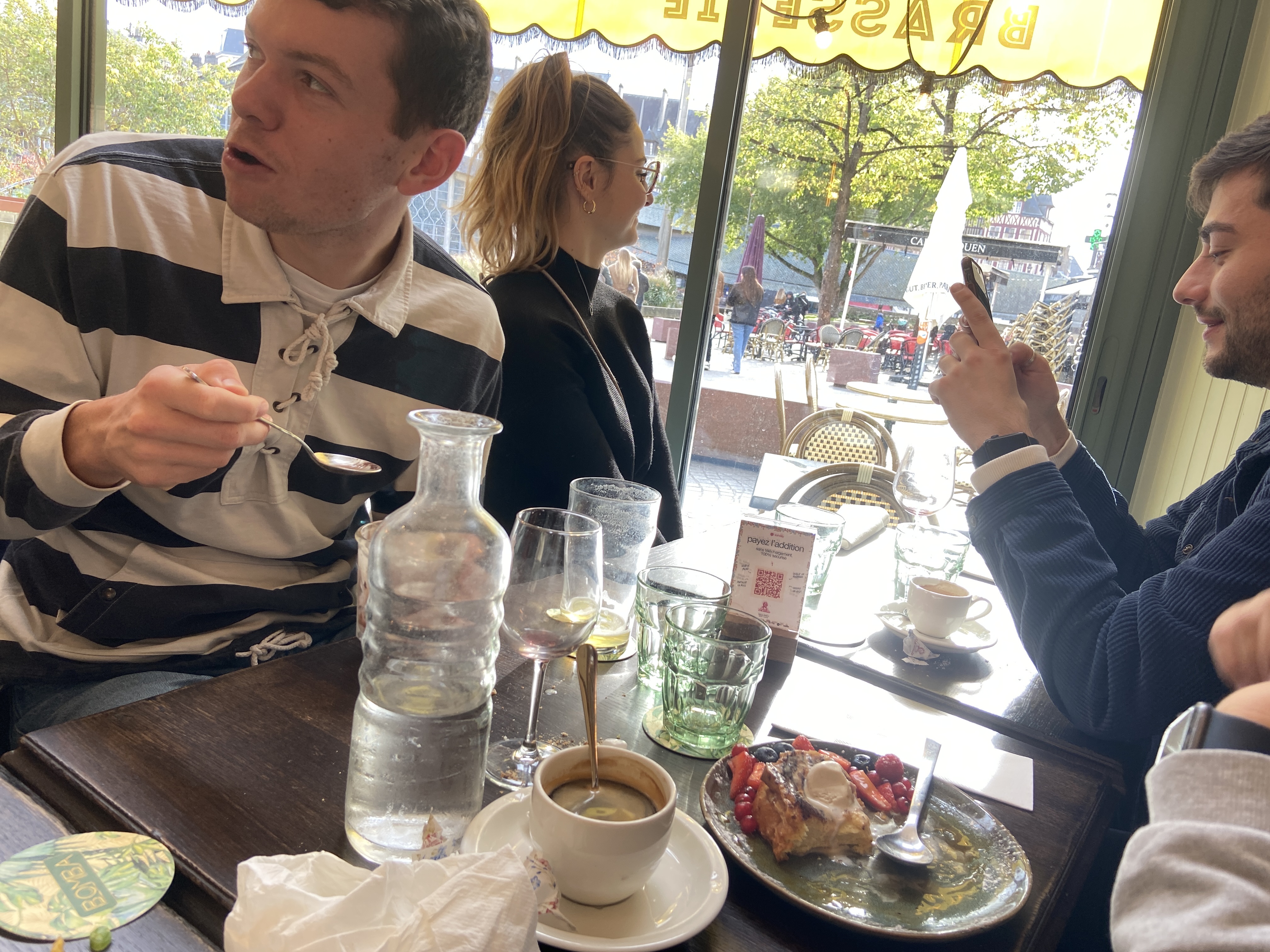 A 10h30 déjà plus de croissants et pain aux chocolats ! Le service n'est pas terrible, nous avons attendu assez longtemps avant d'avoir le menu et d'être servi. Le chocolat n'est pas fameux et le café était du pipi de chat... Les pancakes sont bons mais sans plus En bref, un attrappe touriste