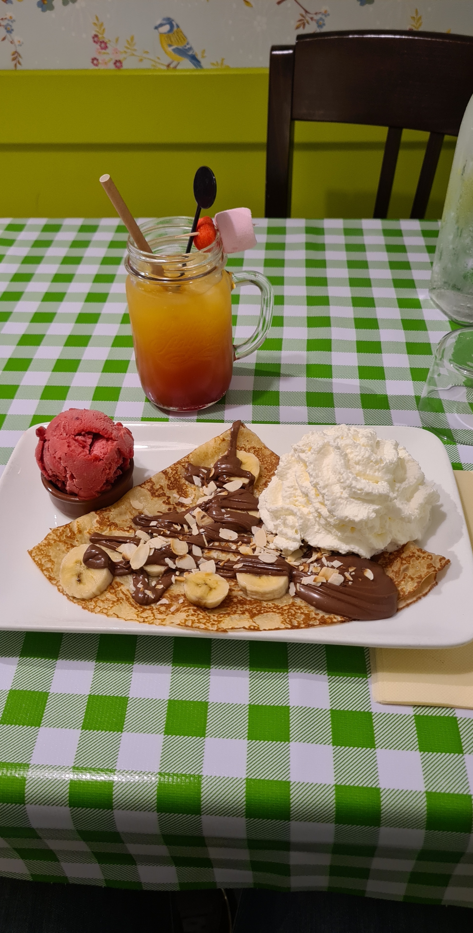 Très bon repos et surtout les crêpes desserts ( celle au Kinder est une tuerie). La déco est toujours originale je ne m'en lasse pas Il y a toujours des détails à découvrir. Service bien même si il a été un peu long. Je recommande