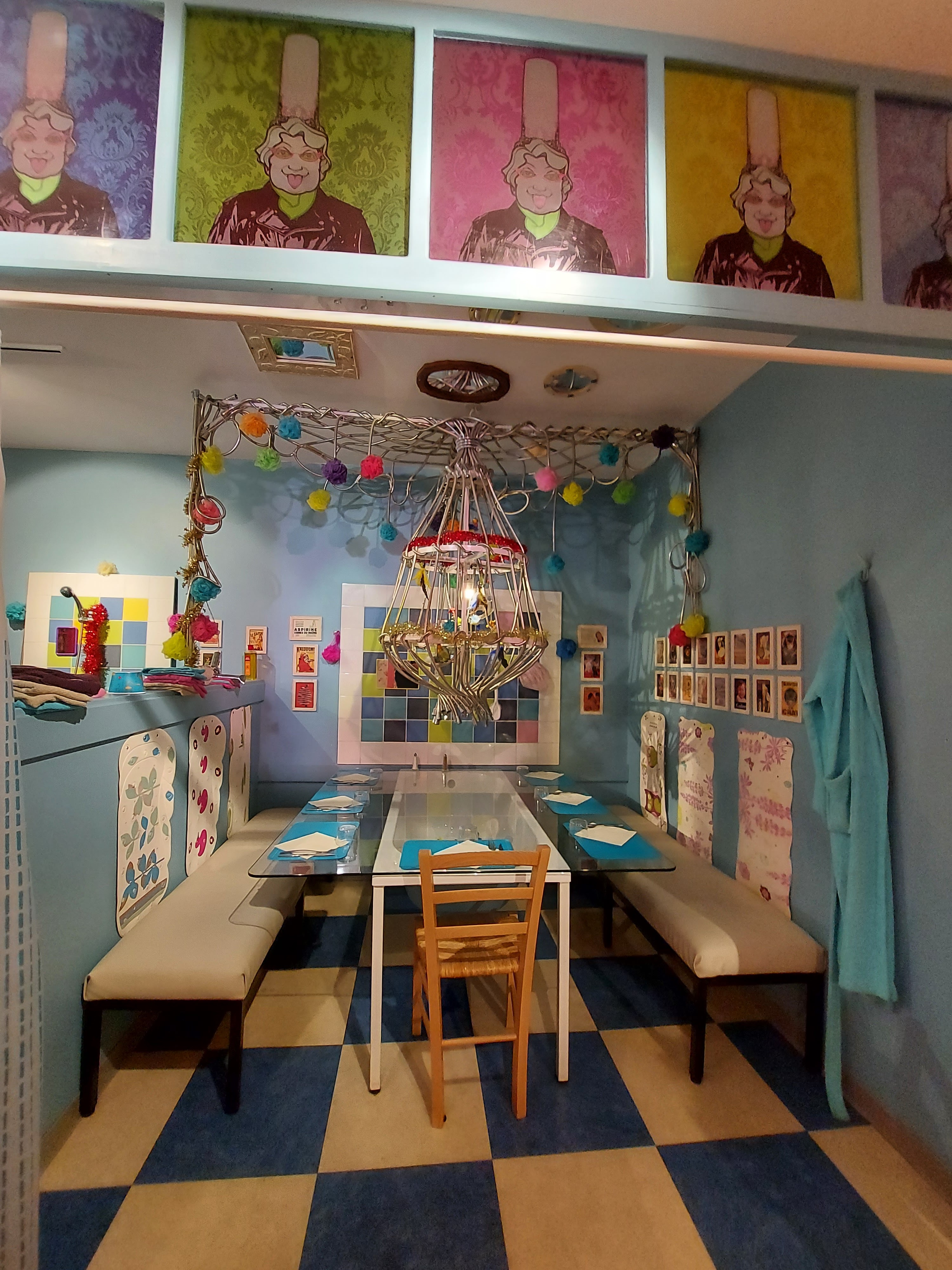 Nous avons eu la chance de manger dimanche midi. Nous étions installés sur une baignoire dans une salle de bain avec accessoires et déco au top. La carte des plats est originale, le choix est variés, les menus raisonnables. Les enfants ont eu des assiettes copieuses et en plus une animatrice était là pour les divertir avec maquillage et chasse aux trésors. Parfaitement adapté aux familles, je recommande ++++