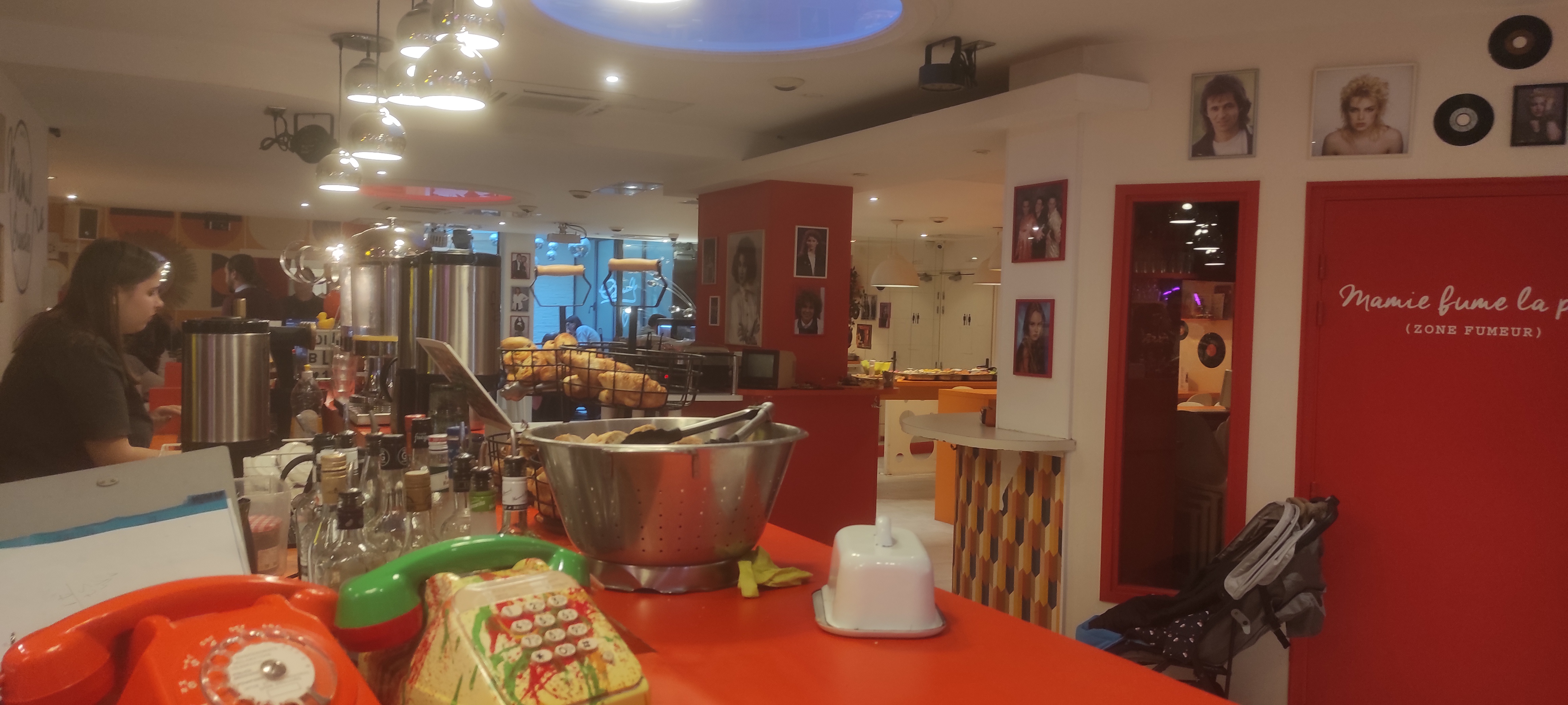 Deux ambiances : le matin/midi , possibilité de bruncher , repas très variés ,il y en a vraiment pour tout les gouts. Les plats restent rarement vide très longtemps. Sucré ou salé , il y a vraiment de tout ! Le soir : bar ambiance / boite de nuit. Ambiance année 80/90 , ou tout les ages se retrouvent pour danser. Fumoir disponible pour les vapoteurs et les fumeurs.