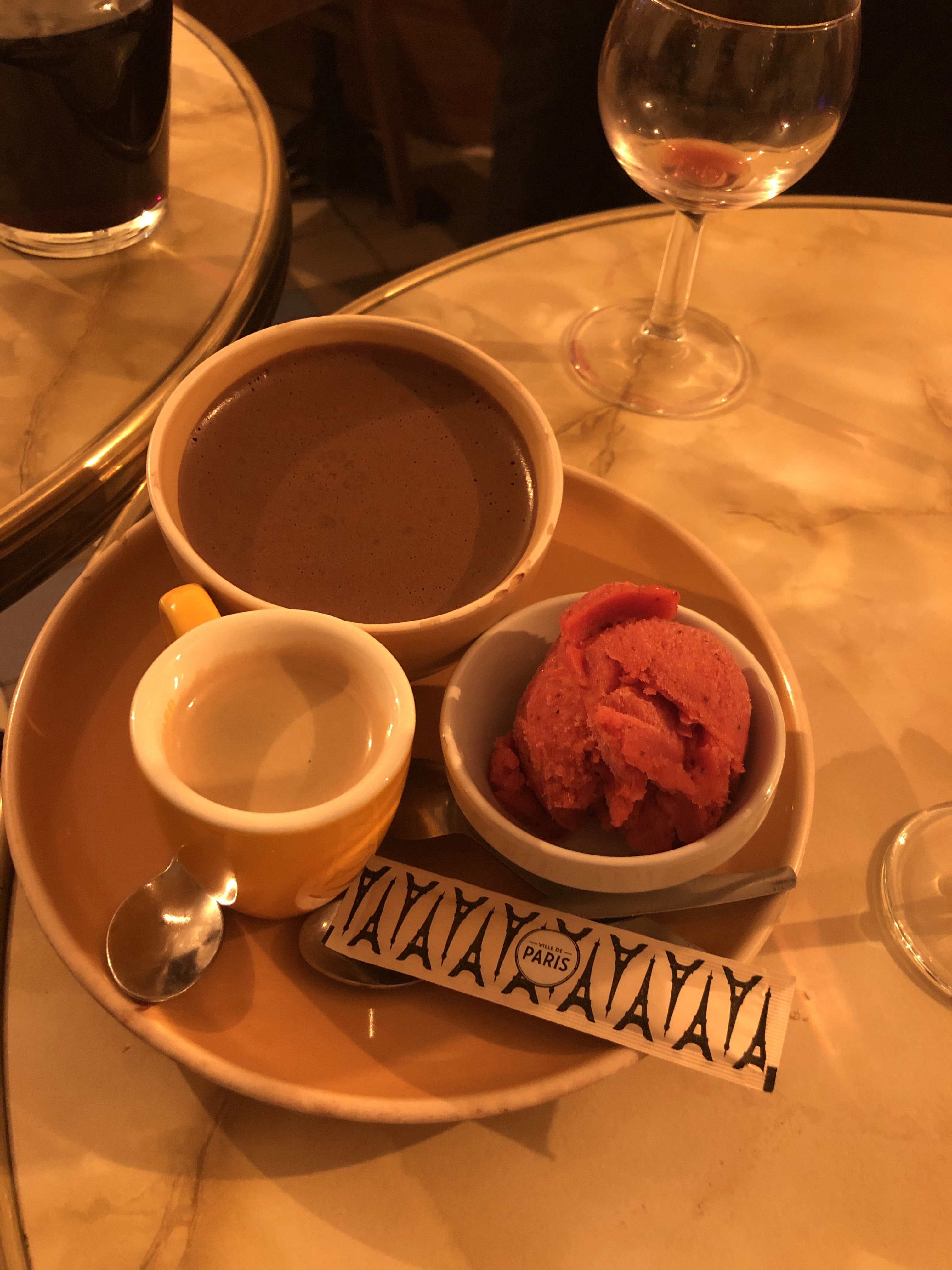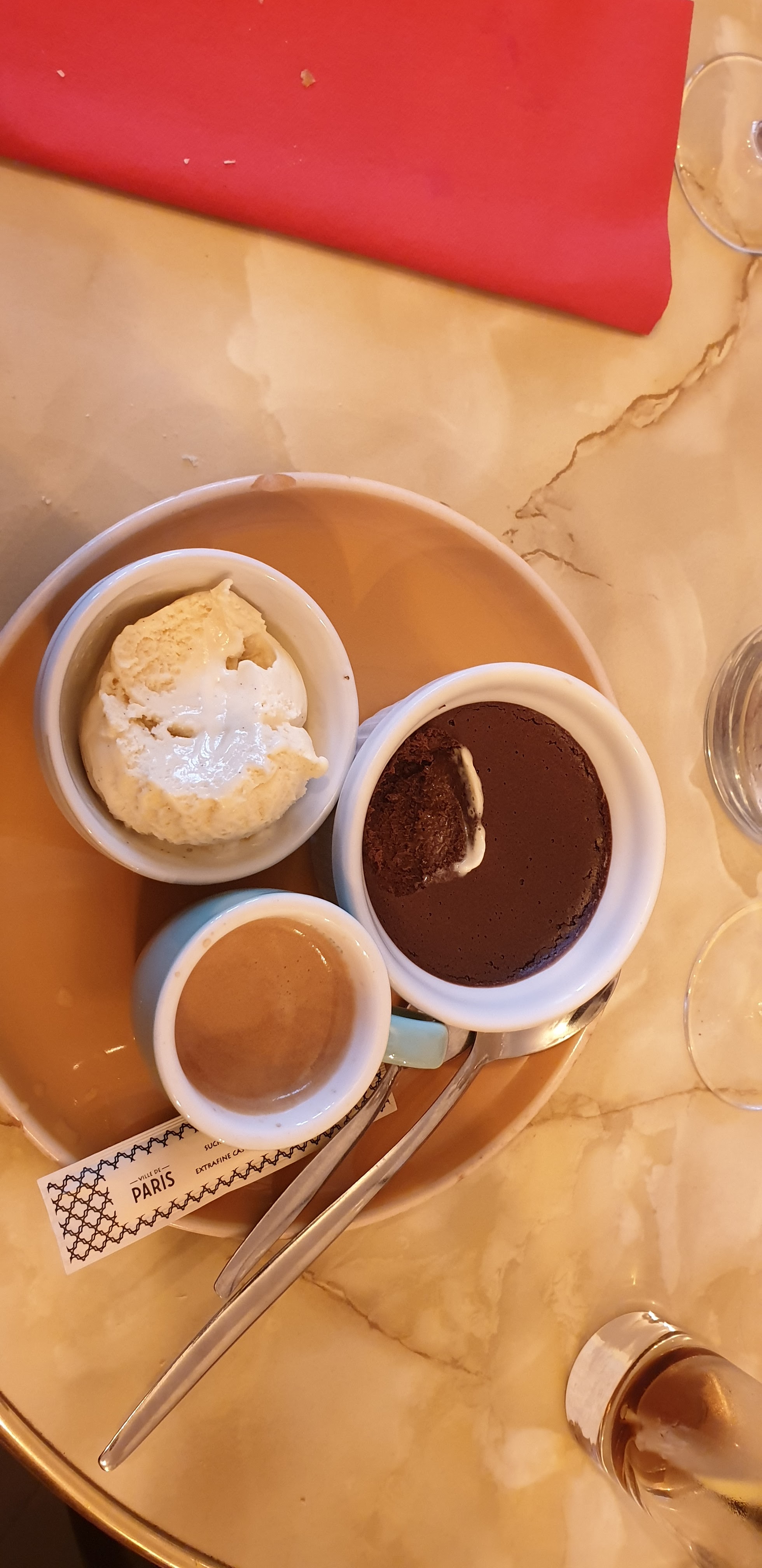 Mmmm, tout va bien. Si la soupe à l'oignon française commençait, c'était une version unique d'un classique mais très oignonnée et savoureuse. Ensuite, il y a eu le bœuf bourguignon, des pommes de terre au fromage et une salade d'accompagnement - tout va bien, délicieux. Ma femme a pris la salade César au poulet et était aux anges. Terminé avec le trio de glace au caramel salé, de mousse au chocolat et d'Expresso - OMG tout va bien. Le serveur était très joyeux et sympathique, comprenant notre français limité. Superbe trouvaille pour notre première nuit à Paris.