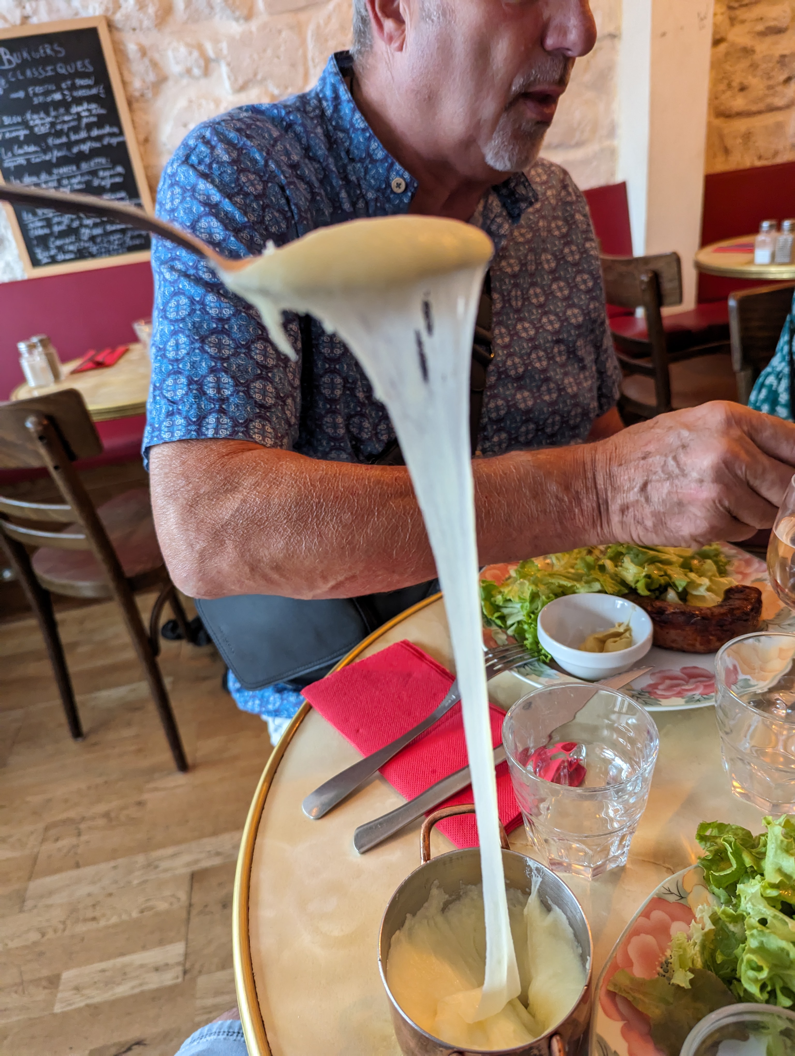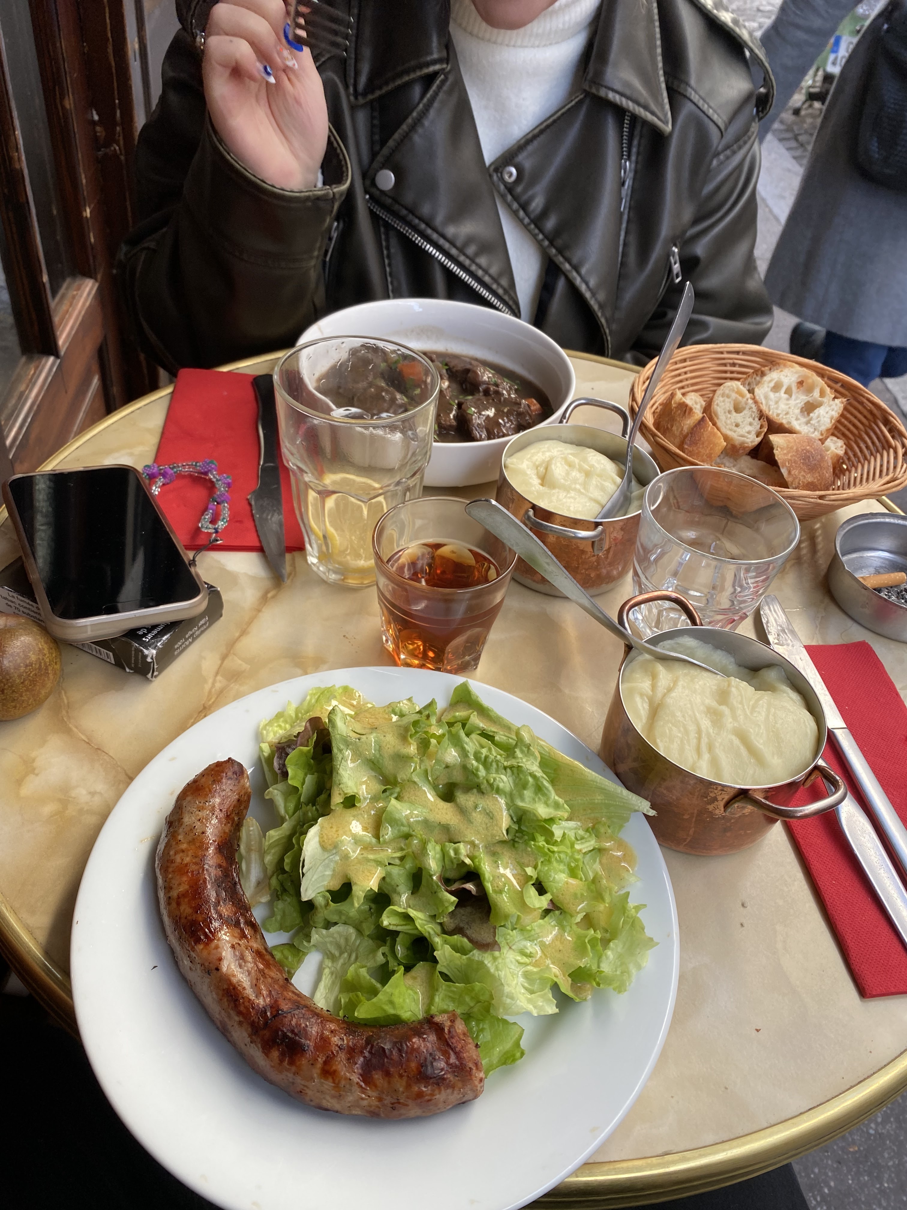 Le repas et le café parisien parfaits. Ayez certainement l'Aligot avec tout ce que vous commandez.