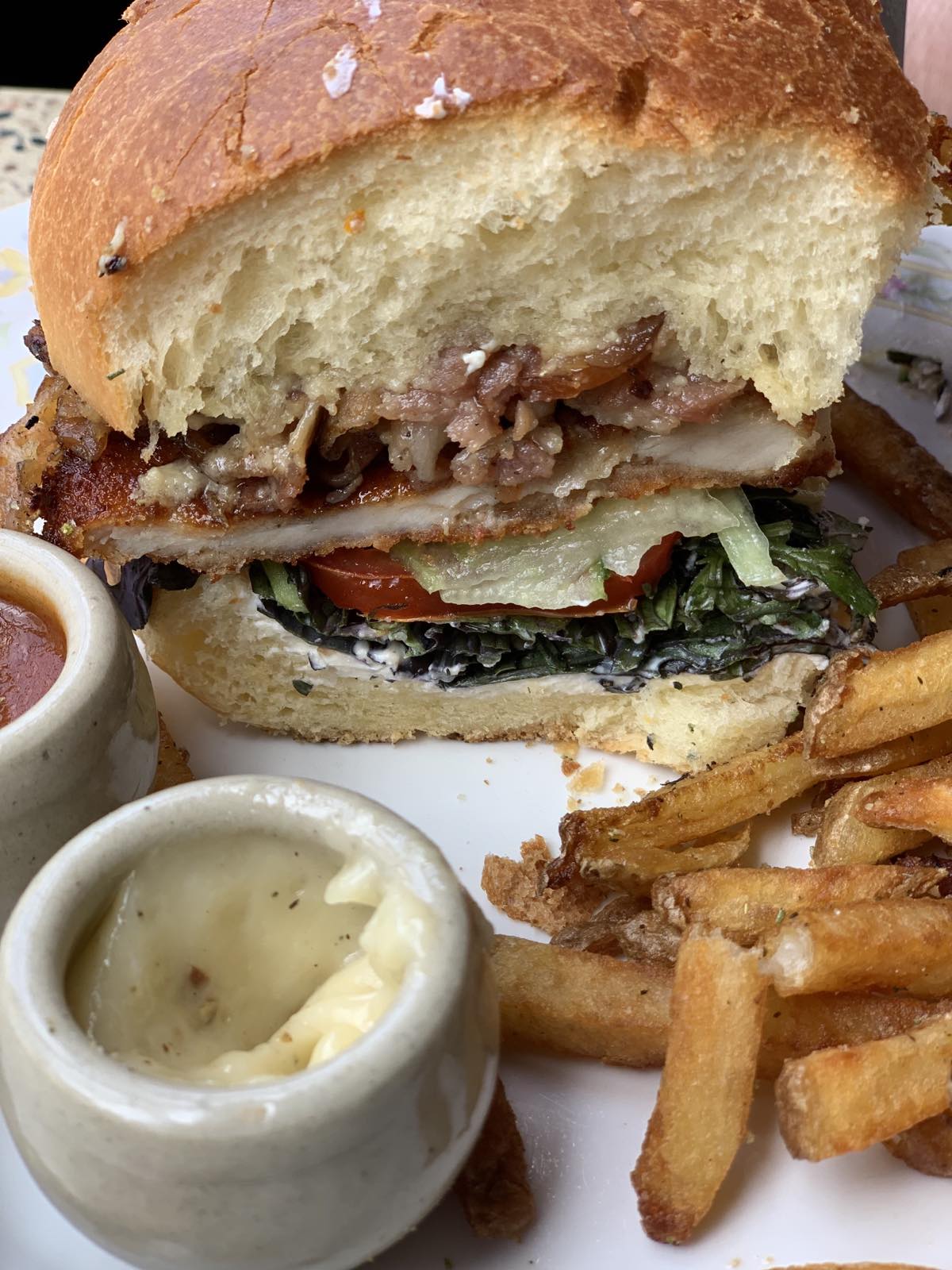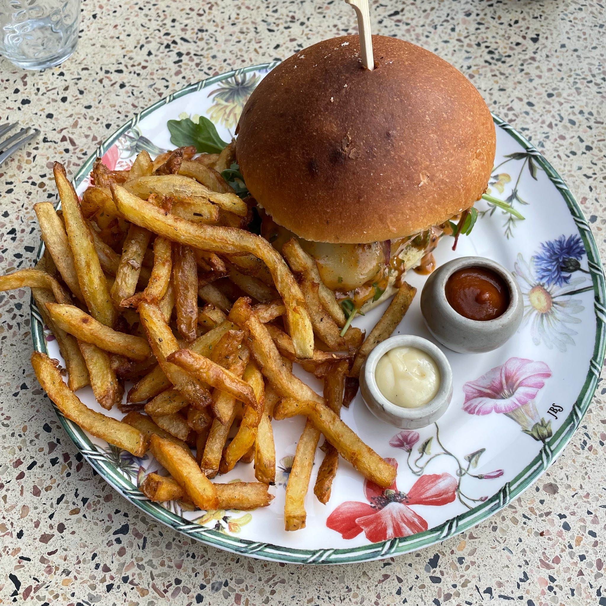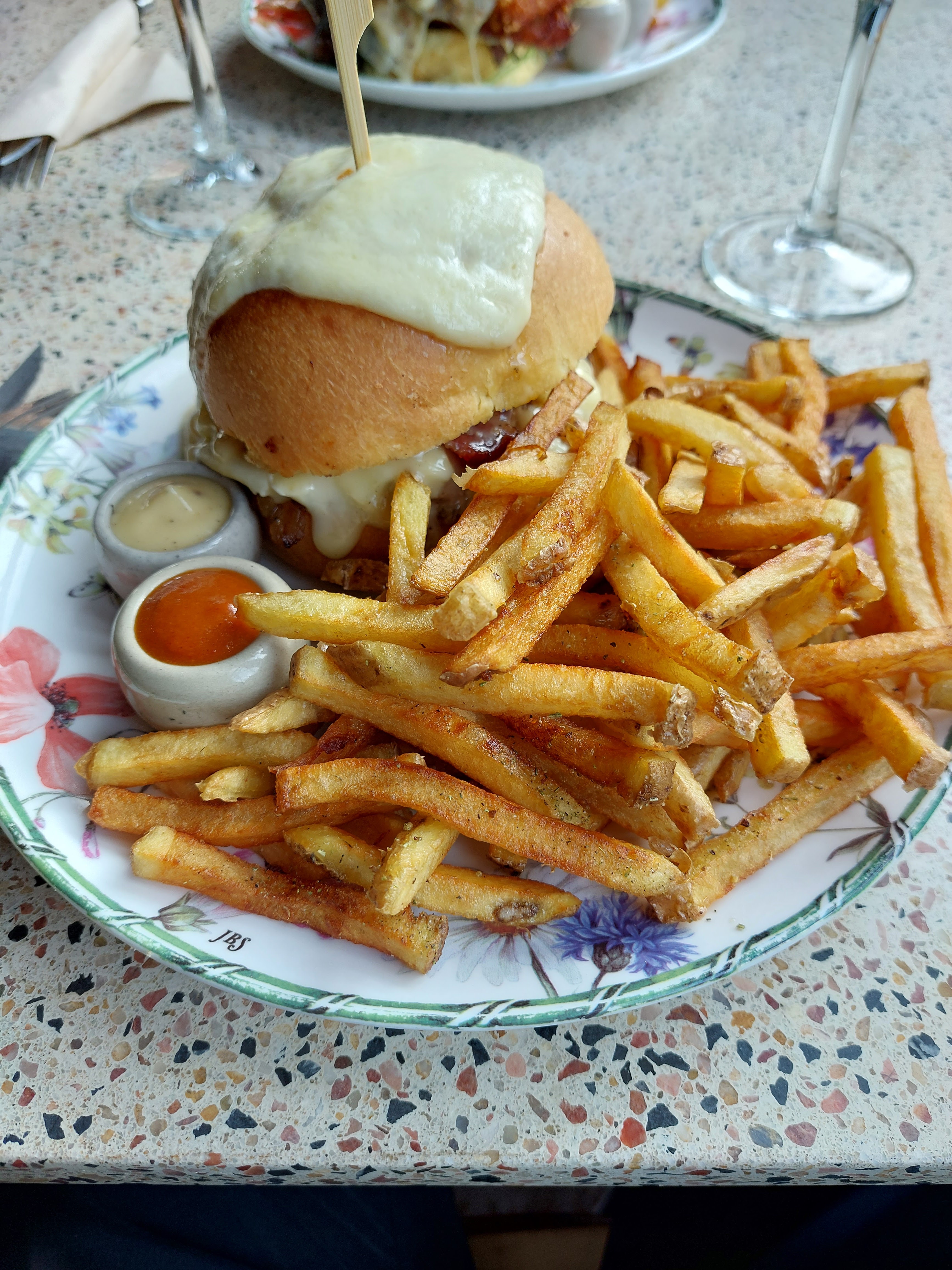 Buger Louise délicieux. Frites super bonnes également. Mayo et ketchup maison . Le thé glacé passion vanille un délice. Les desserts sont aussi super et copieux...