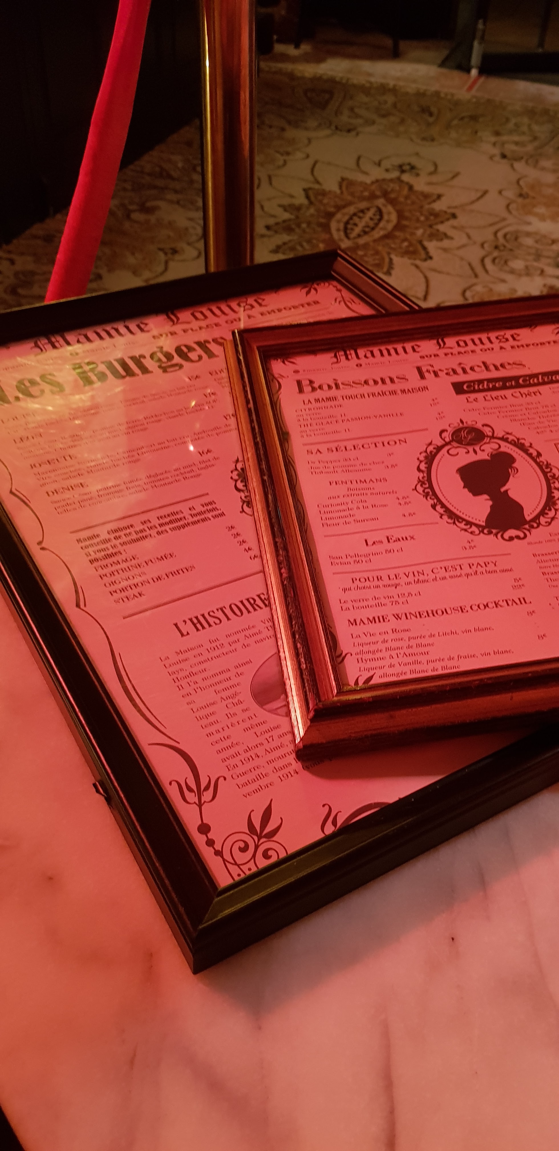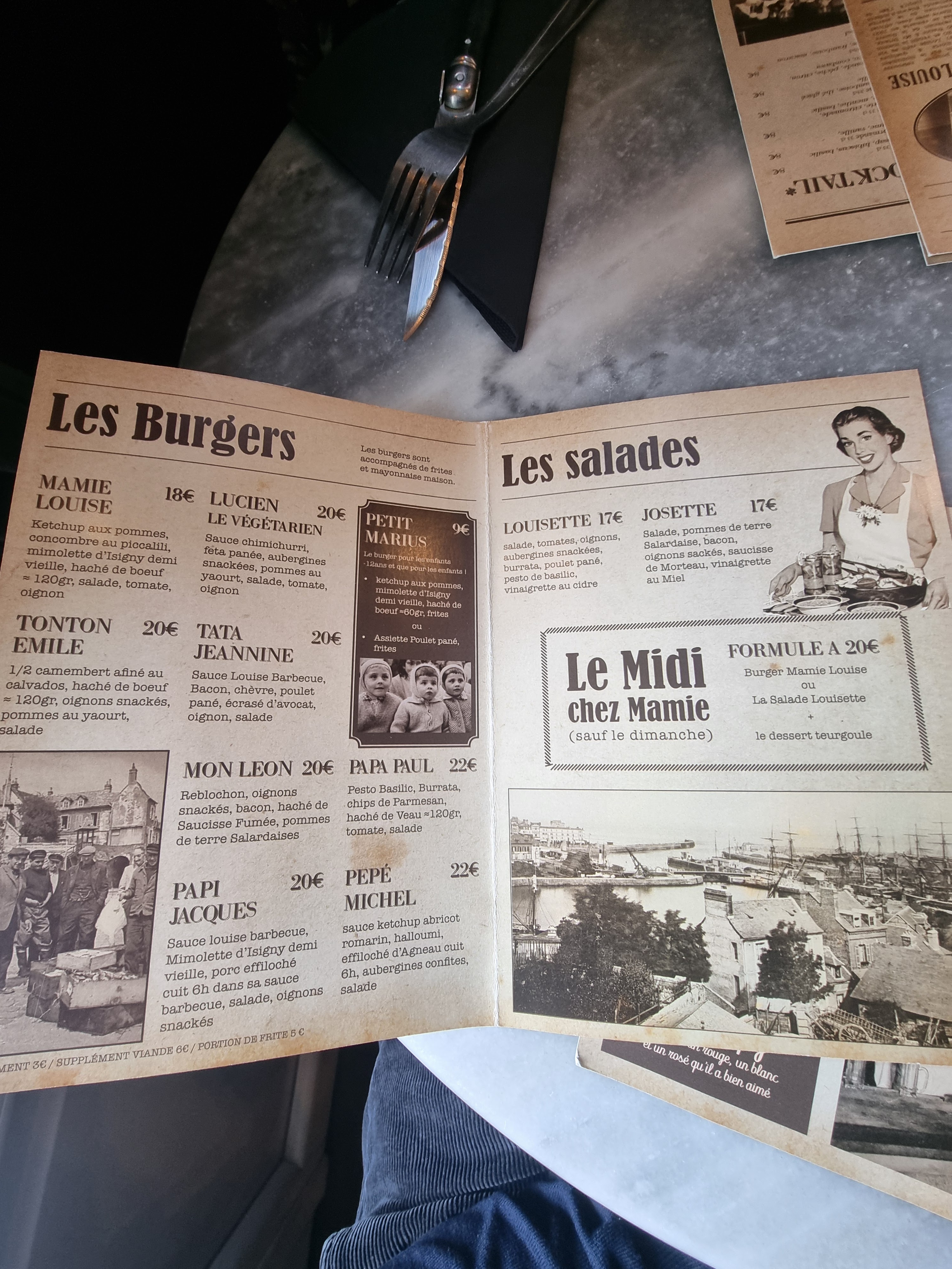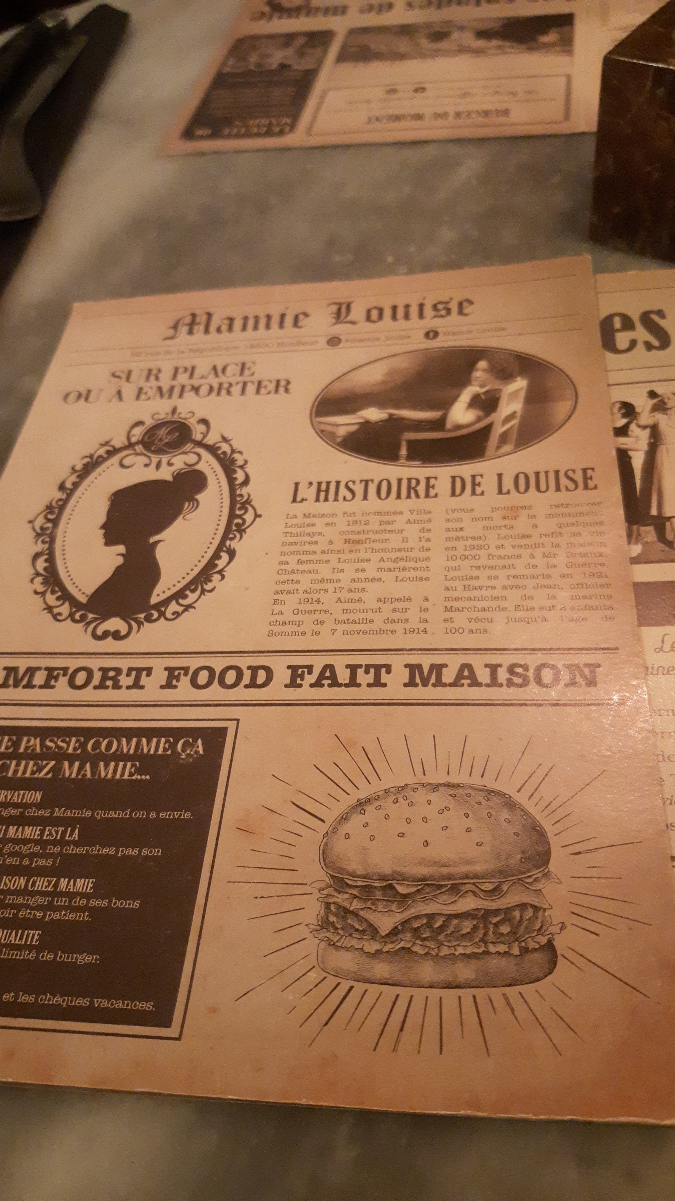 Très bonne adresse sur Honfleur. Un endroit qui nous coupe du temps et qui nous fait faire un bon dans l'ancien temps. Très chouette concept, musique oldschool, déco d'antan, histoire du lieu et de mamie Louise à découvrir sur la carte, cuisine maison de A à Z. Vous y trouverez une carte uniquement de Burger frites, il y a un Burger Végétarien, un au poulet, un au porc et les autres au bœuf, avec des fromages de la région (pont l'évêque entre autre et d'autres), Frites maison et sauce mayonnaise et genre de ketchup relevé maison également. Vous trouverez également à la carte du thé glacé maison, des bières, du vin et d'autres boissons. Il y a également des desserts maison (fondant au chocolat, cheescake, tiramisu oréo, mousse au chocolat ...). Menu enfant également à la carte. Décoration raffinée jusque dans les toilettes avec un piéton rouge / piéton vert pour vous indiquer si c'est occupé ou non. Possibilité de manger à l'extérieur aux beaux jours Carte et tickets restaurant non acceptés, peut être ma seule suggestion d'amélioration pour l'avenir. Bravo à toute l'équipe et aux cuisiniers et serveurs très aimables!