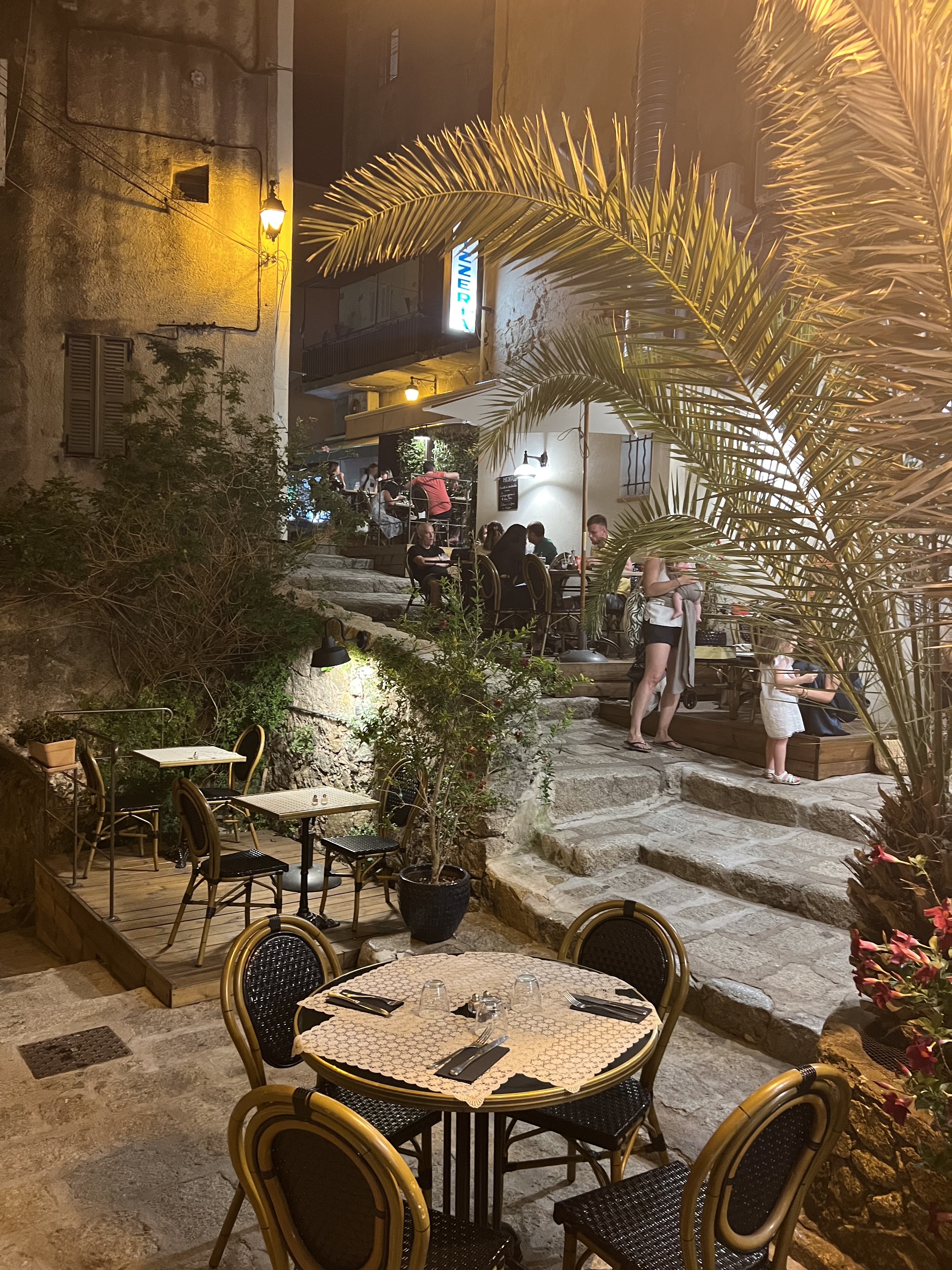 Avec sa terrasse en escaliers, son cadre romantique, on se croirait en Italie ou en Grèce, mais nous sommes bel et bien en Corse comme le rappellent l'excellente charcuterie, et l'accueil chaleureux des patrons. Pizze excellentes, rien que l'odeur du four raconte une histoire de Méditerranée, pas de doute je sais que je vais me régaler. Une erreur à la commande, sans que je sache si ça venait de moi ou pas, aucun souci, on me refait ma pizza avec le sourire et en s'excusant: vraiment le bon accueil. Merci à vous, nous avons passé une excellente soirée dans votre établissement !