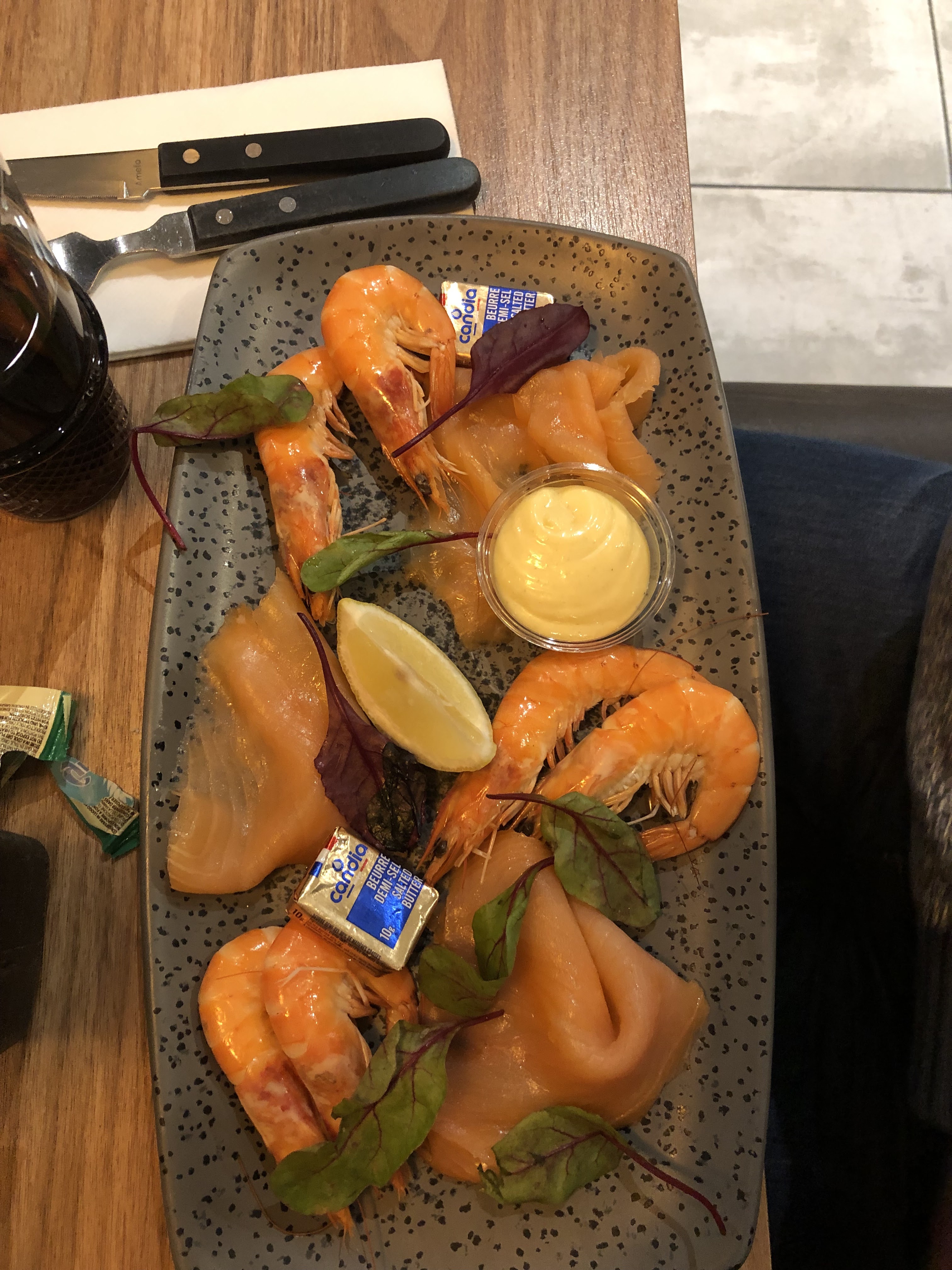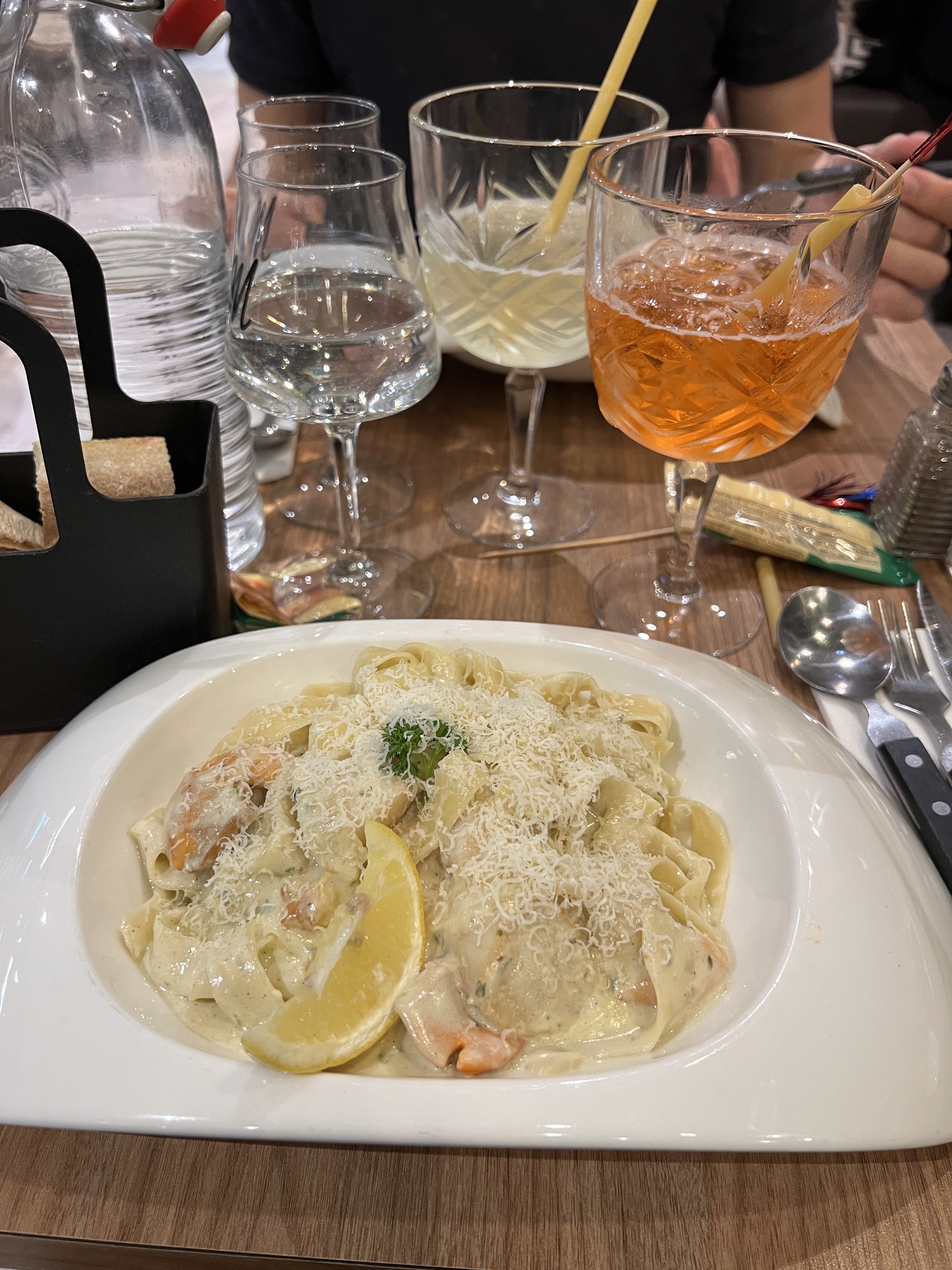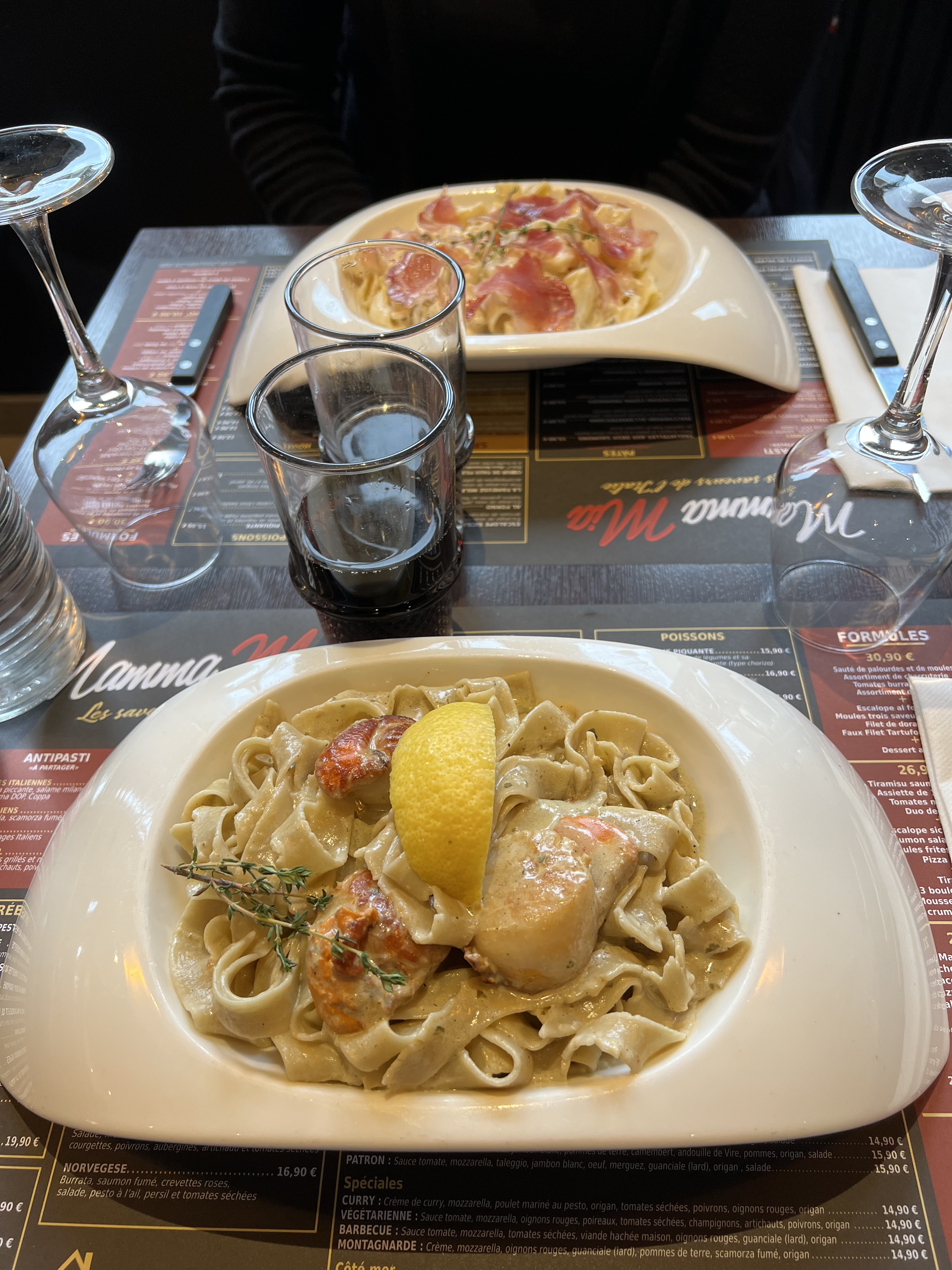 Assiette copieuse! Soda en cannette, le plat était bon mais pas très raffiné, trop gras à mon goût dommage les produits on l’air de qualité. Très chère pour une assiette de pâtes. (41€ pour 2 avec plat et boisson)
