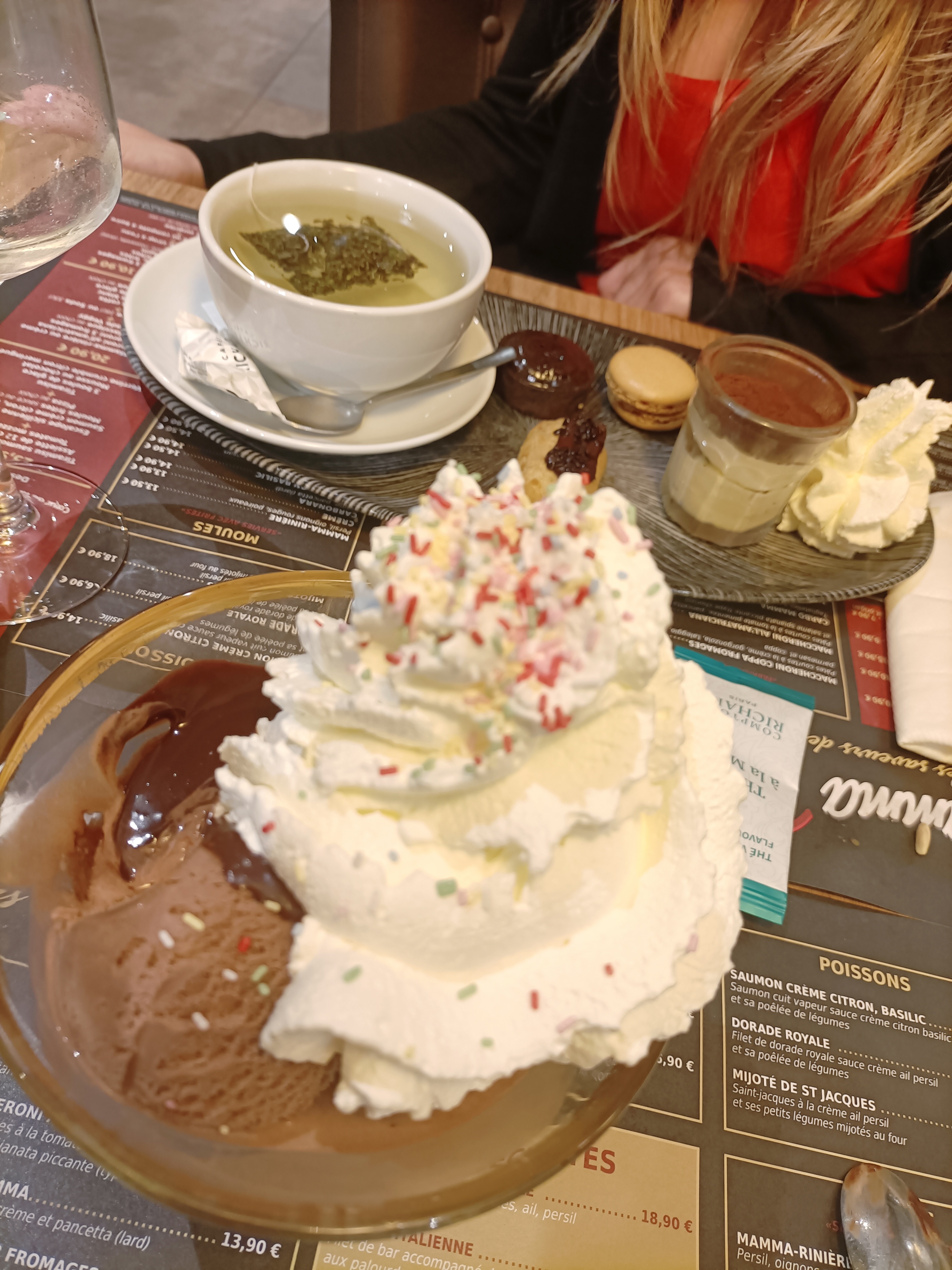 Nous avons pris des moules pas assez nettoyer car elle croquait un peu et le thé gourmand la mousse manquait d onctuosité sinon le cadre es très sympa et spacieux
