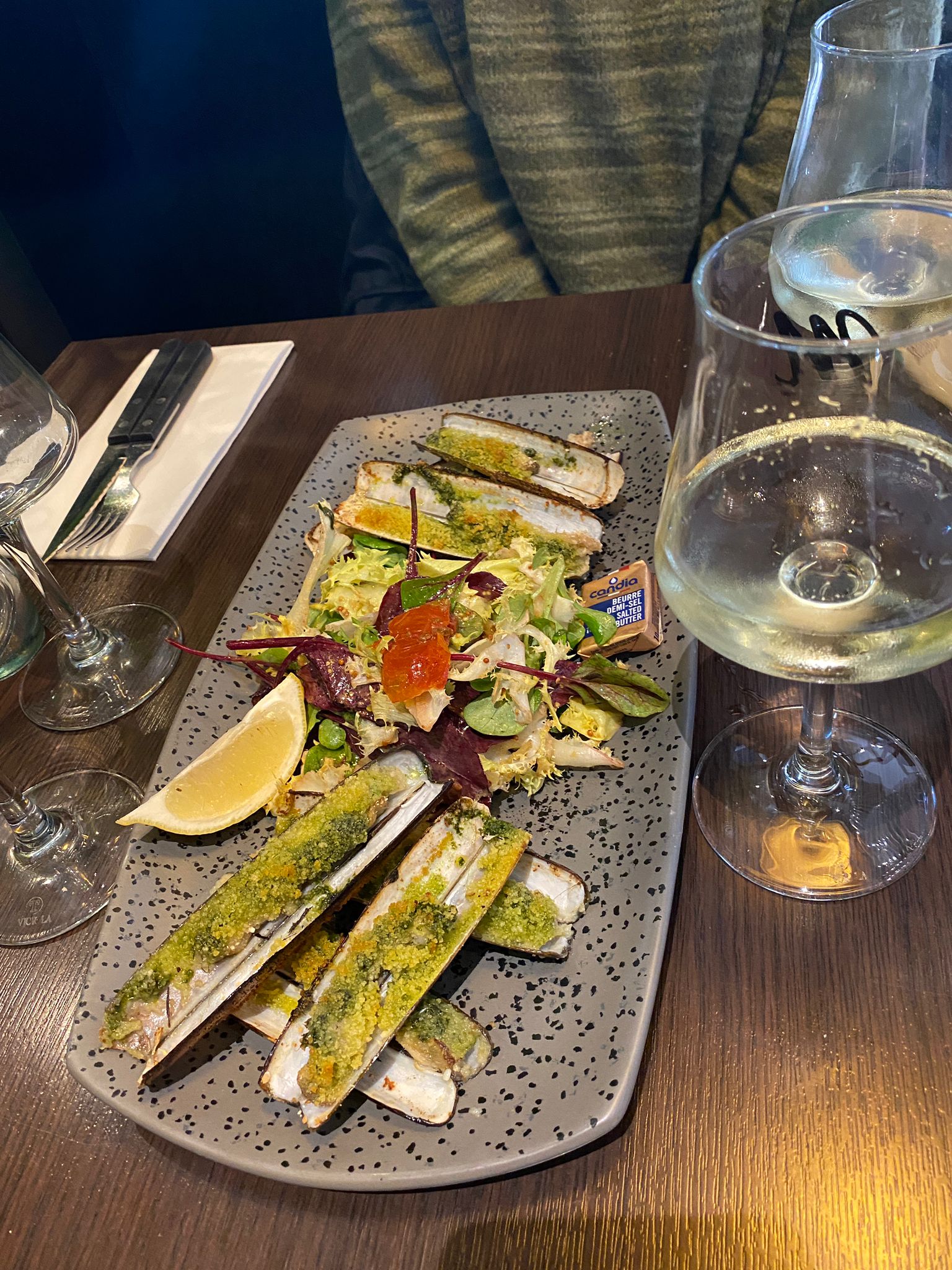 Décevant ! On ne pensait pas autant en voyant les commentaires précédents. On a commencé par une planche mix fromage/charcuterie. La charcuterie était vraiment grossière et grasse. Cela manquait un peu de finesse y compris dans le choix des pièces. Le fromage, pas top. On a poursuivi par des moules à la crème accompagnées de frites. Les moules, assez insipides, nous ont pesé sur l'estomac a posteriori. Elles étaient servies avec une cuillère de crème fraiche négligemment posée dessus. Peut mieux faire... Et des frites sans saveur que l'on mange sans plaisir. Seul point positif : le service qui reste aimable.