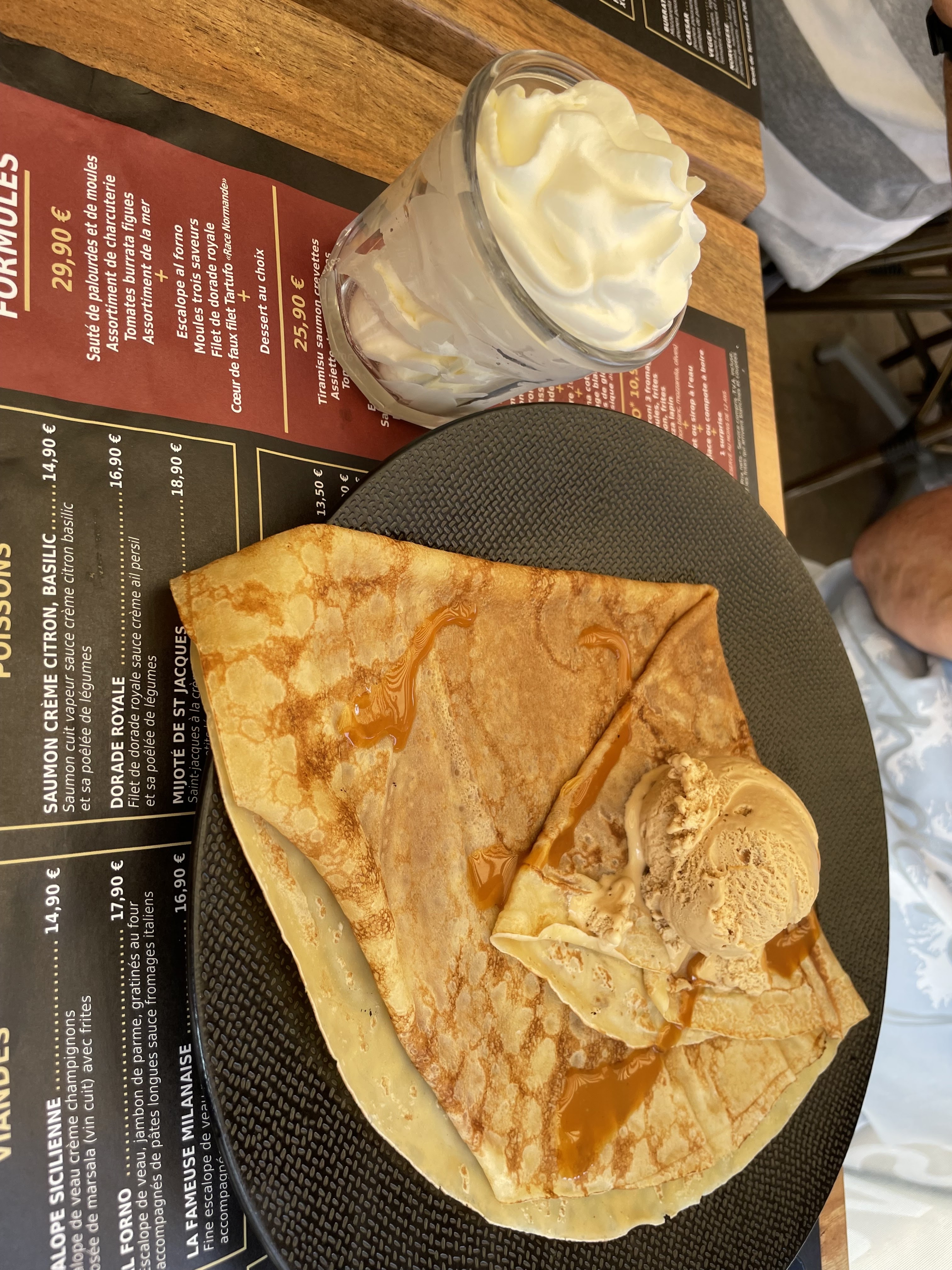 Restaurant situé dans une rue piétonnisée non loin de la plage, le cadre est magnifique. On a pu bénéficier d’un dîner en terrasse sans fumeureuses (le beurre et l’argent du beurre), donc on a passé une agréable soirée. Malgré le beau soleil en journée, le temps s’est rafraichi, mais nous avons pu bénéficier de plaid, un plus appréciable. Sur les détails qui m’importent le plus (et qui ne parlent peut-être pas à tout le monde), l’Orangina est servi en 33cl (royal ! 😎), la pizza était plutôt bonne (bonne pâte mais choix des fromages peut-être pas de mes favoris sur une 4 fromage) et mes convives me disent que j’aurais pu m’aventurer sur des pâtes, vu qu’elles étaient bonnes (je suis très exigent sur ces dernières). Côté dessert, une bonne et une mauvaise surprise : côté mauvaise surprise, les glaces sont des Côte d’Or, malheureusement pour moi je n’aime pas vraiment cette marque. Le coulis était un peu léger et ce n’était pas ma recette favorite de crème fouettée non plus (dommage, les portions sont généreuses). Côte bonne surprise, la crêpe était étonnamment bonne, je ne m’attendais pas à si bon dans un resto qui n’est pas une crêperie. Les recettes sont originales et nombreuses. Pour ne rien gâcher le personnel et sympathique, on sent une bonne ambiance dans l’équipe ce qui fait plaisir, après difficile de vraiment juger de la rapidité de service vu l’affluence, avec par moment une file d’attente à l’entrée bloquant presque le carrefour.