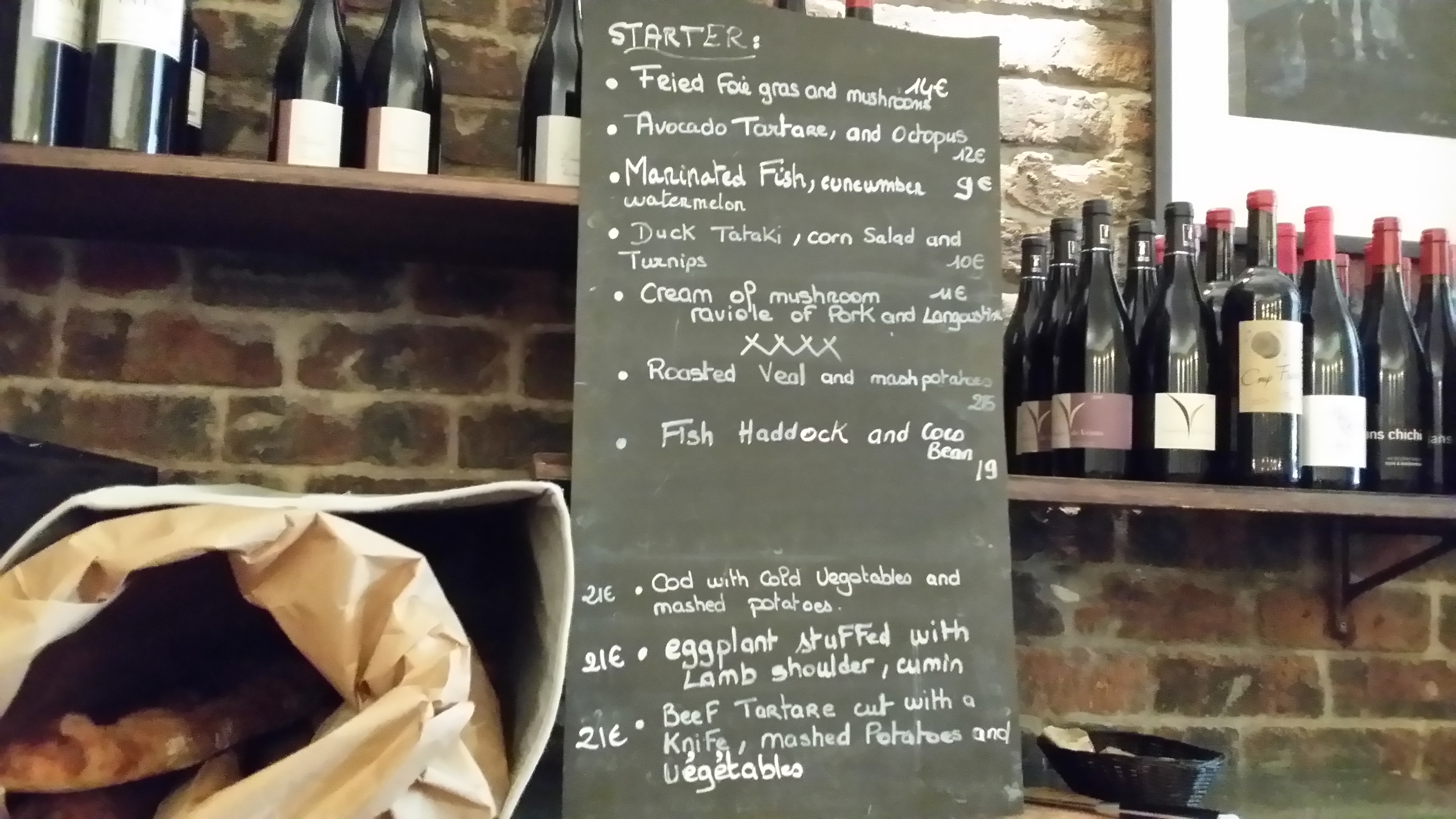 Mieux qu’un bar à vins, à mon humble avis ! Une jolie carte de mets frais. Entrée autour de 12€. Plat principal autour de 25€. Service efficace et énergique. Réservation’ quasi obligatoire de la veille au lendemain pour un déjeuner en semaine.