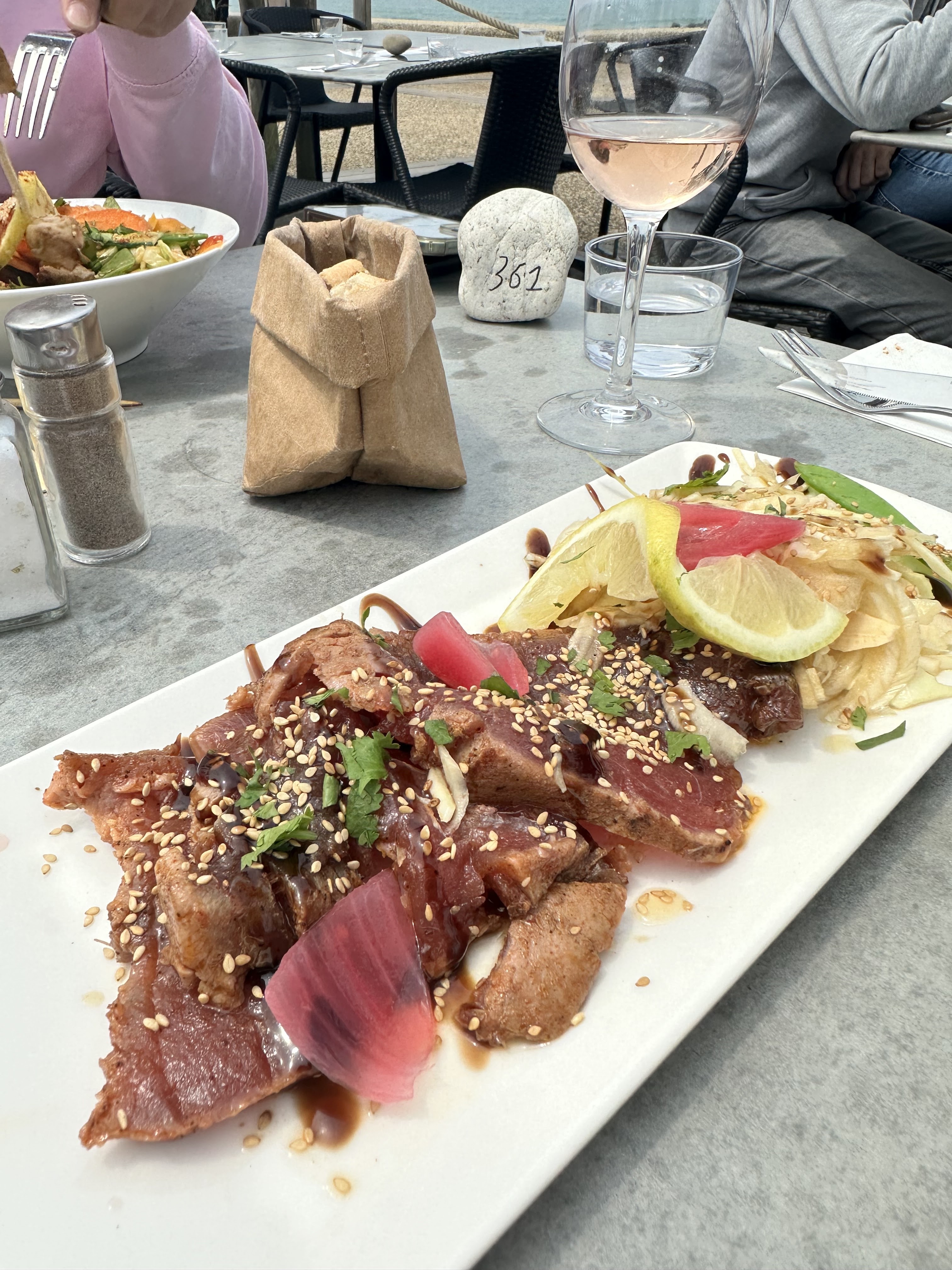 Chouette déjeuner en famille, en terrasse, face à l’océan. Le spot est super! Nous avons mangé une salade César, un pad thaï et un fish and chips pour notre fille. Qualité et quantité était au rendez-vous. Service plutôt rapide malgré un nombre de clients important. Nous reviendrons que ce soit pour un verre, un café, un déjeuner.