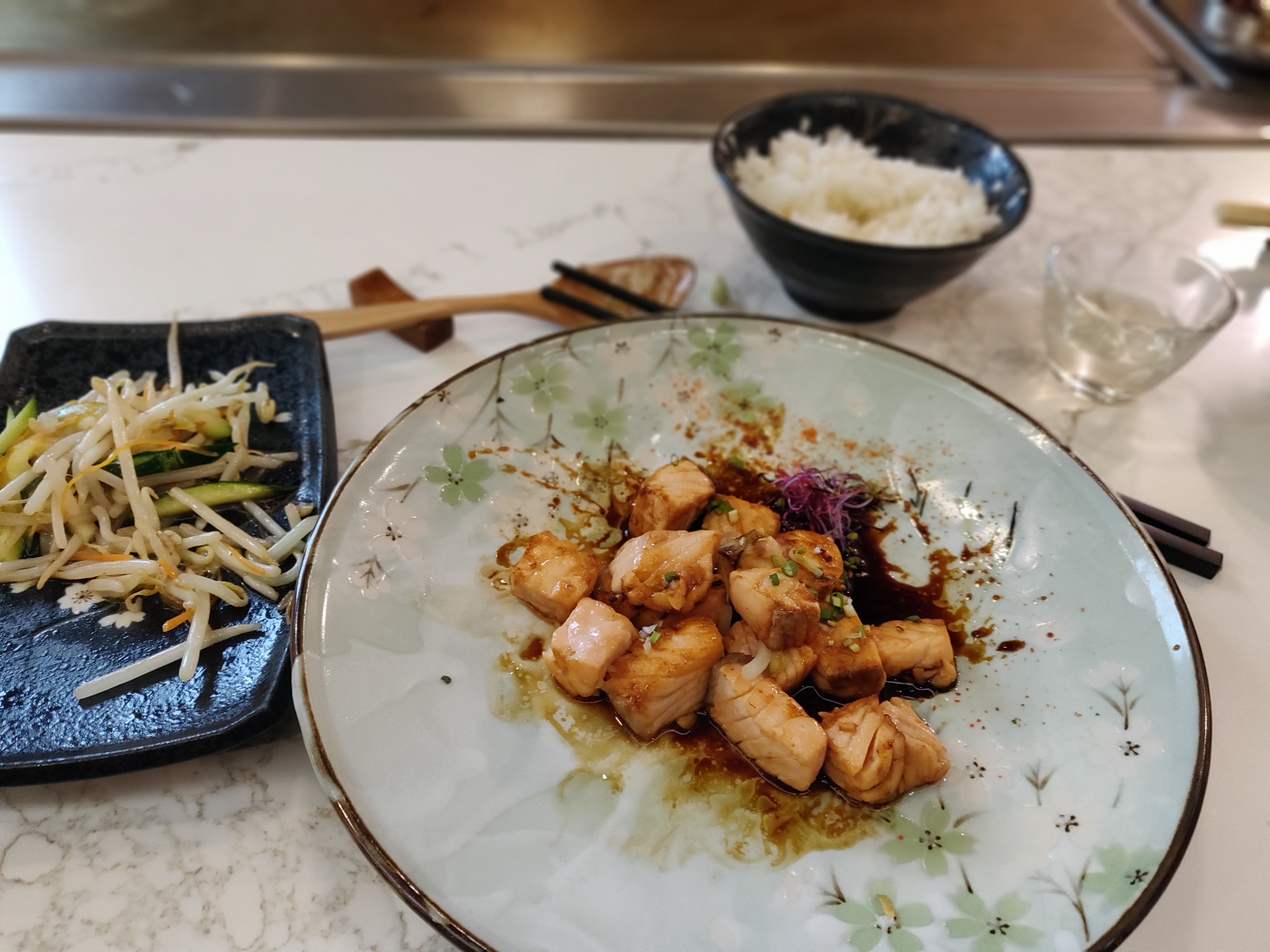 Face à la cheffe officiant sur son tepanyaki, nous nous sommes régalé d'un dîner de poisson et bœuf parfaitement cuits et assaisonnés. Simplicité et bon goût sont les maître-mots de ce restaurant .