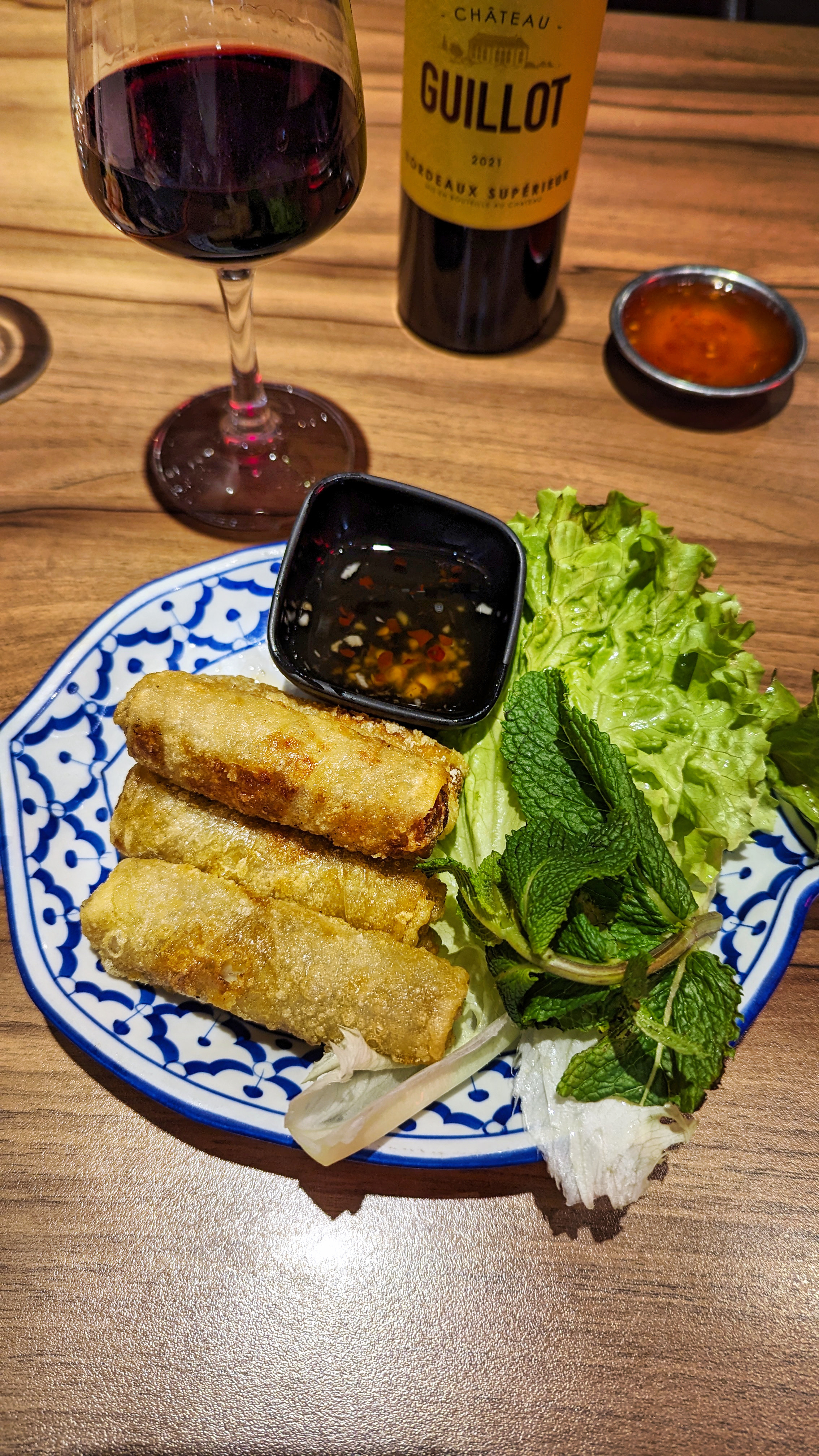 Crevettes ayant un gout de congelés, sûrement du a un mauvais emballage. Je suis tombée malade après y avoir mangé, je l'ai tout de meme signifié a la serveuse qui n'en avait que faire. Les nems etaient froids, en bref, passez votre chemin.