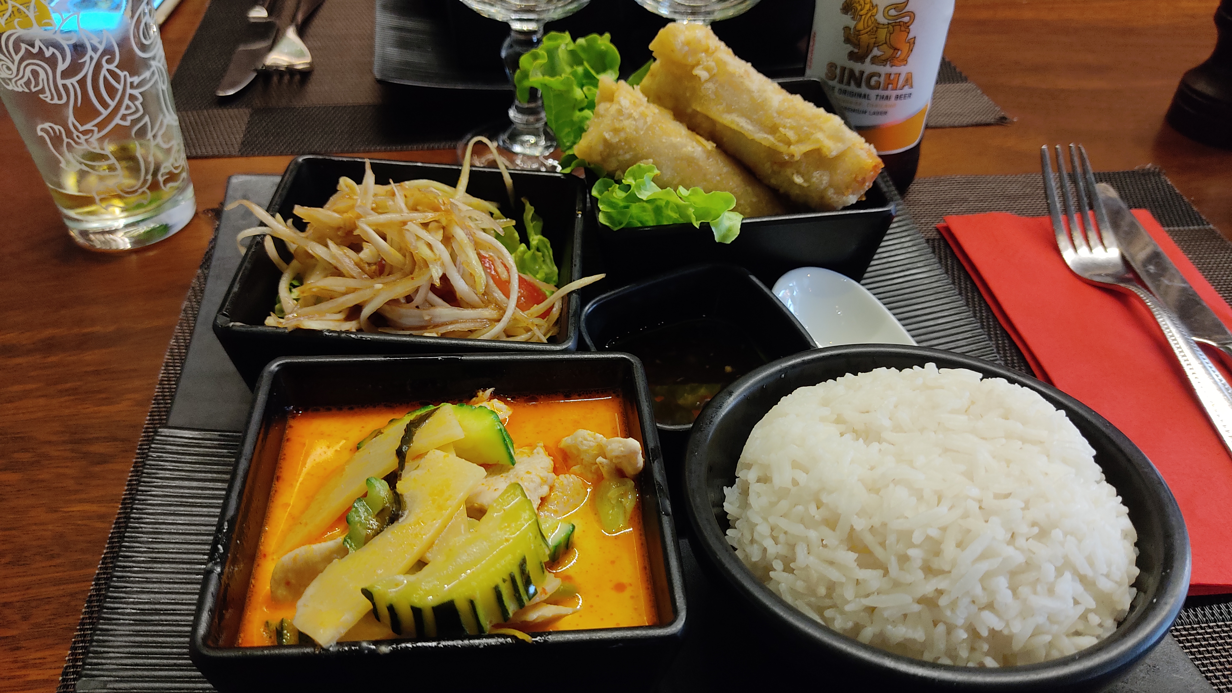 Poulet au curry et coco très bon, légumes sautés aussi, service correcte pas de soucis de ce côté, prix raisonnable et surtout embiance et décoration très agréable, je recommande ☺️