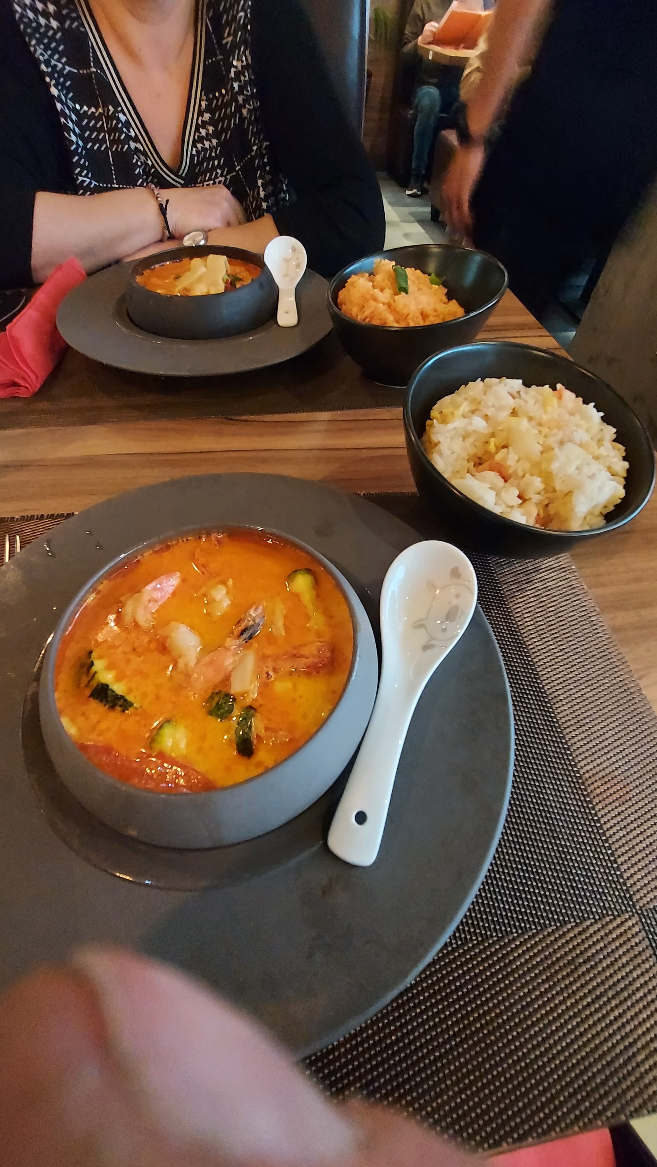 Une déception, tout avait bien commencé pourtant. A voir maintenant les autres avis, nous ne sommes pas tombés sur un mauvais jour, le service est vraiment à revoir. Mon conjoint a été servi assez rapidement mais nous avons attendu au moins 15mn avant que mon plat arrive. Si on va au restaurant, c’est pour manger ensemble et non en décalé... Au niveau des plats, le poulet à la crème de coco était bon mais c’est tout. Mon conjoint a pris le riz sauté aux crevettes, crevettes douteuses baignées dans la sauce et en plus il n’y en n’avait que 5. Les nems au poulet, pas trop de goût. Au final, nous sommes partis payer en caisse sans même qu’un serveur nous demande si on veut un dessert.