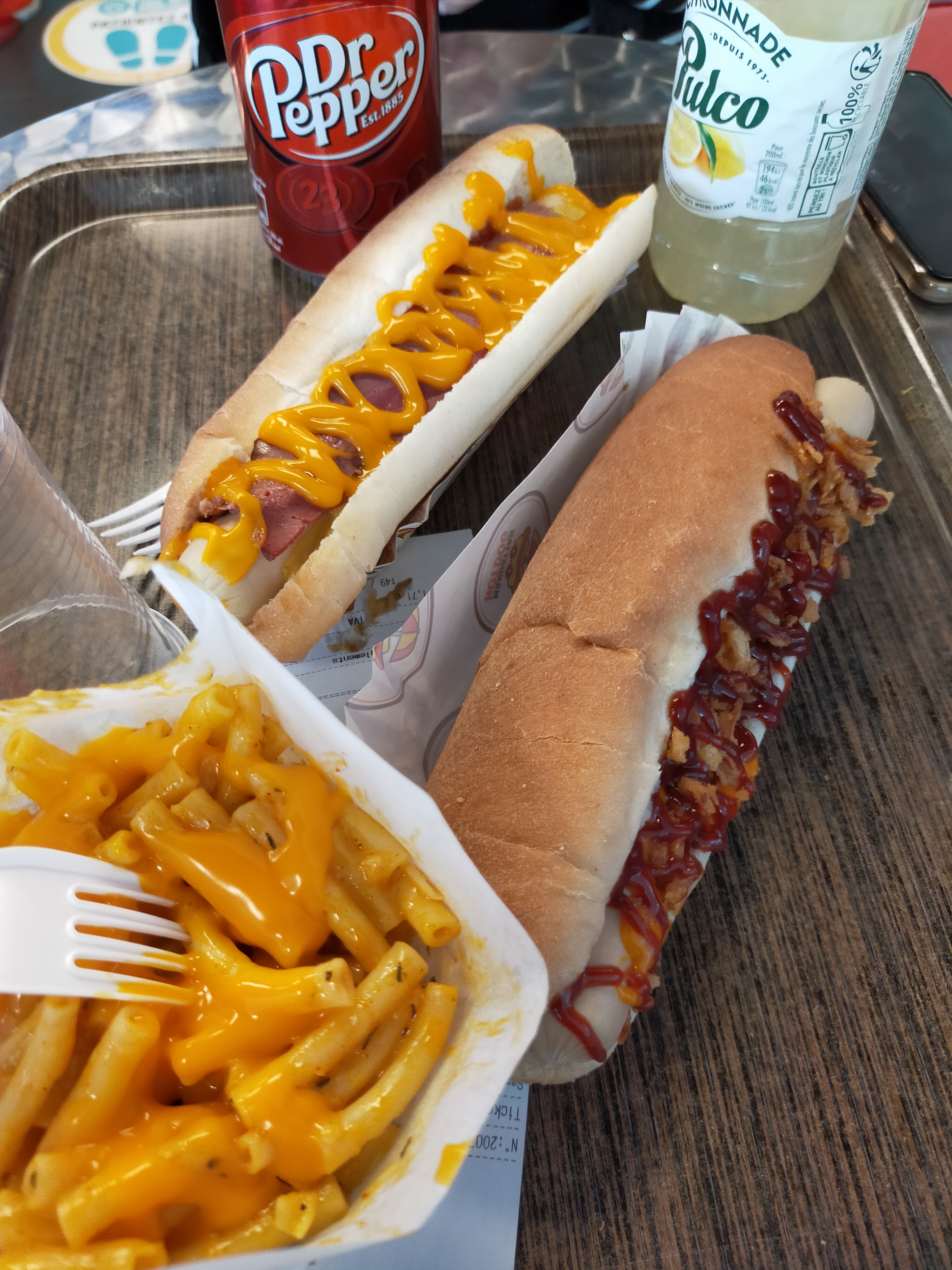 On a pris un hot dog et un burger, ingrédients de mauvaise qualité tout simplement, steak haché congelé, sauce de mauvaise qualité, mac and cheese fait avec du cheddar industriel de mauvaise qualité, passer votre chemin déception totale
