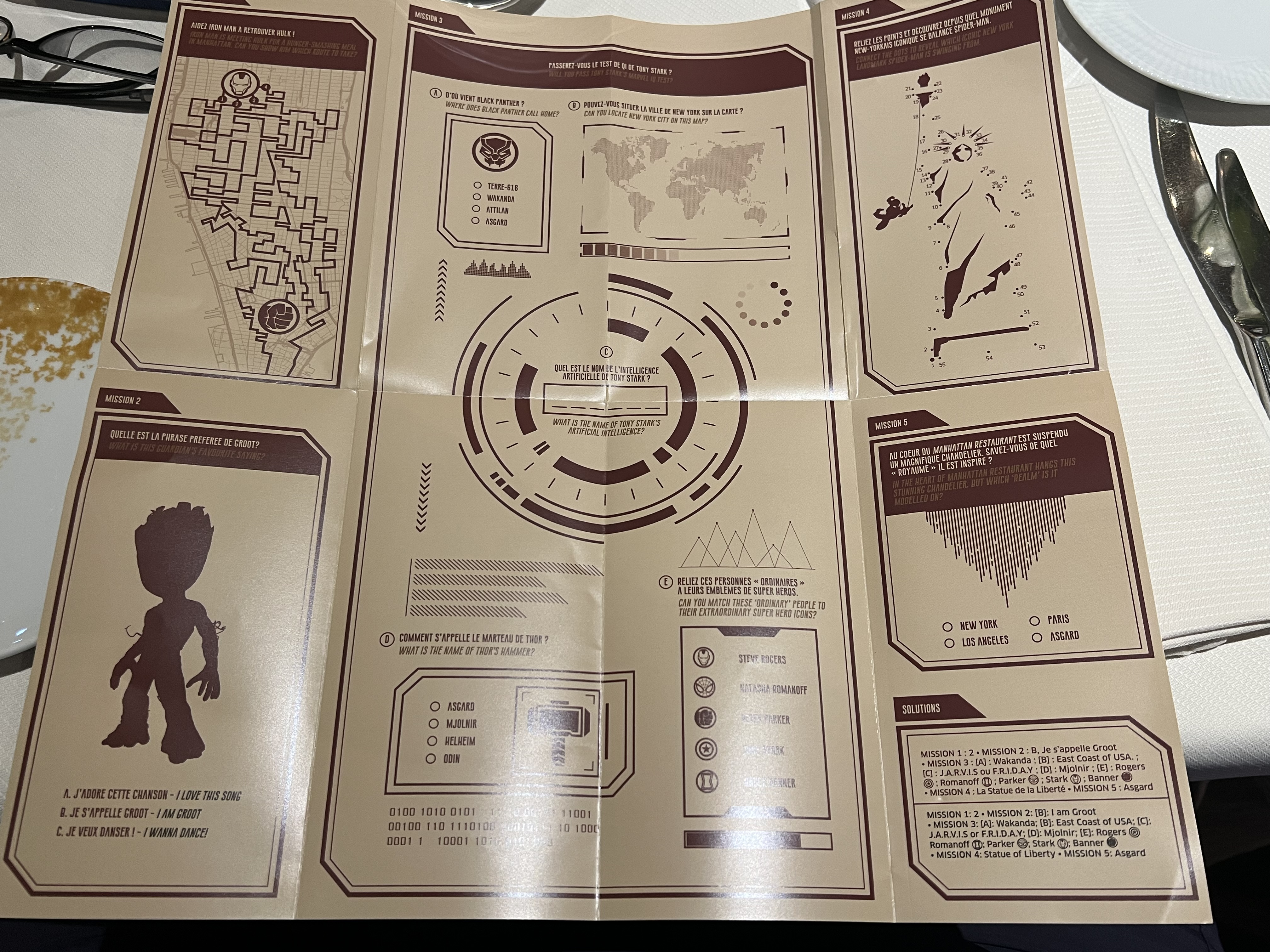 L’hôtel Marvel est parfait. Suite aux avis sur le restaurant, j’ai réservé celui-ci. J’avoue que je reste un peu dubitative. Je ne pense pas être quelqu’un de très difficile. Mais j’aime la bonne cuisine, et bien faite. Je dois avouer que je suis déçue du repas. J’ai trouvé celui-ci assez gras. L’entrée choisie était bonne, mais le plat, que ce soit le mien ou celui des deux autres convives, n’ont pas été très apprécié. Concernant le dessert, moi qui suis très gourmande, j’ai été très très déçu. Je ne pense pas que ça vaille le prix. Un restaurant à ce prix, se doit d’être un peu meilleur ou de qualité un peu plus supérieur. Même à Disney ! Je tiens tout de même à souligner que le personnel était très agréable, et bienveillant. C’est pourquoi je mets trois étoiles, sinon sincèrement, je n’aurais mis qu’une voix deux étoiles maximum. Je m’attendais à une cuisine plus fine.