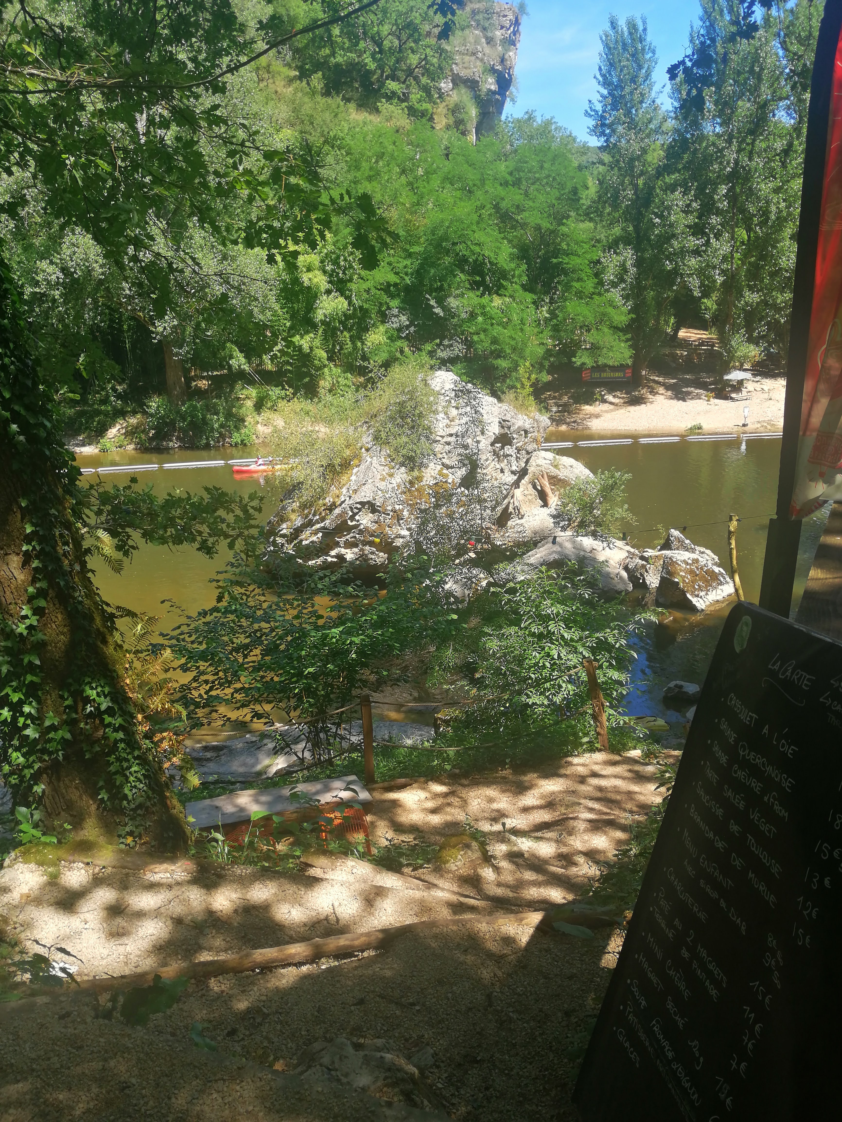Voyage et dépaysement.... Instant suspendu.... Comment présenter une référence ? Un incontournable ? Une place où il faut aller ? Pour l'ambiance, le cadre (rappel : une guinguette aux lampions multicolores, un pied dans l'Aveyron d'un côté, tandis que l'autre reste agrippé à la falaise), le service, la rapidité et le rapport qualité quantité prix des assiettes proposées? Bref, ne manquez pas ce café de la pierre au milieu 😉 si vous vous perdez dans ce méandre de l'aveyron (c'est comme ça que je l'ai découvert la 1ere année).... Attention, pas de parking! On se gare comme on peut entre la falaise, la route et le ravin (mais on y arrive toujours)